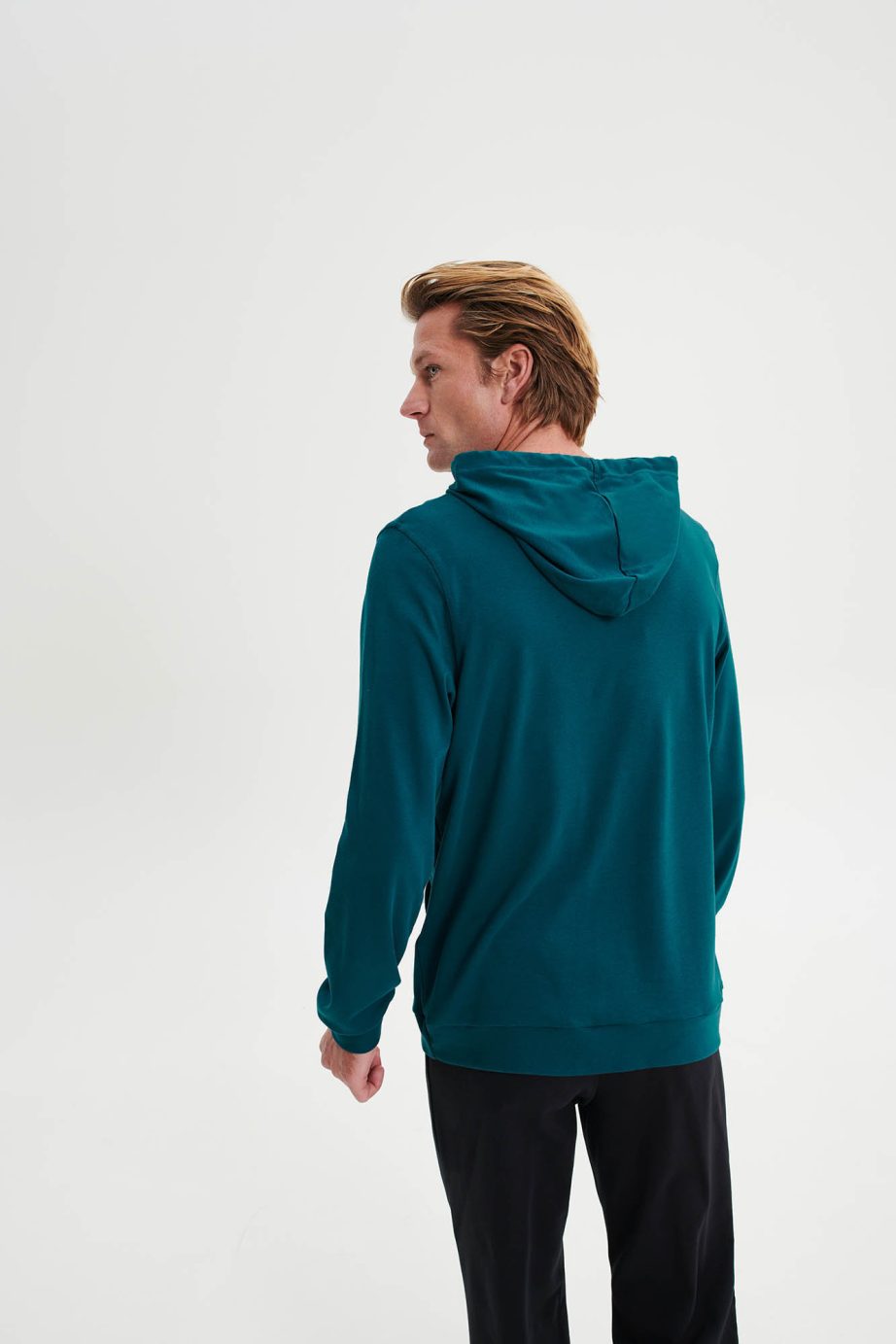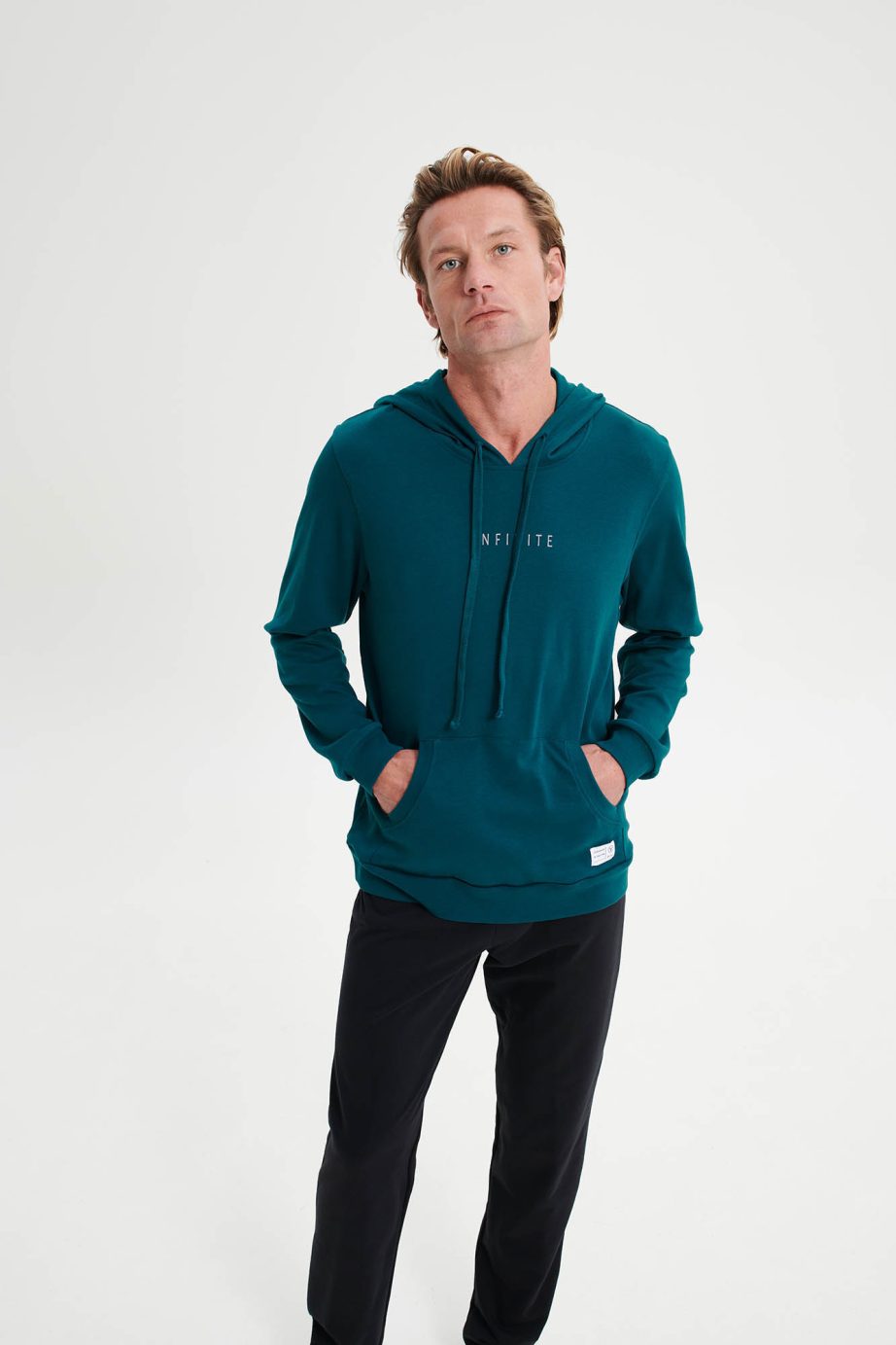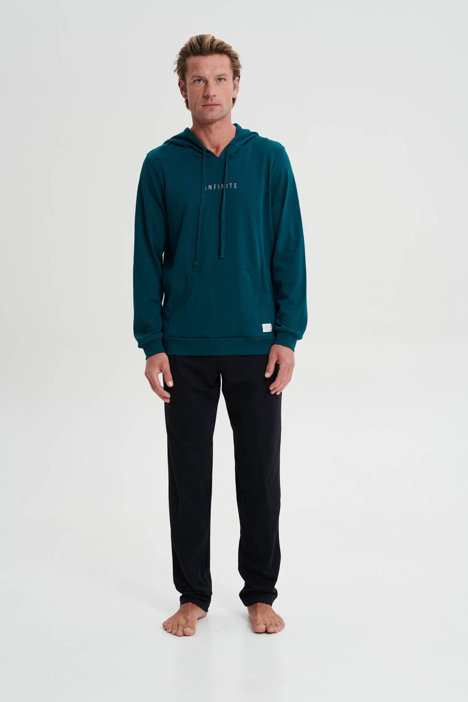 Мъжки спортен екип с кръгло деколте, качулка с маншети и джоб отпред. Удобен избор за студените зимни дни вкъщи.
