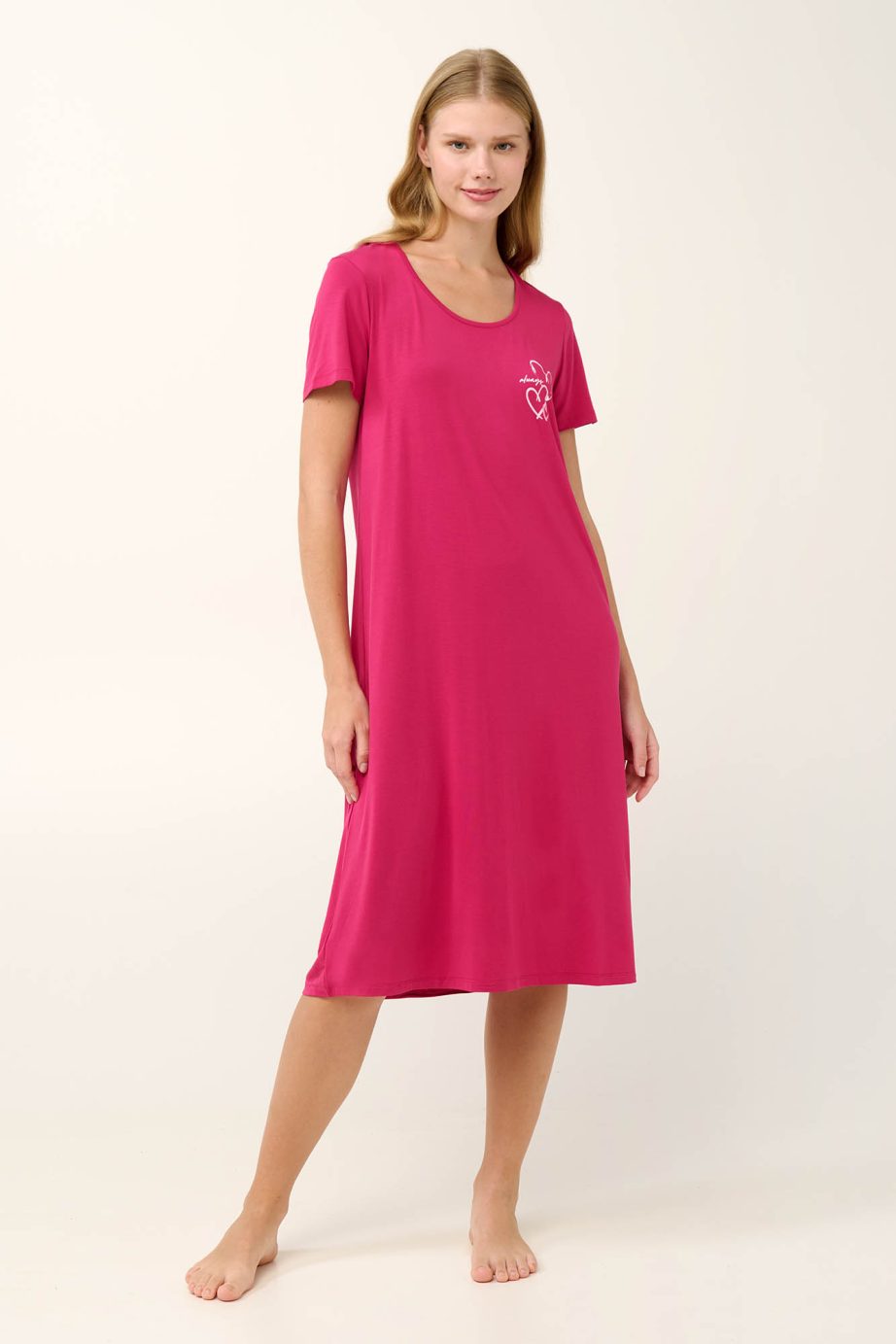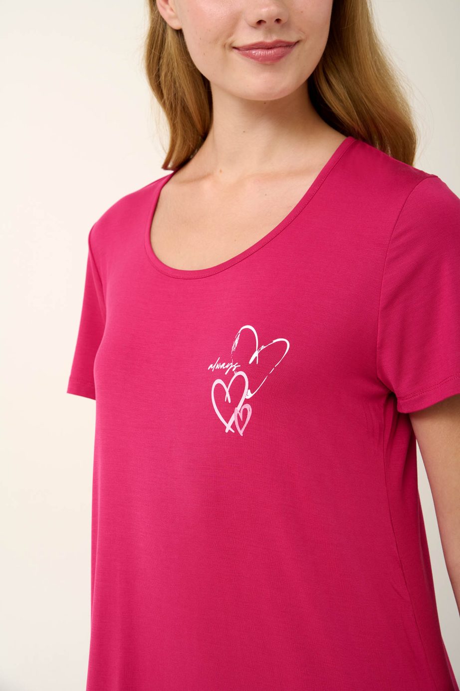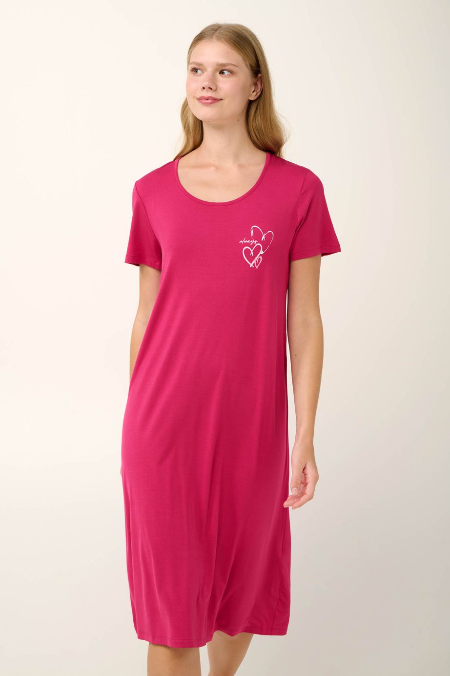 Придайте нотка сладост на дните си с лятната нощница в ярък червен цвят фрагола със сладък принт на сърца на гърдите. Изработена от мек микромодал, тя предлага луксозно меко докосване до кожата. Проектирана в свободна кройка, тя се драпира красиво, осигурявайки лекота на движенията. Очарователна и удобна, тази нощница ще ви помогне да се насладите на спокоен ден.
