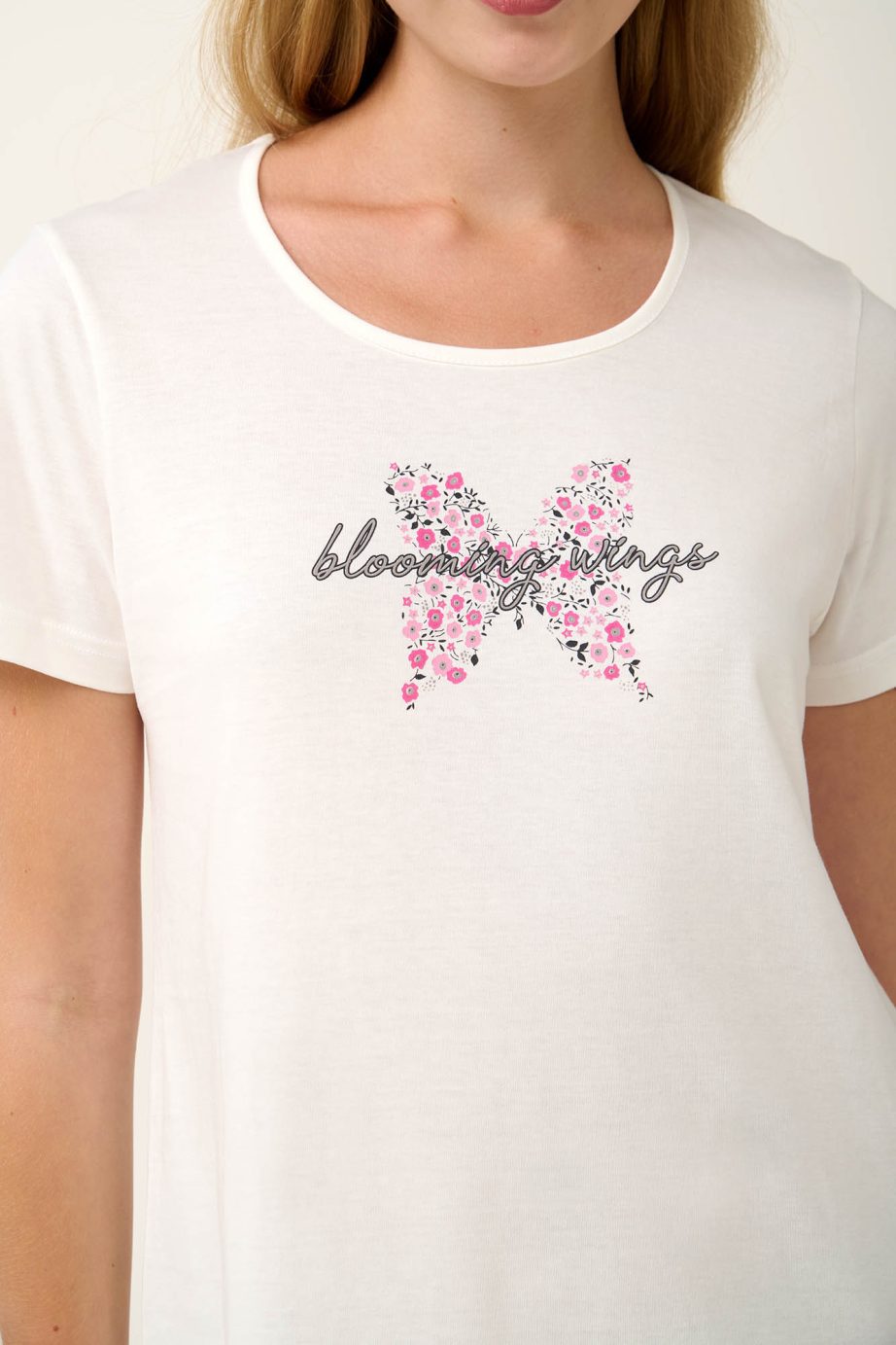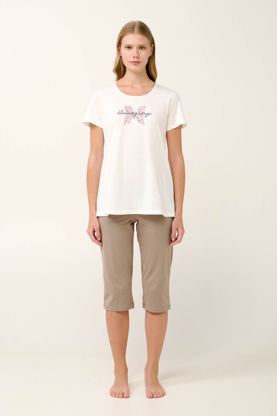 Насладете се на спокойни летни нощи с дамска пижама в успокояващи земни тонове. Изработена е от 100% памук от единично жарсе, с дишащ и мек допир до кожата. Комплектът включва обикновени панталони капри и кремав топ с възхитителен принт на цветя-пеперуди отпред, който добавя нотка причудливо очарование. С редовна кройка, той предлага комфорт и свобода на движенията, което го прави идеален за излежаване или спокоен сън.