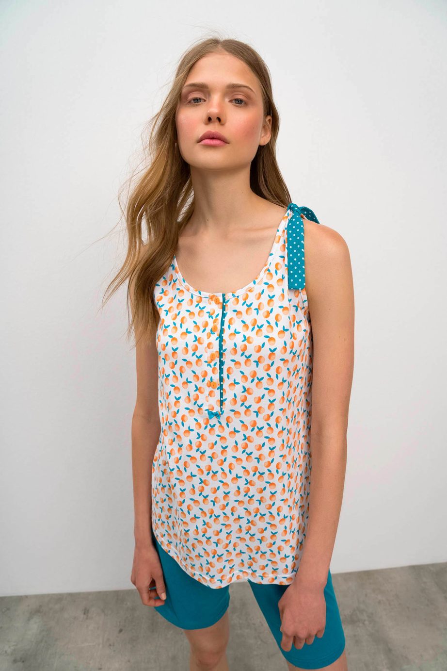 - Дамска пижама без ръкави с копчета и едноцветен къс панталон.
