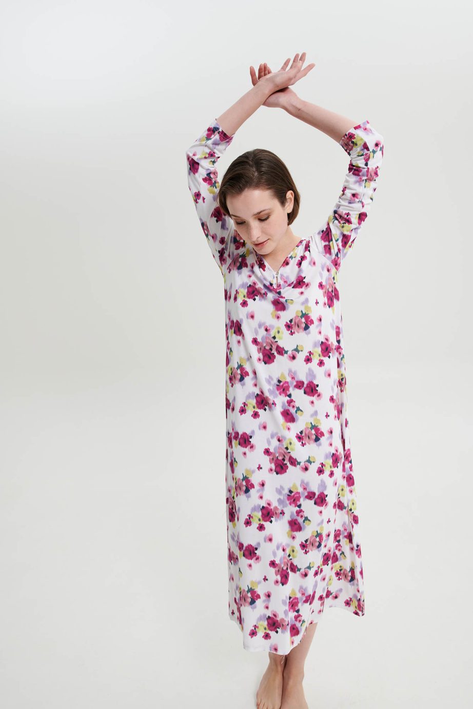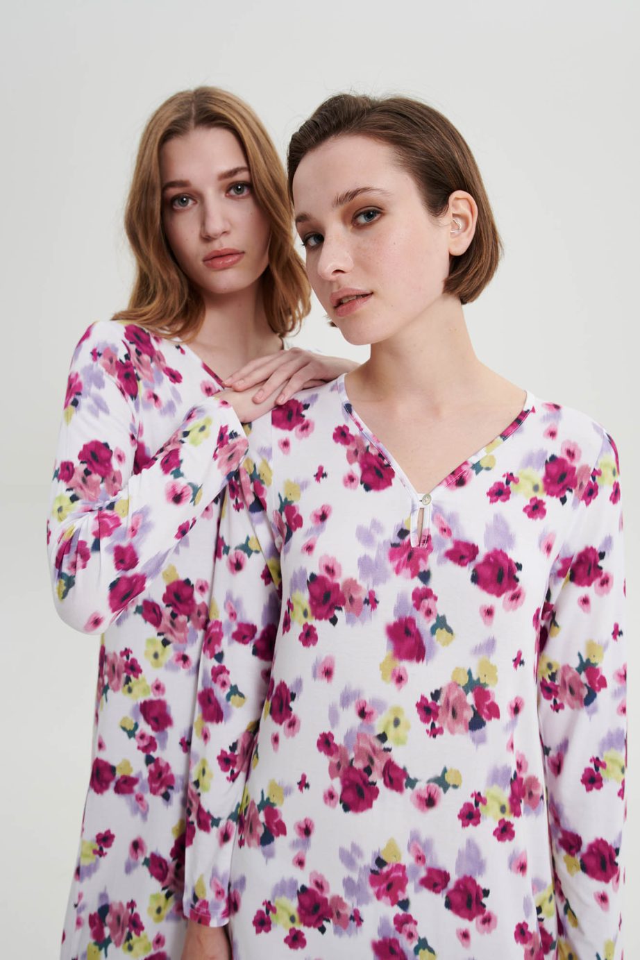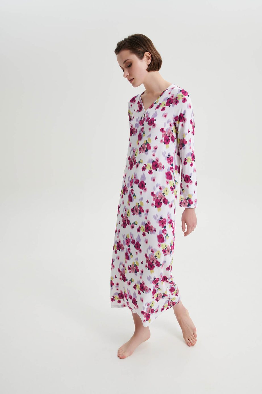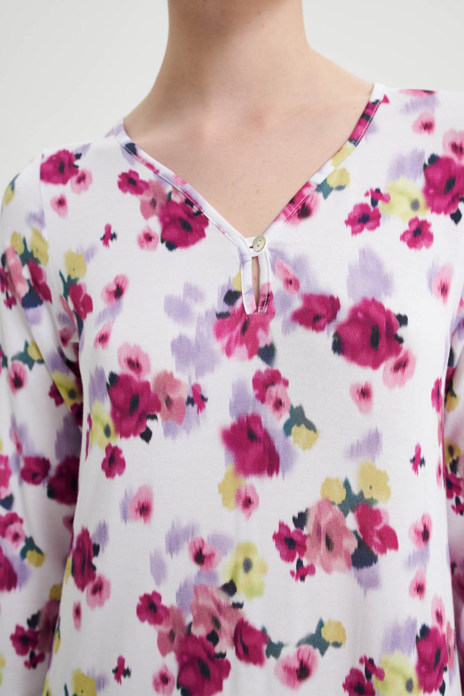 Дълга нощница с V-образно деколте и отличително копче на гърдите за допълнителен комфорт. Неподвластна на времето флорална щампа, изработена от мека на допир материя, която ще ползвате през деня.
