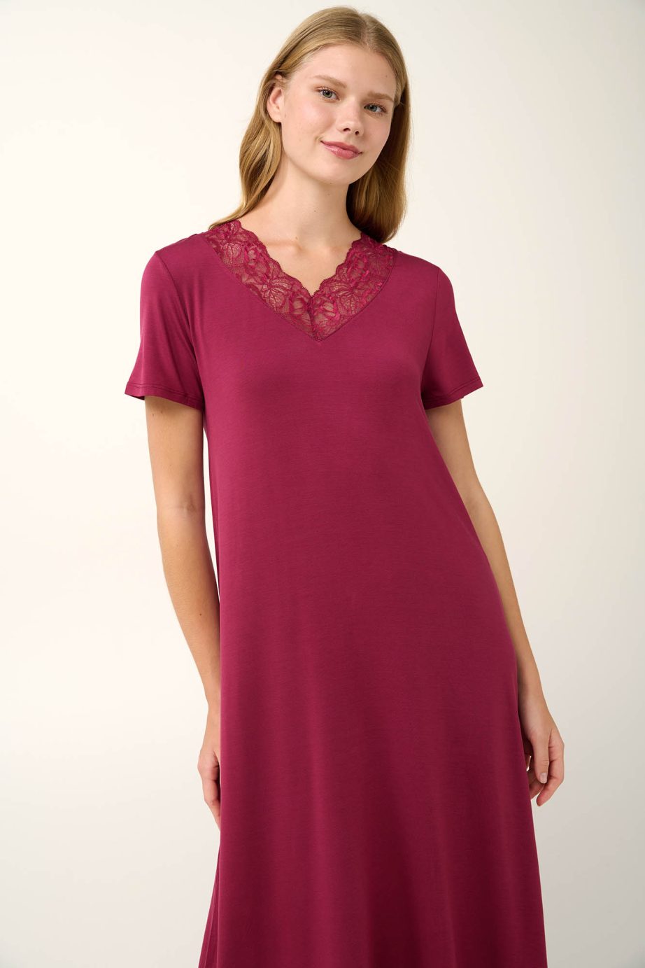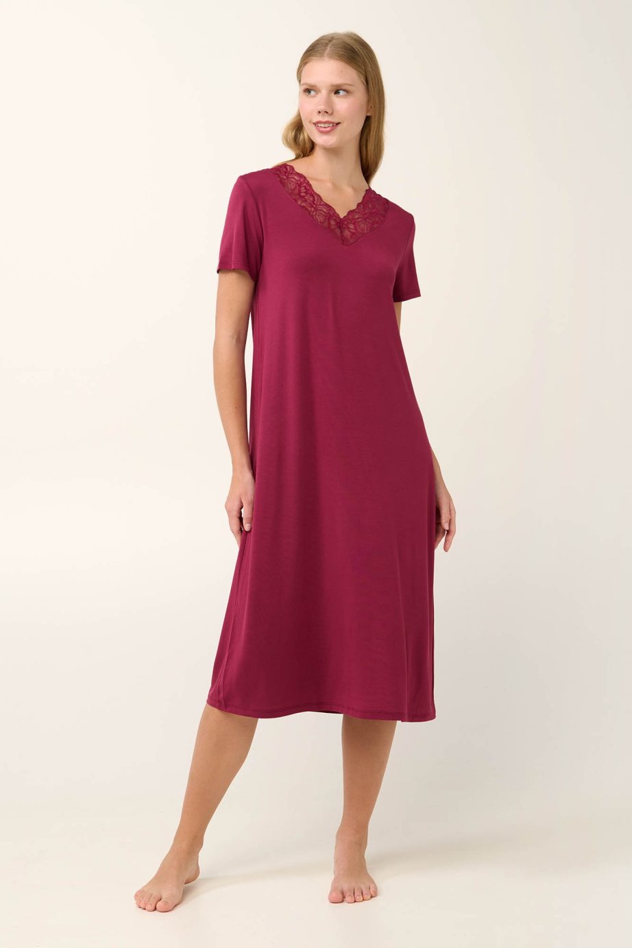 Отдайте се на елегантност с красива нощница, изработена от луксозен микромодал с нежен допир до кожата. Проектирана в свободна кройка с ласкаво V-образно деколте, украсено с деликатна дантела, която придава нотка женственост. Класическо, семпло предложение, което съчетава стил и комфорт без усилие.