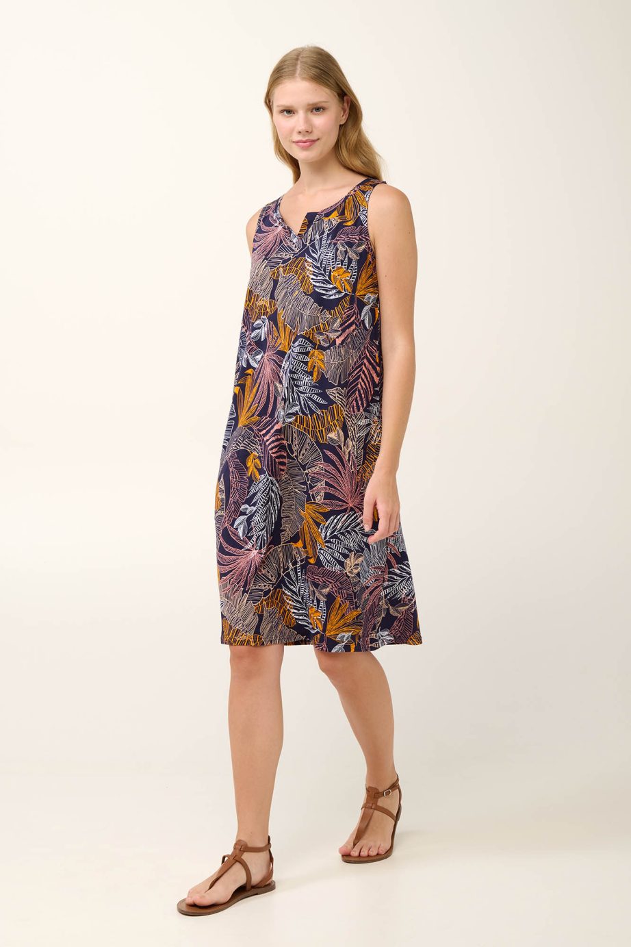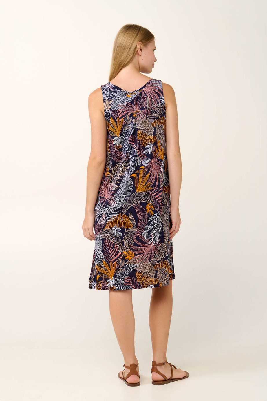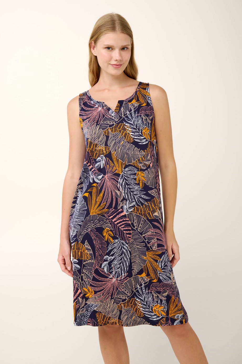 Насладете се на релаксация без усилие с тази лека лятна нощница с флорален принт. Със семпъл дизайн без ръкави, с изрязано деколте и правилна кройка, тя се драпира красиво за комфорт през цялата нощ. Изработена от луксозна памучна модална смес, тя се усеща невероятно мека върху кожата, като същевременно остава дишаща и прохладна. Перфектна за топлите нощи, тази нощница е от съществено значение за спокоен сън и уютни сутрини.