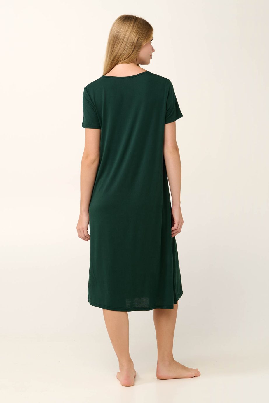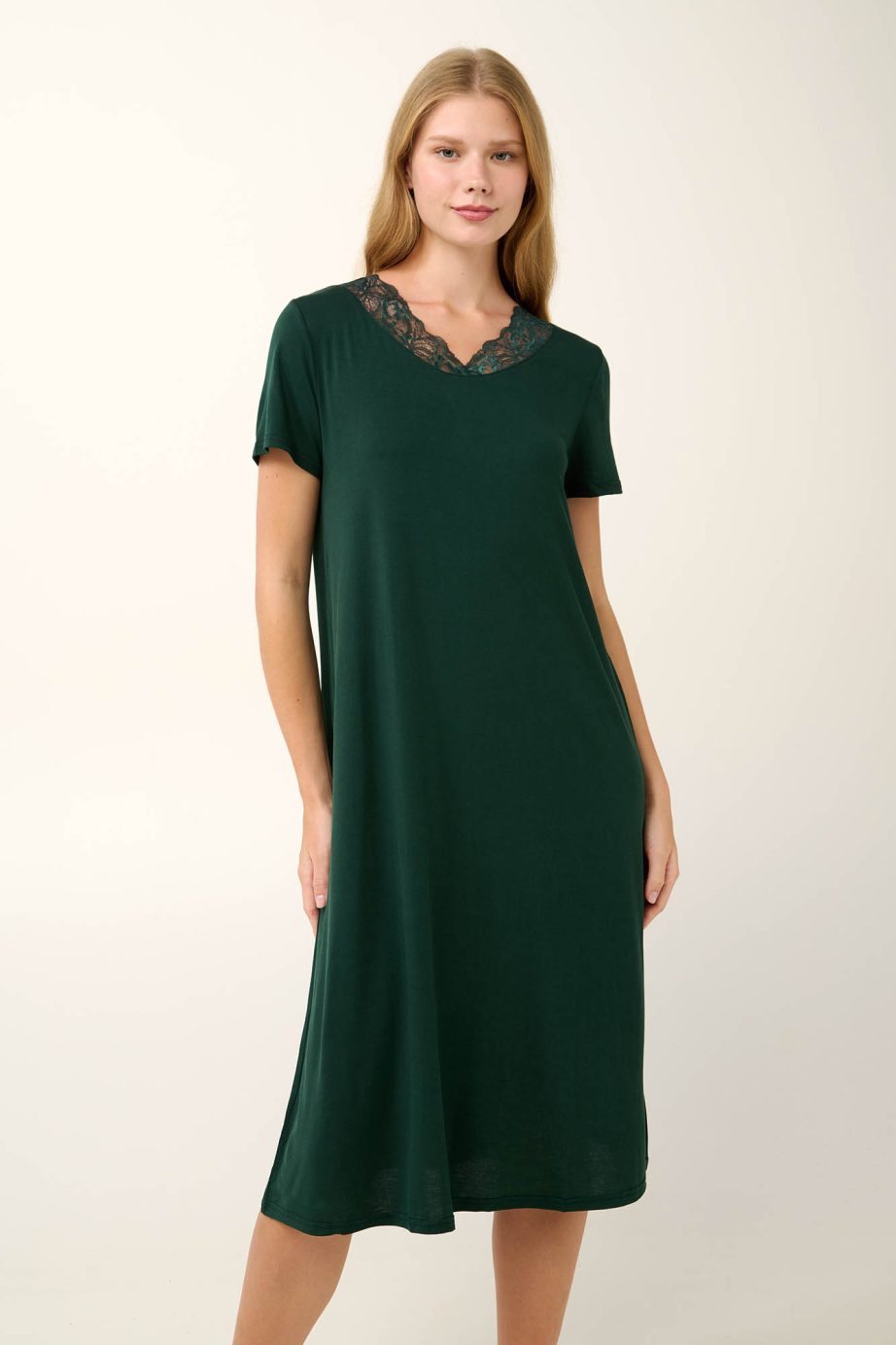 Придайте си елегантност с луксозна нощница в наситен зелен нюанс. Изработена е от мек микромодал с красива драперия и копринено усещане върху кожата. Проектирана в свободна кройка, която гарантира комфорт, и ласкаво V-образно деколте, украсено с нежна дантела. Насладете се на всеки миг у дома с комфорт и изящество.