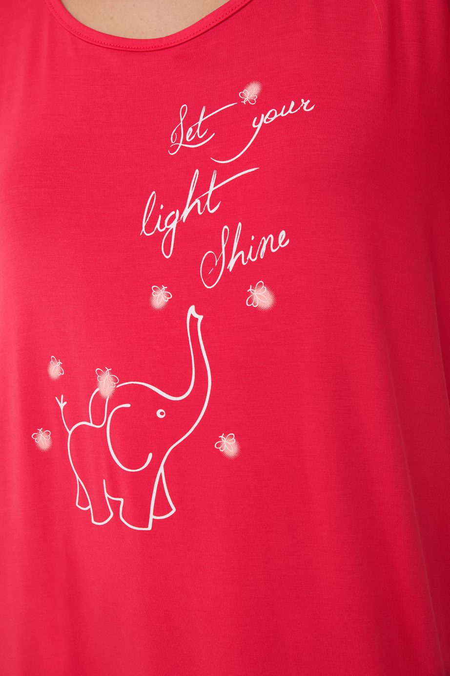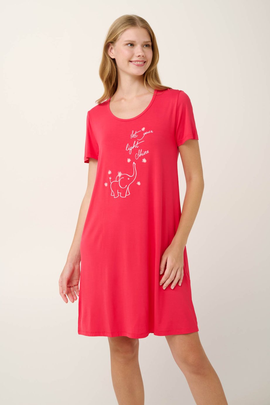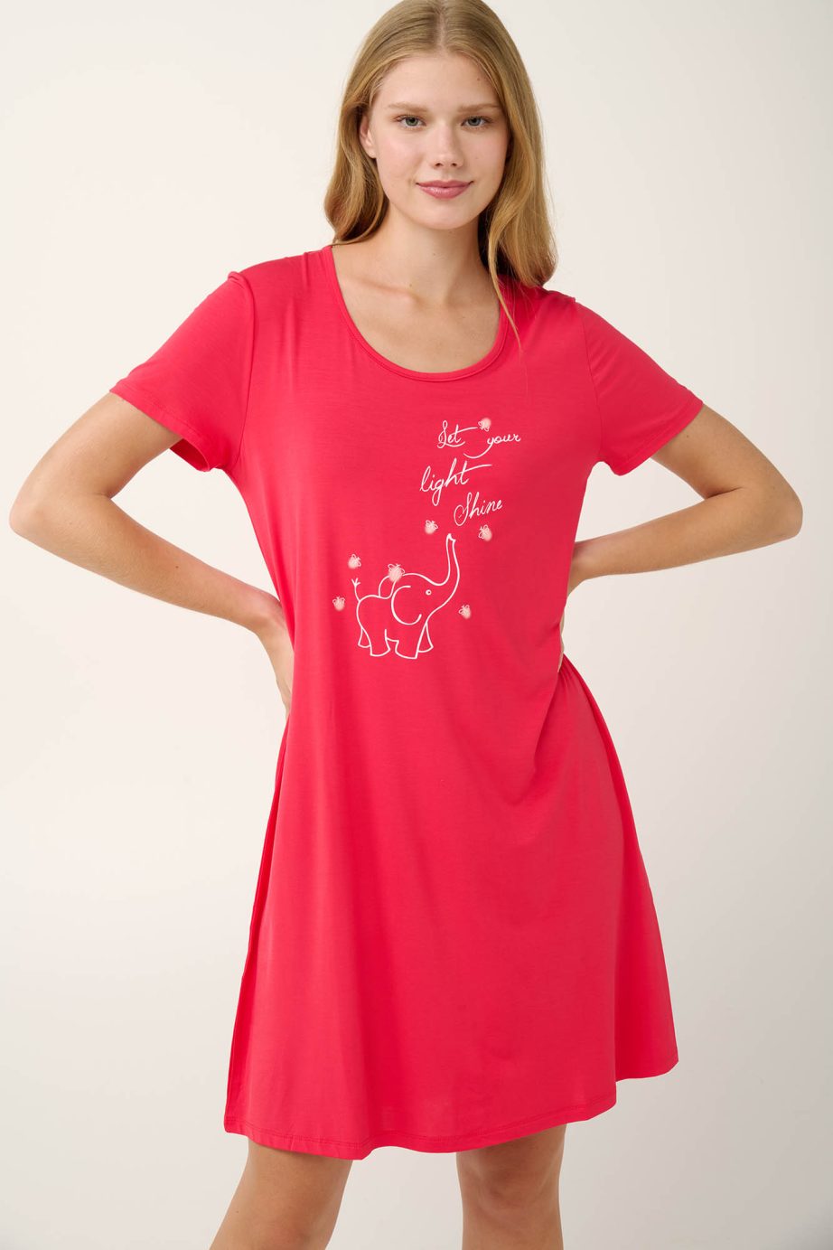 Освежете нощите си с лятна нощница в ярък червен нюанс на фрагола, с очарователен принт на слончета отпред. Изработена е от мек, дишащ микромодал, който се драпира красиво и осигурява копринено усещане върху кожата. Проектиран с къси ръкави и свободна кройка, той предлага комфорт и свобода на движенията без усилие. Идеален избор за уютни вечери с младежко настроение.
