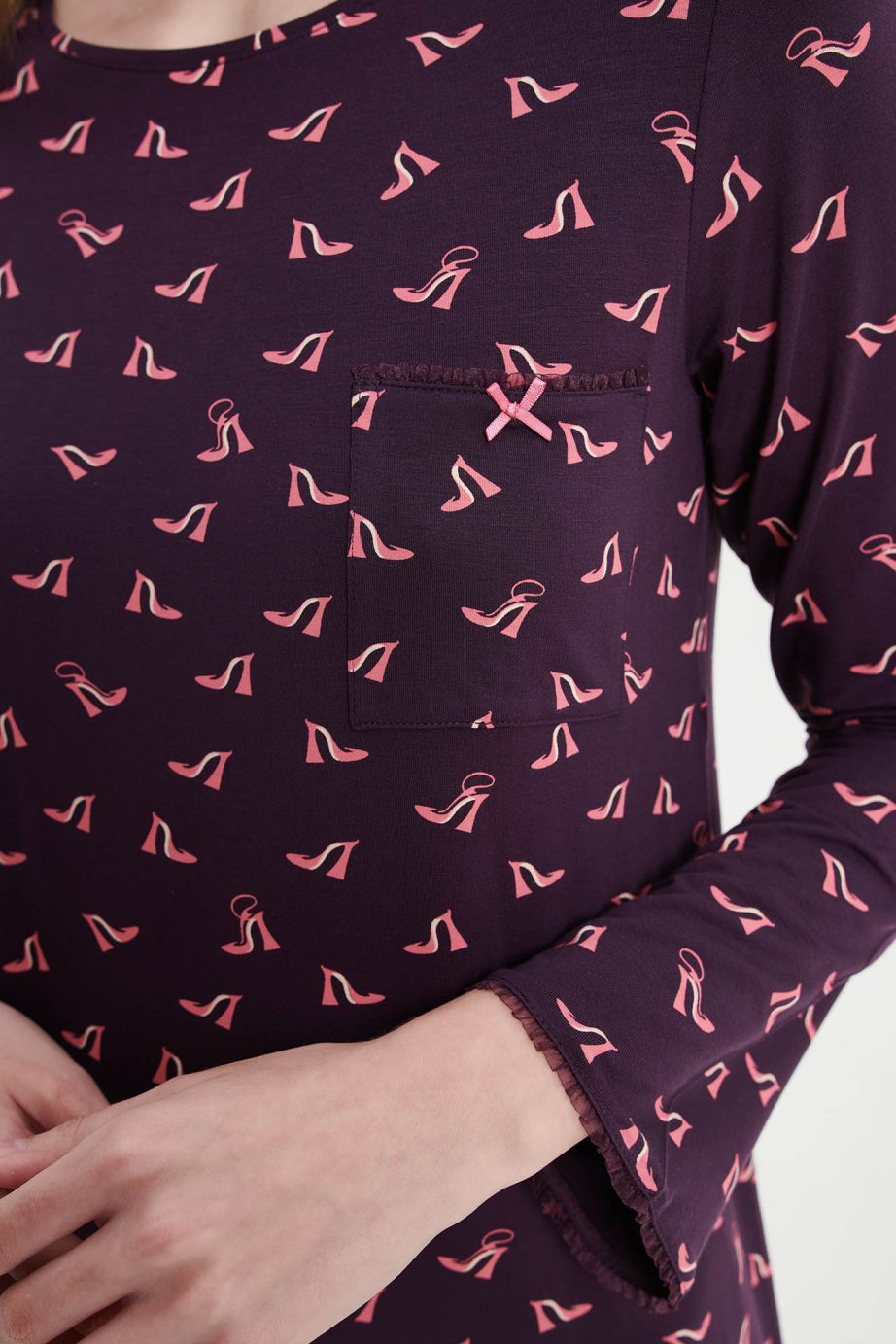 Нощна рокля с кръгло деколте, джоб и дълги ръкави. Приятно предложение с щампа, което ще придаде комфорт и стил на времето, прекарано у дома.