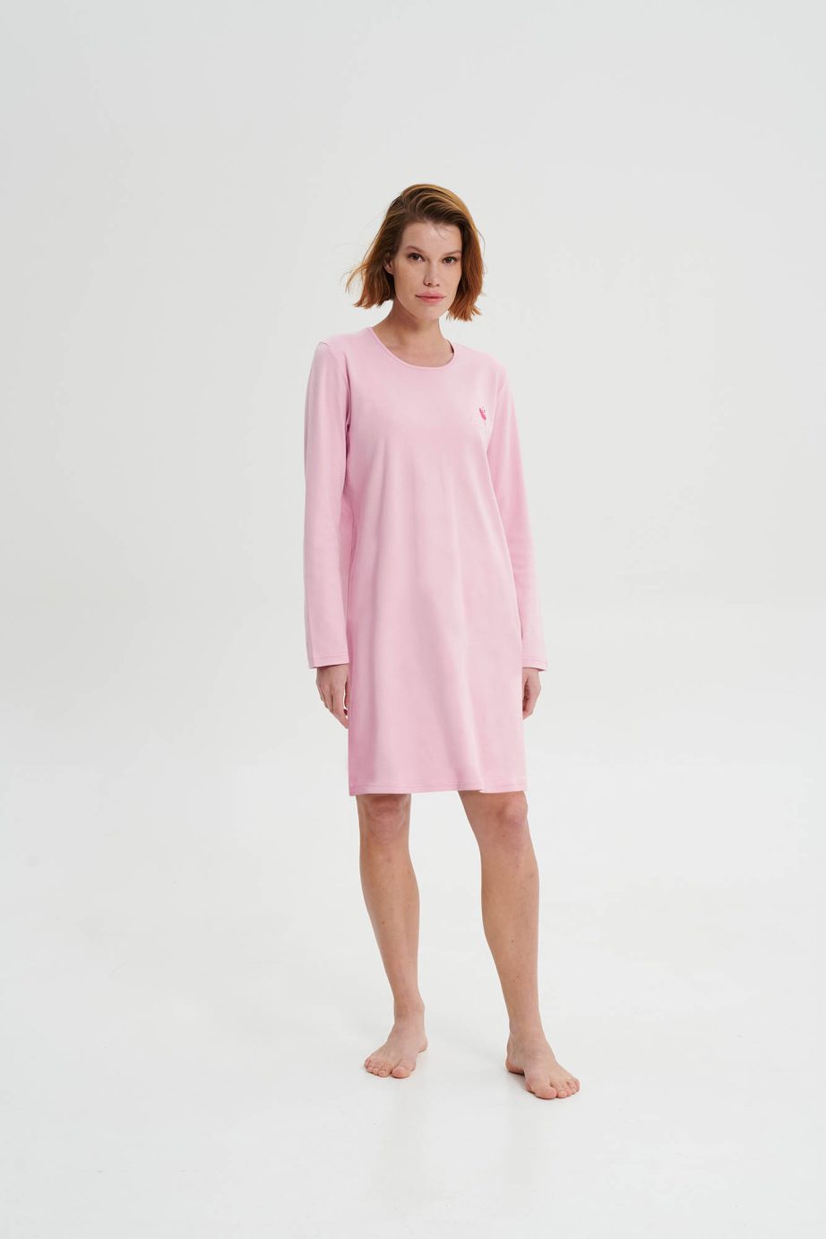 Нощна рокля с кръгло деколте и дълги ръкави в свободна кройка. Приятна щампа в розов нюанс, която ще подобри настроението ви.