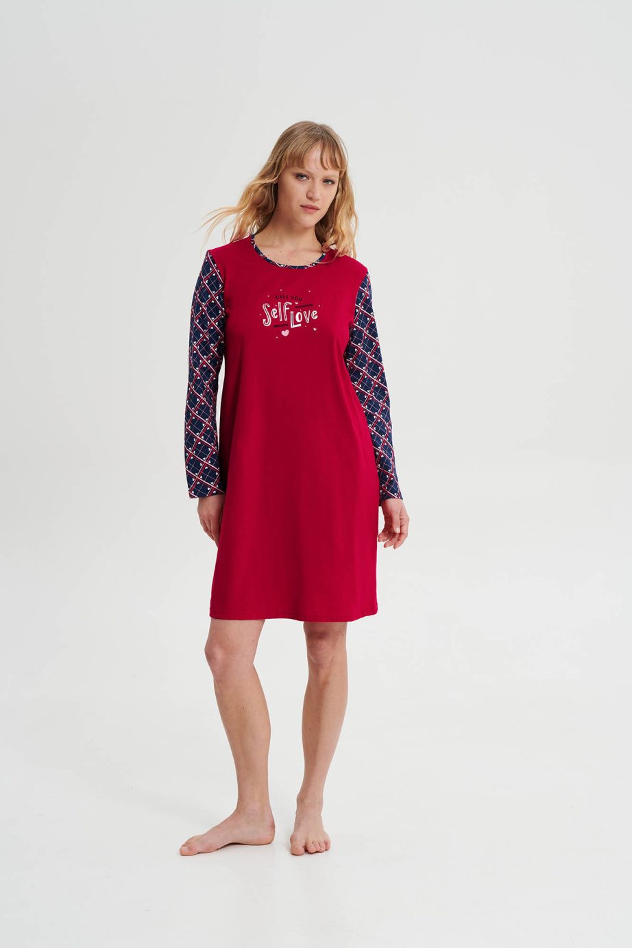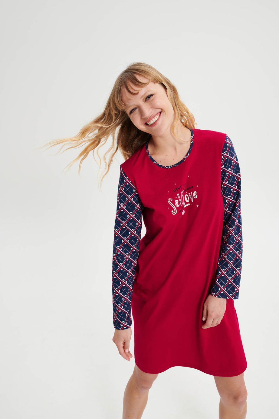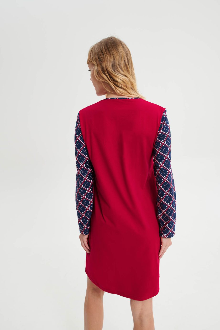 Нощна рокля с кръгло деколте и дълги ръкави в свободна кройка. Уникален кариран принт от памук, на който ще се наслаждавате през деня.