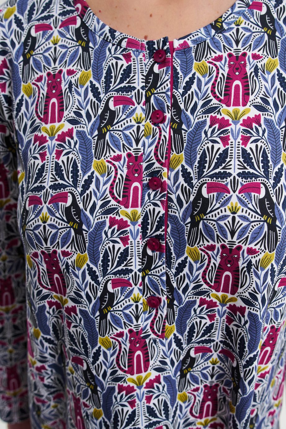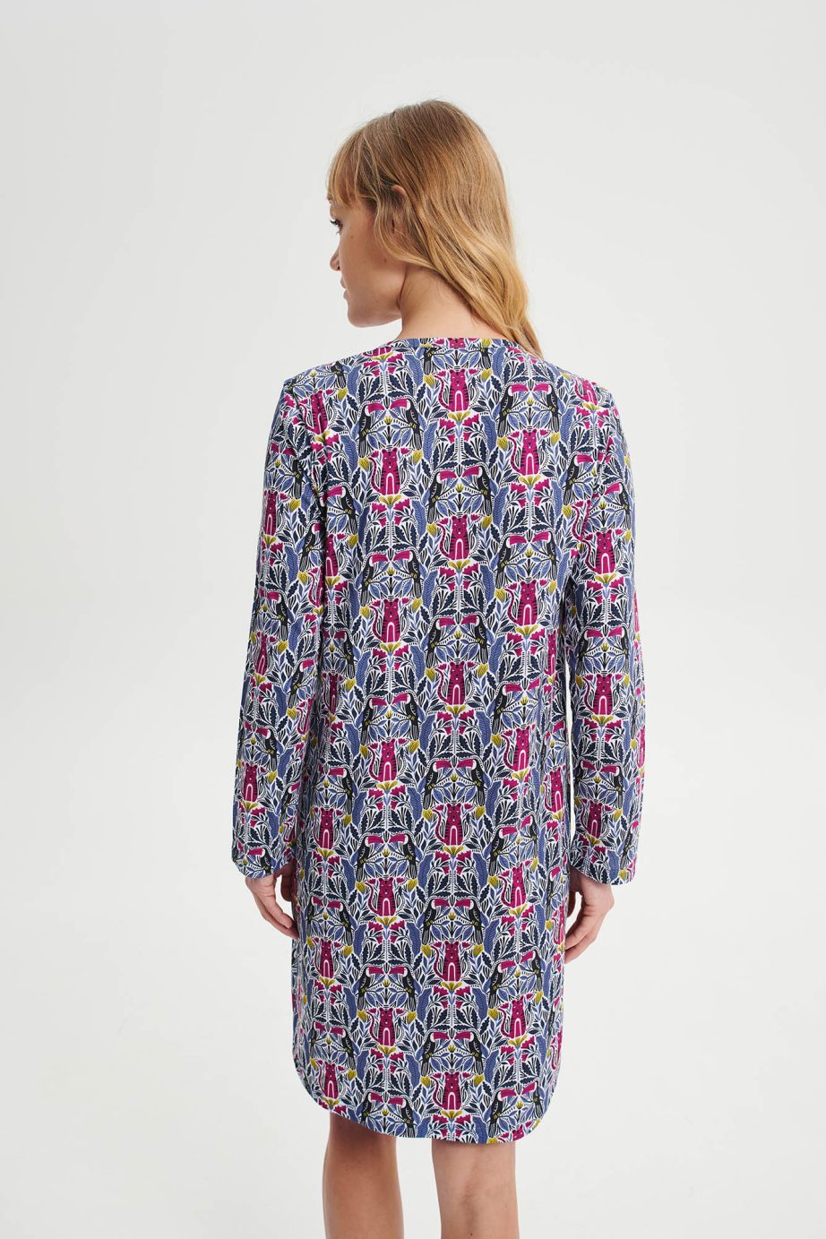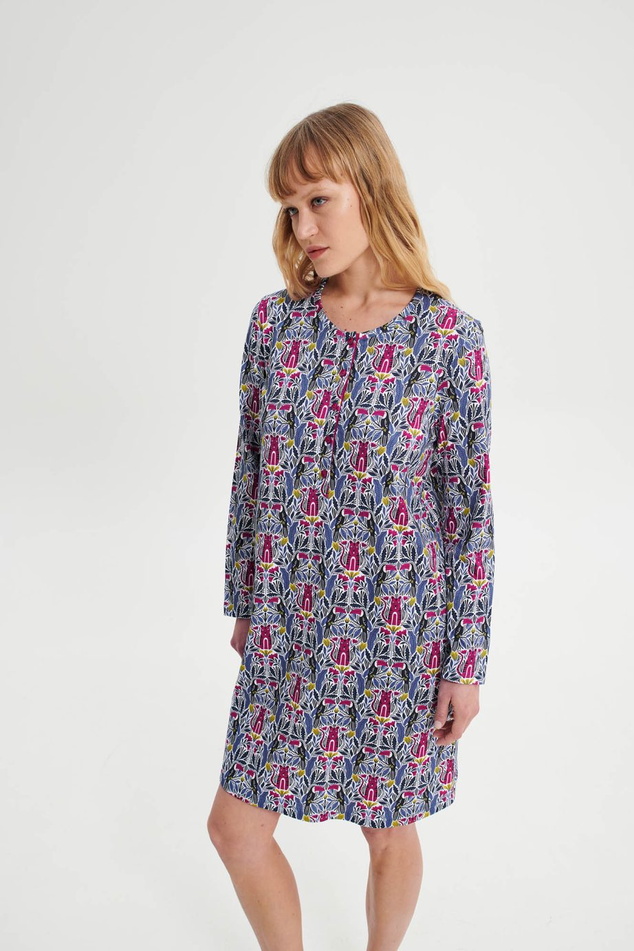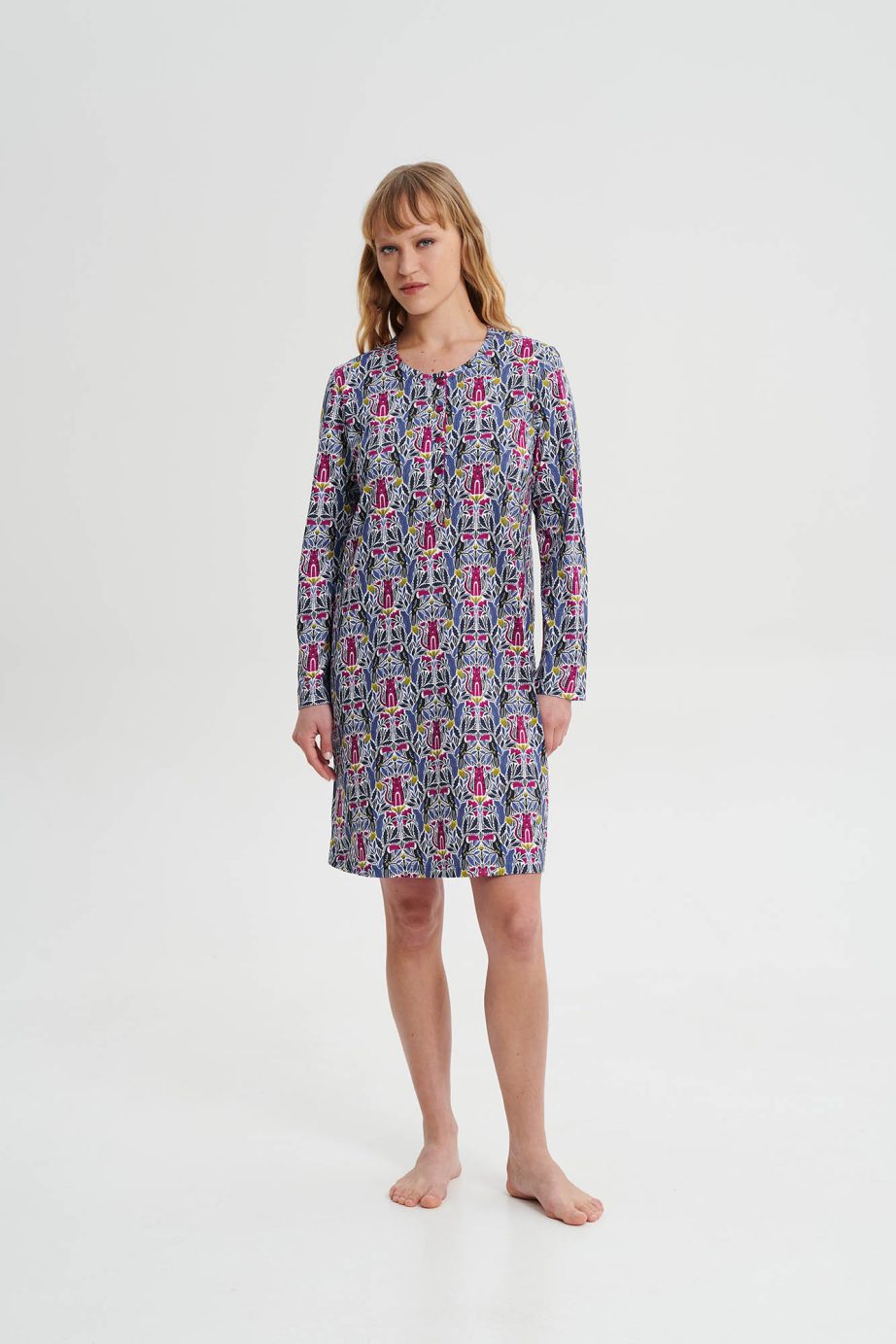 Нощна рокля с копчета и дълги ръкави в свободна кройка. Уникален принт от памук, на който ще се наслаждавате през деня.