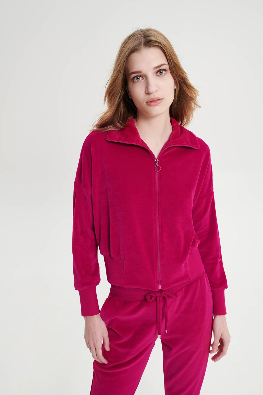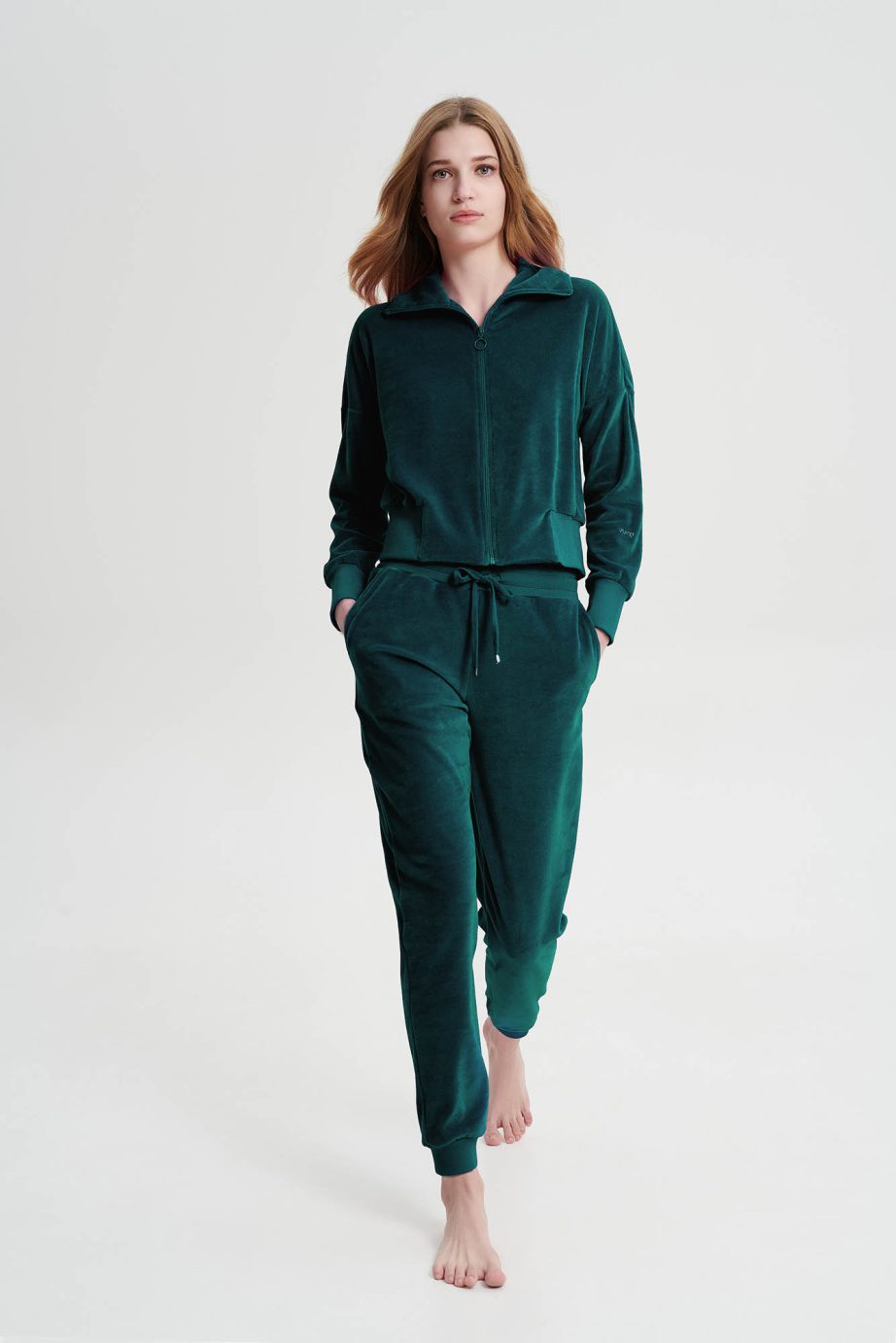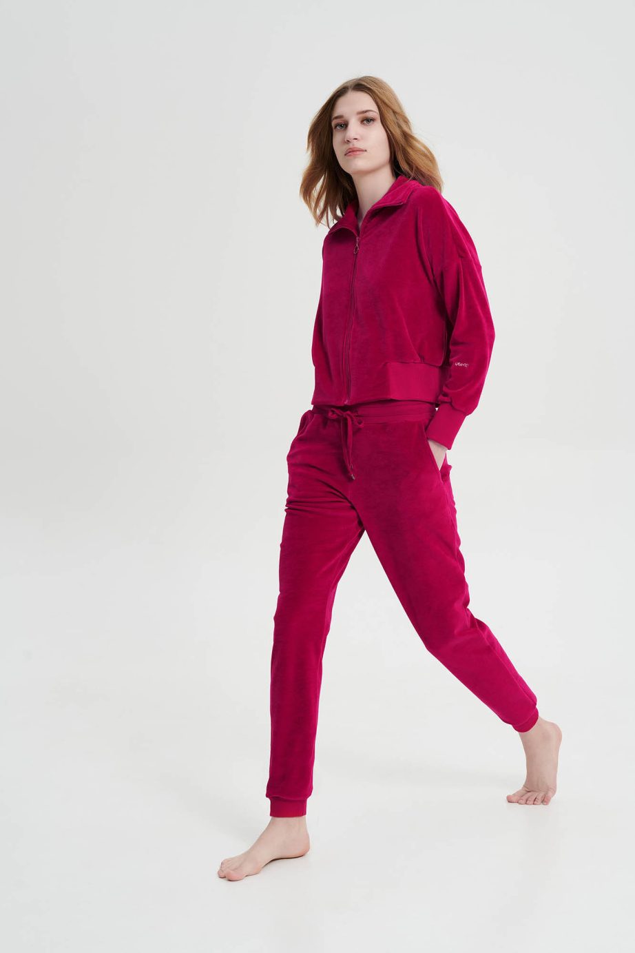 Платинен дамски спортен костюм с цип, ръкави с маншети и панталони с джобове. Чудесен кадифен избор, за студените зимни дни.