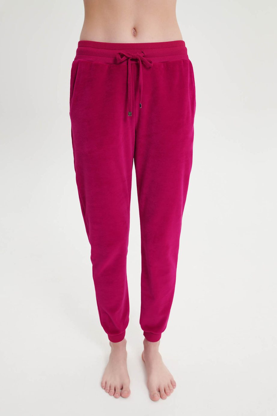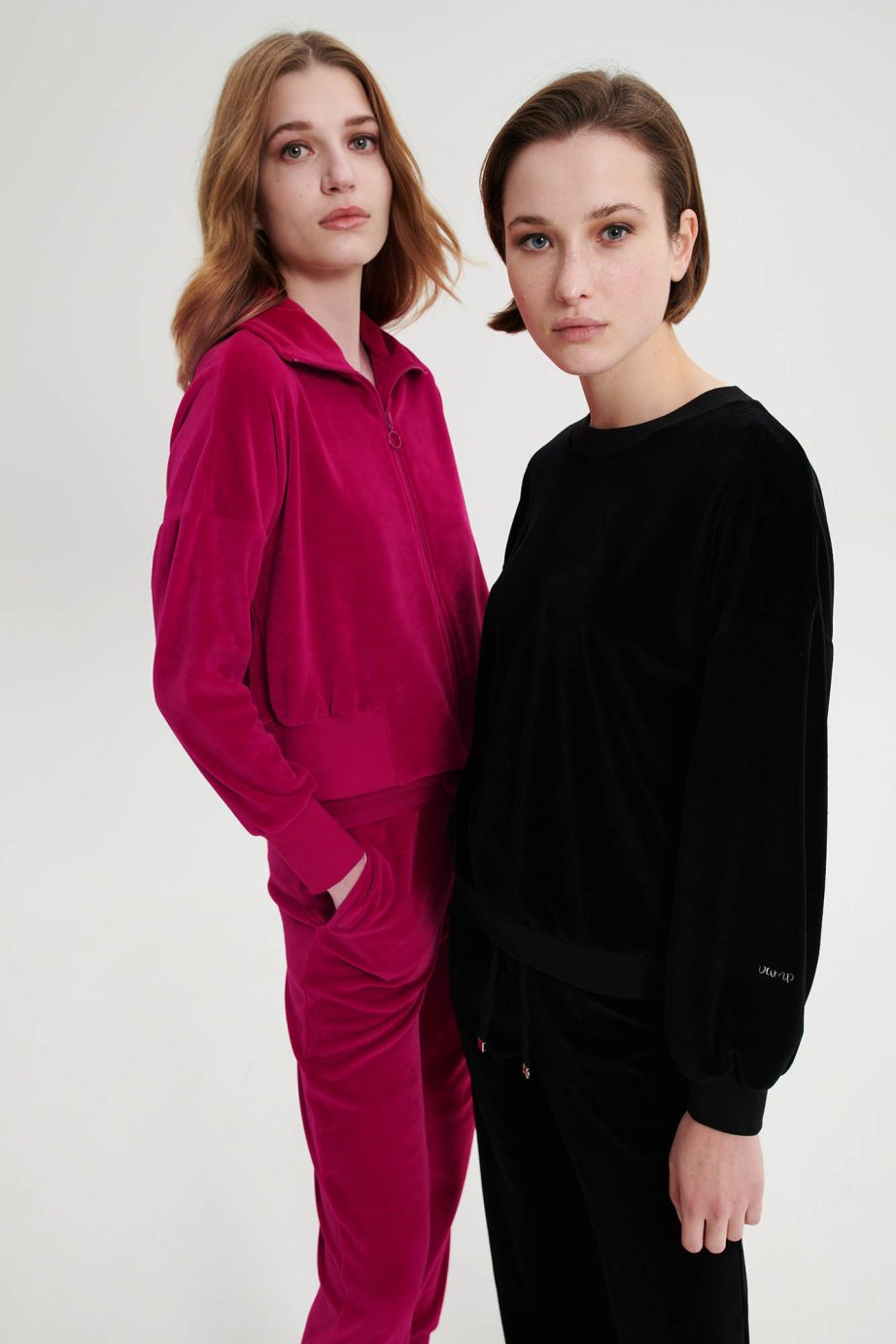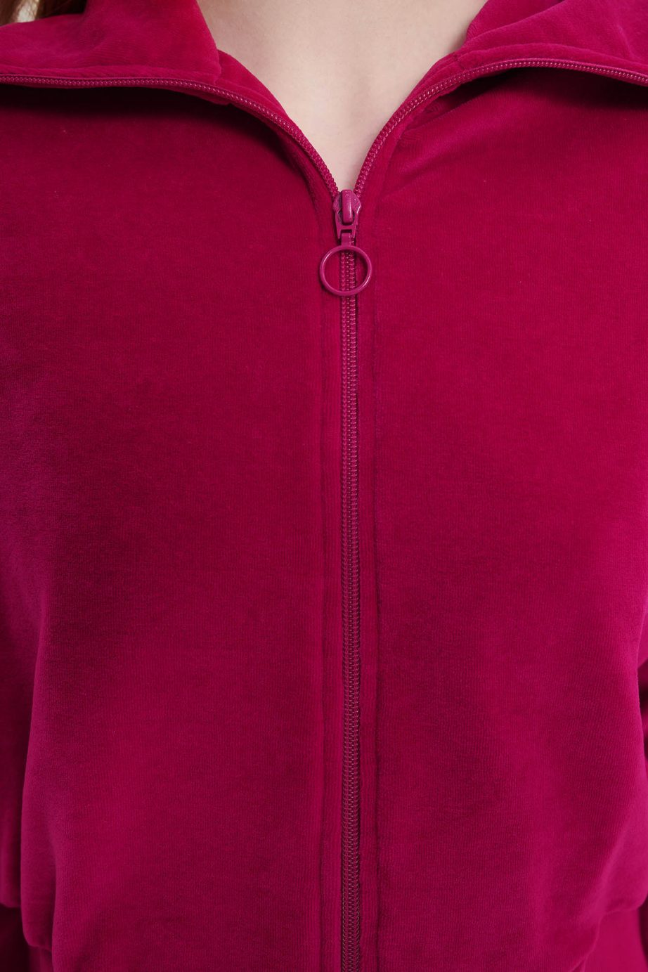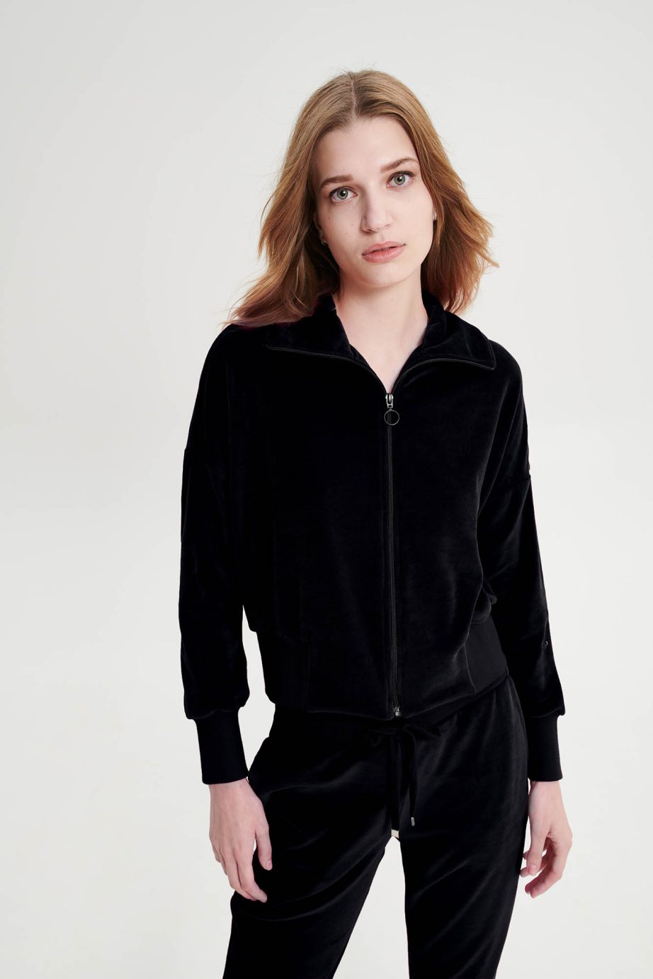 Платинен дамски спортен костюм с цип, ръкави с маншети и панталони с джобове. Чудесен кадифен избор, за студените зимни дни.