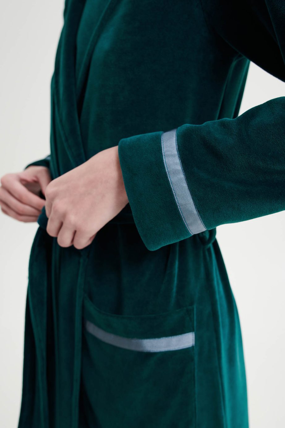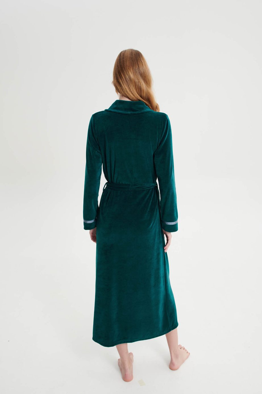 Платинен, макси дамски халат с колан и полезни джобове отпред. Чудесен кадифен избор, за студените зимни дни.