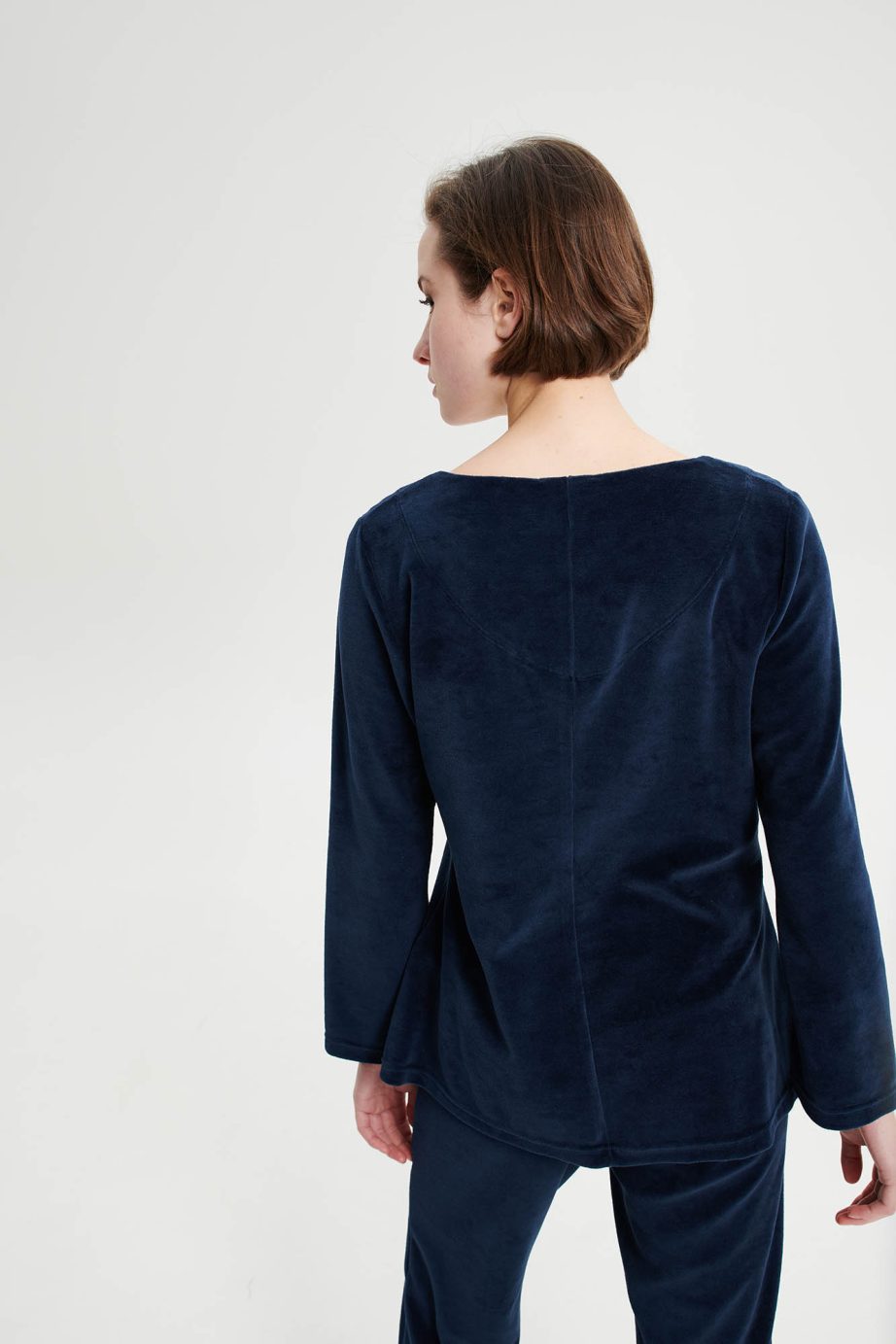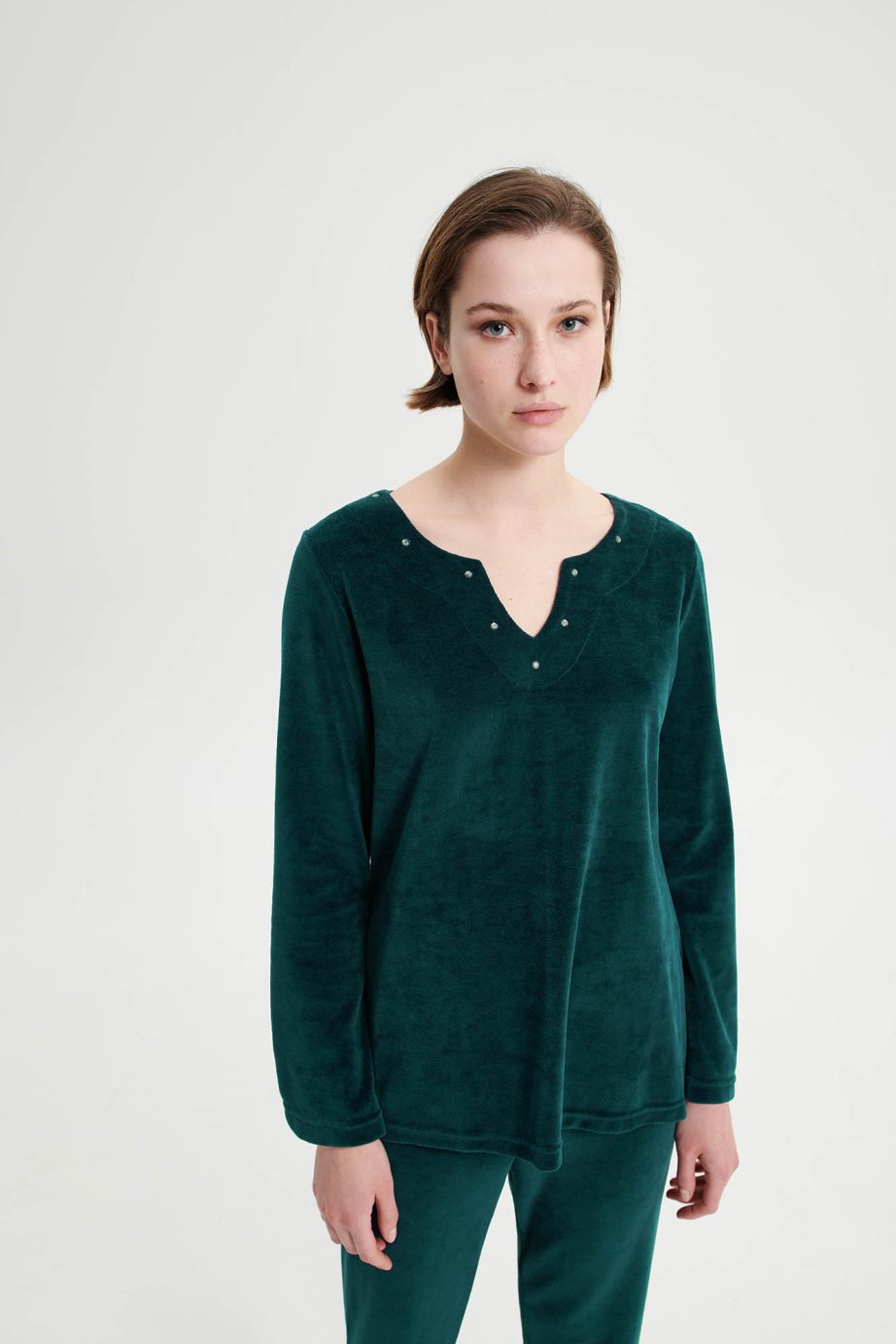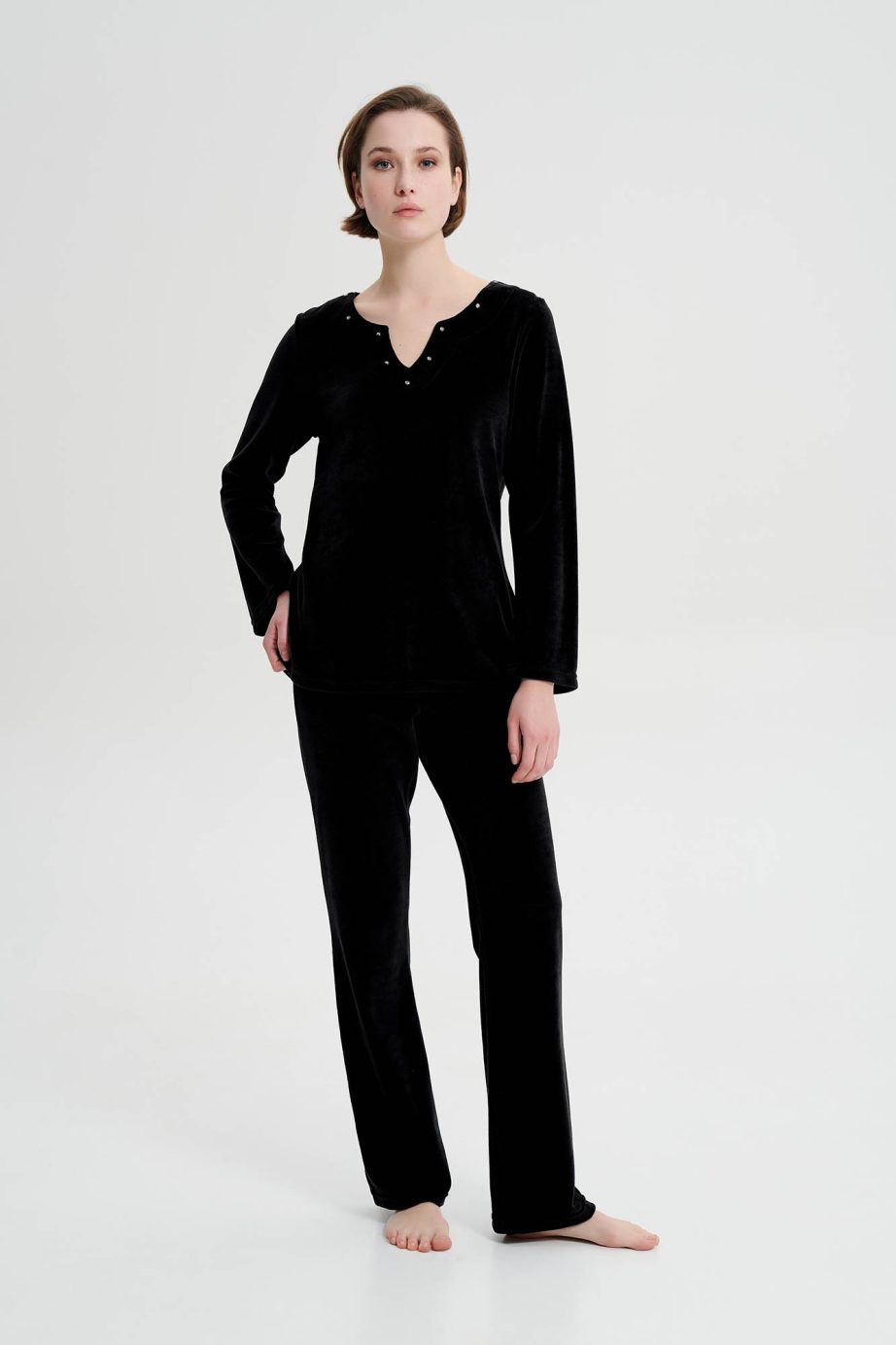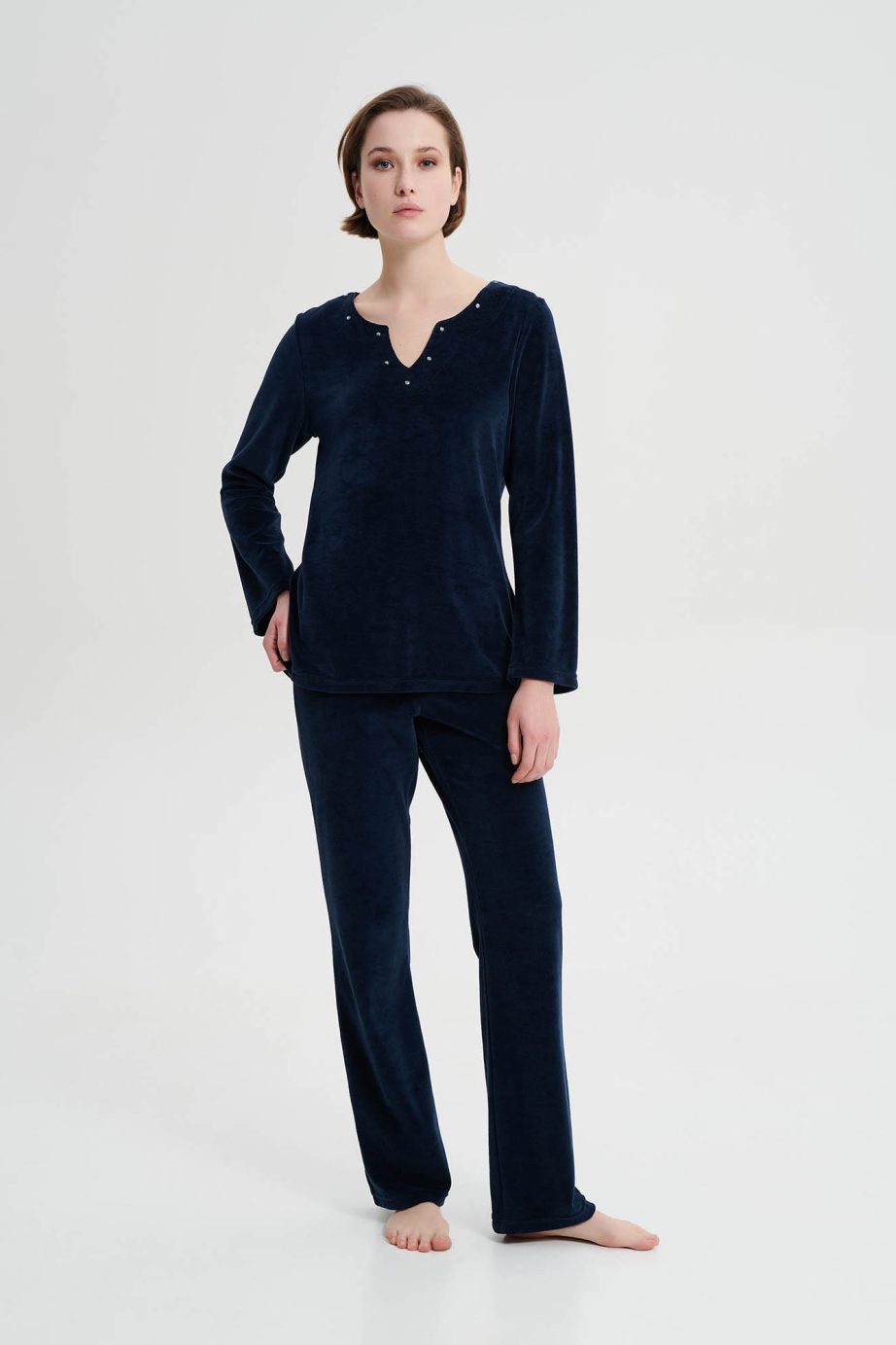 Дамски спортен костюм с V-образно деколте, гладки панталони и гладка горна част в свободна кройка. Чудесен кадифен избор, за студените зимни дни.