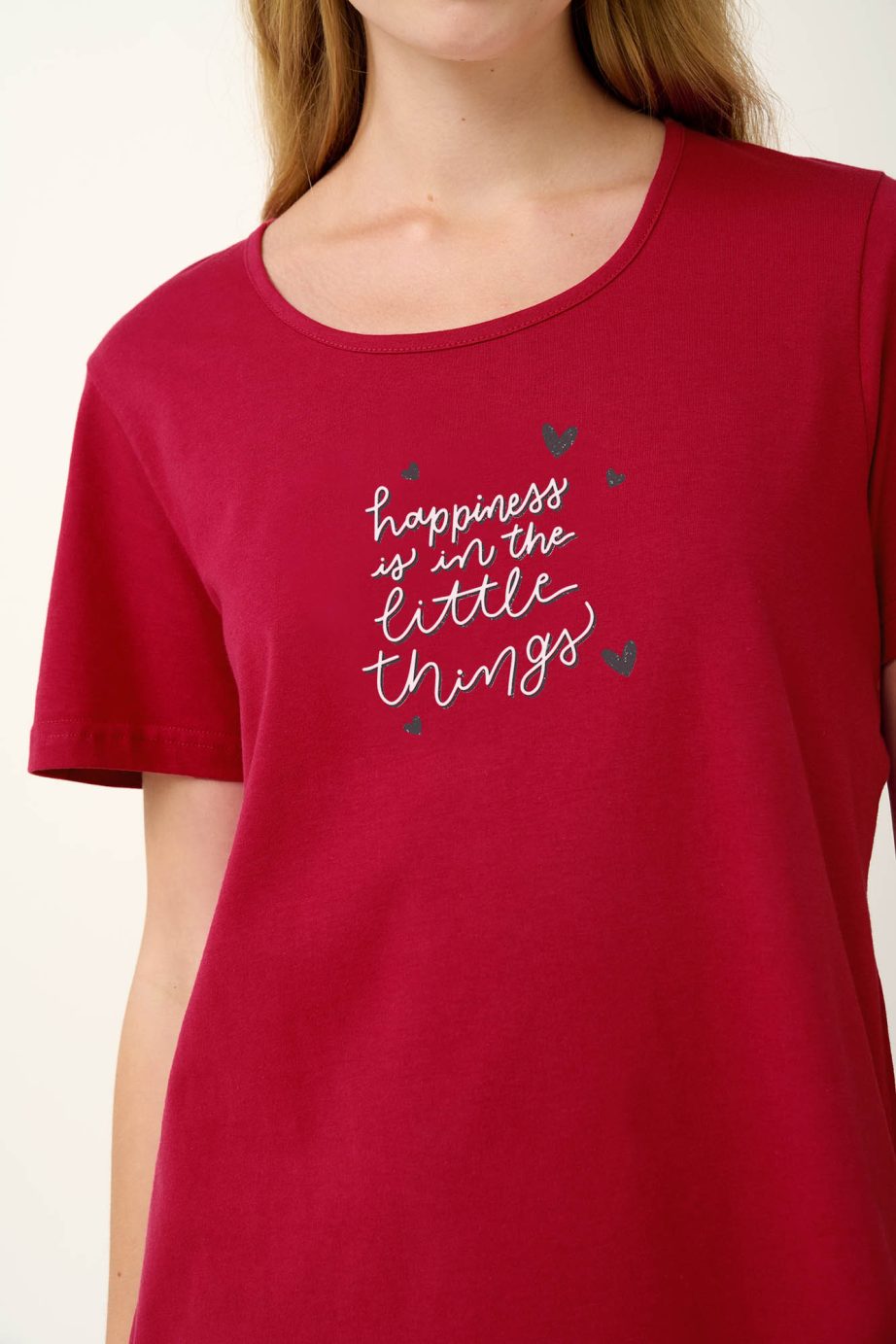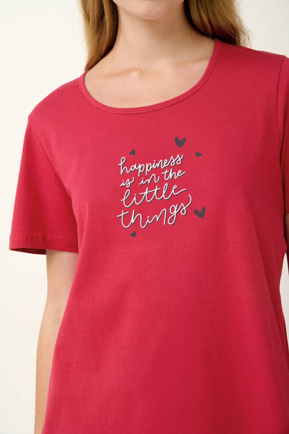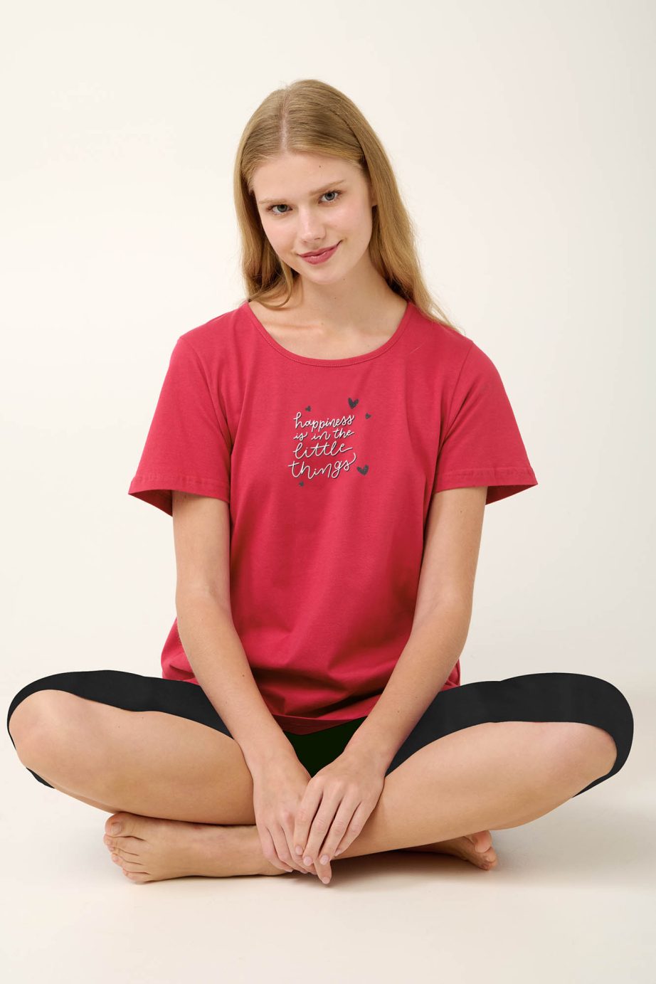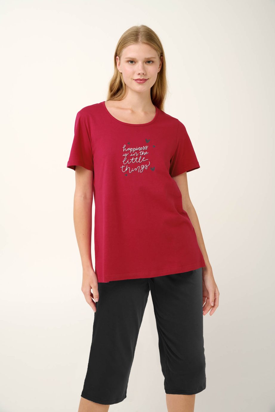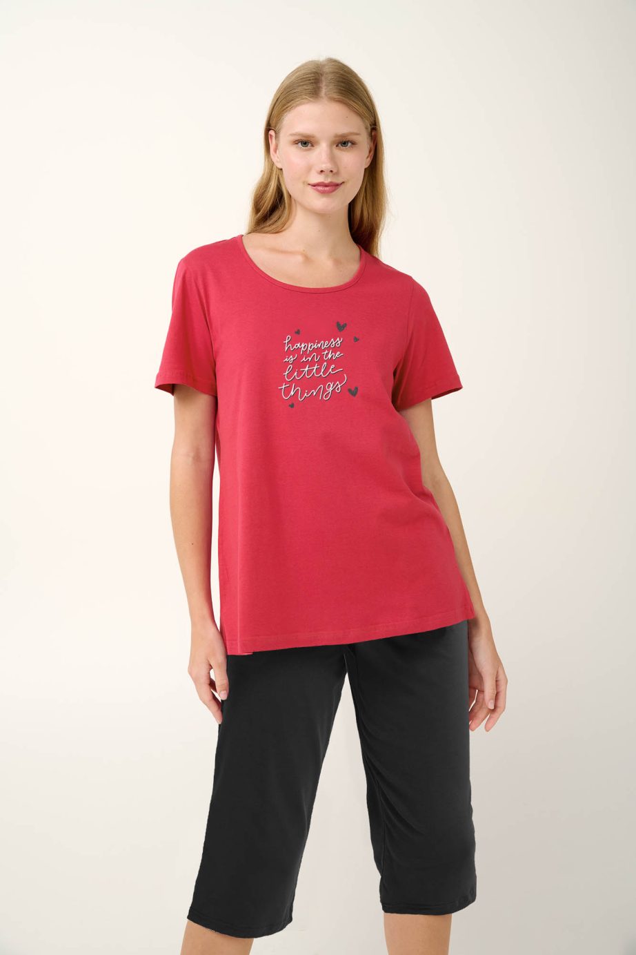 Изпитайте максимален комфорт с нашата лятна дамска пижама, включваща стилни обикновени панталони капри, съчетани с червен топ, украсен с очарователна щампа за поразителен контраст. Изработен от 100 % мек памук от единично трико, този комплект е проектиран да ви държи хладно и уютно, което го прави идеален избор за спокоен сън в топлите летни нощи.