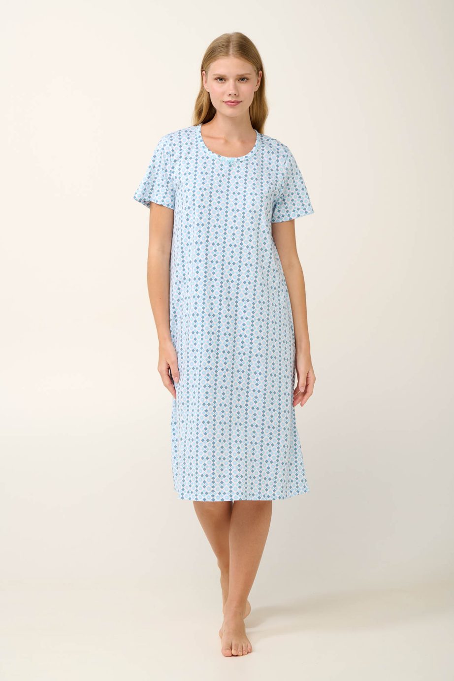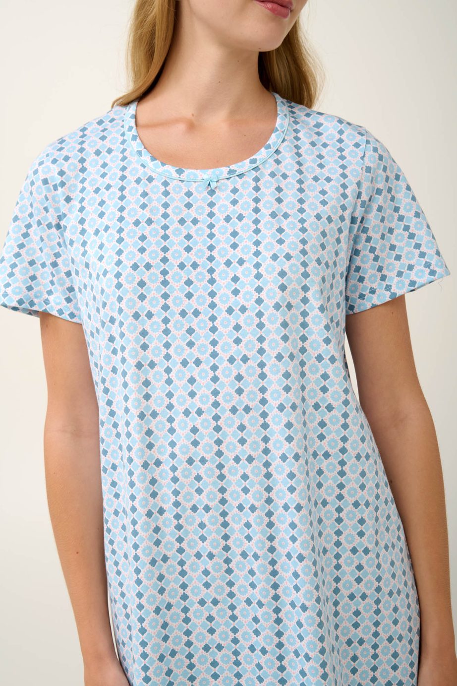 Останете прохладни през горещите летни дни със светлосиня нощница с шикозен геометричен принт. Изработена е от 100 % памук от единично жарсе, който осигурява дишане и същевременно е мек към кожата. Проектирана в редовна кройка, с къси ръкави и кръгло деколте, тя е идеален избор за спокойни нощи и удобни сутрини.