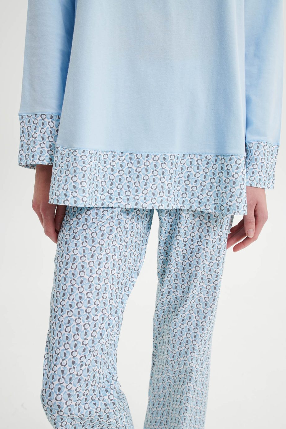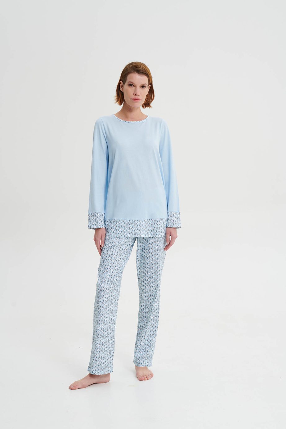 Дамска пижама с кръгло деколте и панталон с щампа в свободна кройка. Класическо предложение в светлосини нюанси.