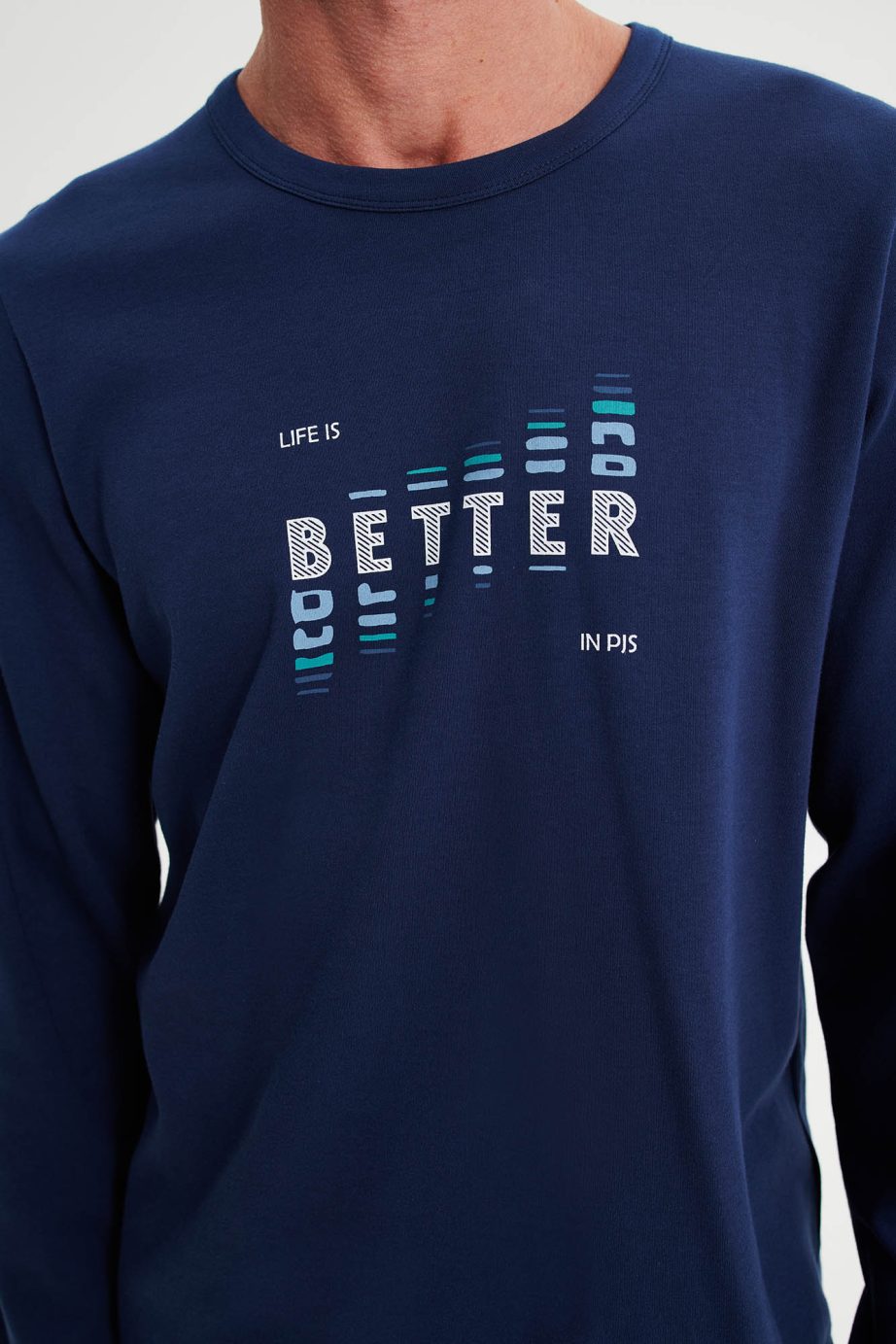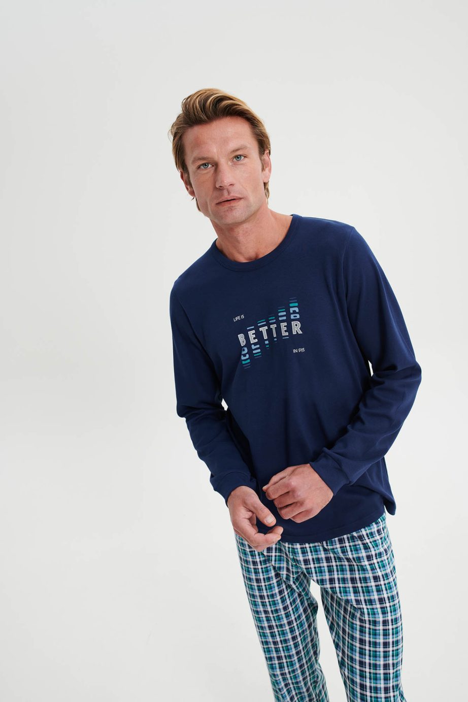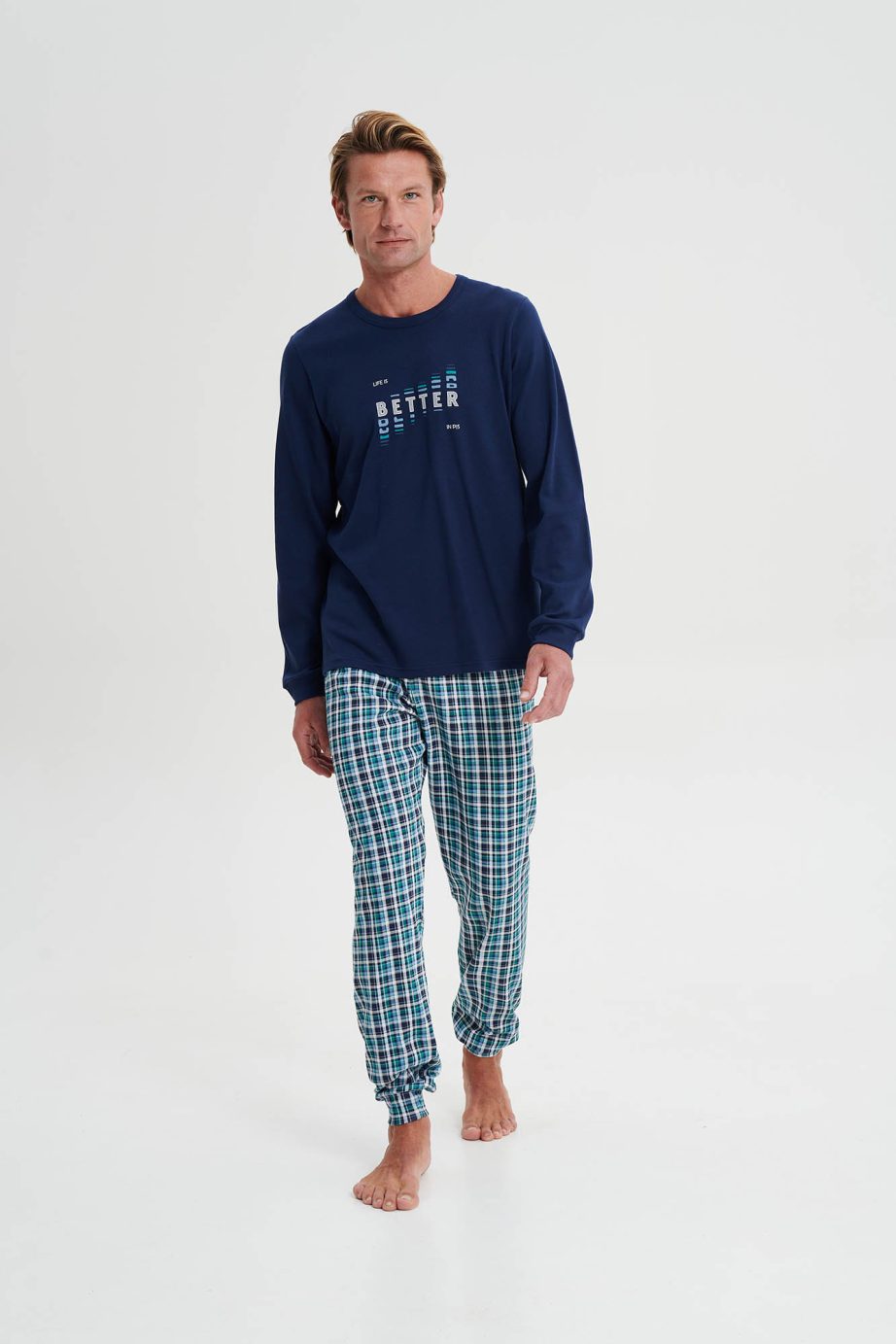 - Мъжка пижама с кръгло деколте, ръкави с маншети и кариран панталон с маншети. Вечно актуално, памучно предложение в сини нюанси.