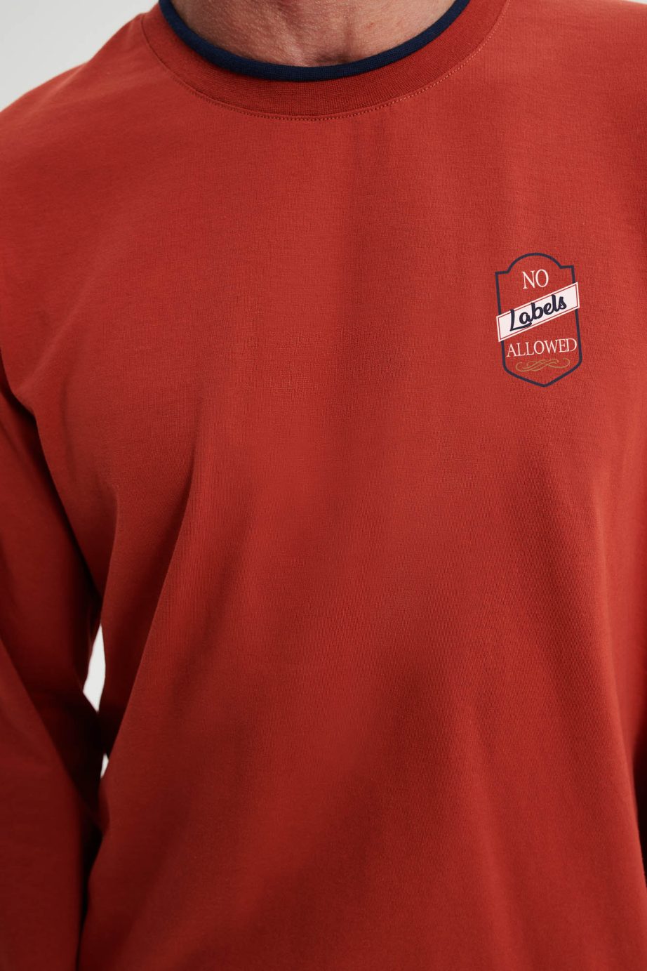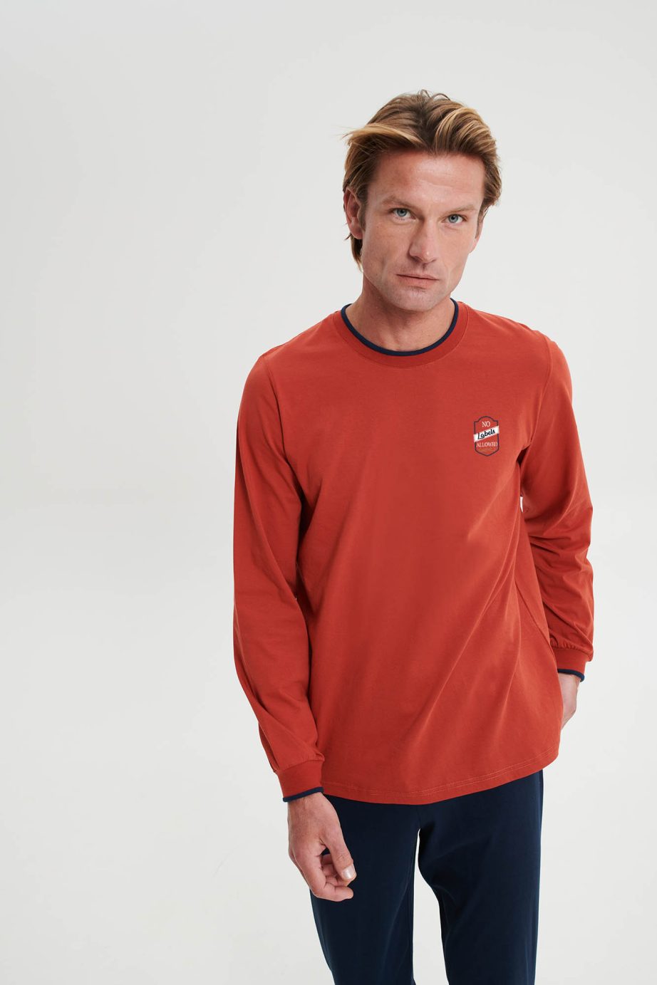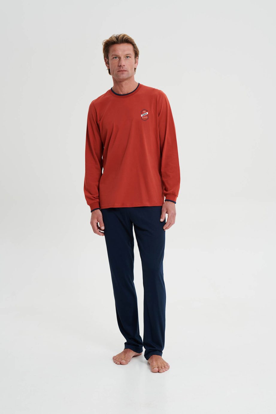 Мъжка пижама с кръгло деколте, ръкави с маншети и дълъг гладък панталон. Тя ще осигури комфорта, който търсите у дома.