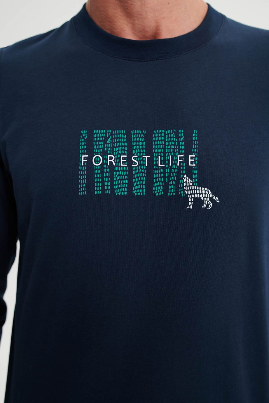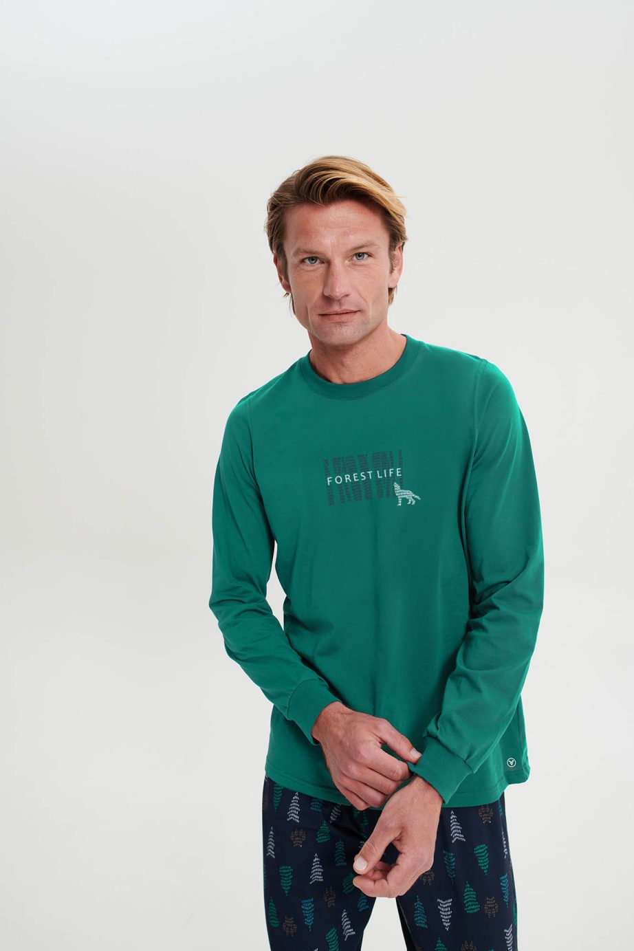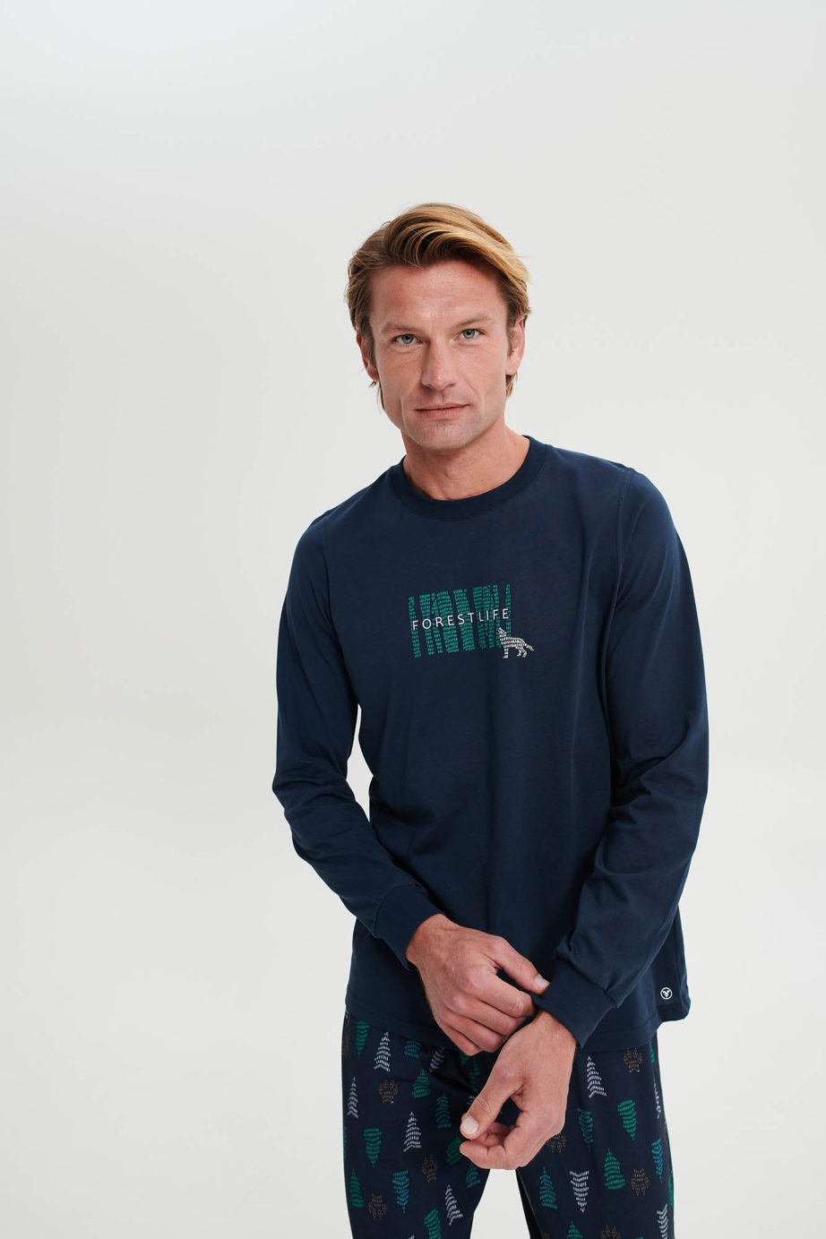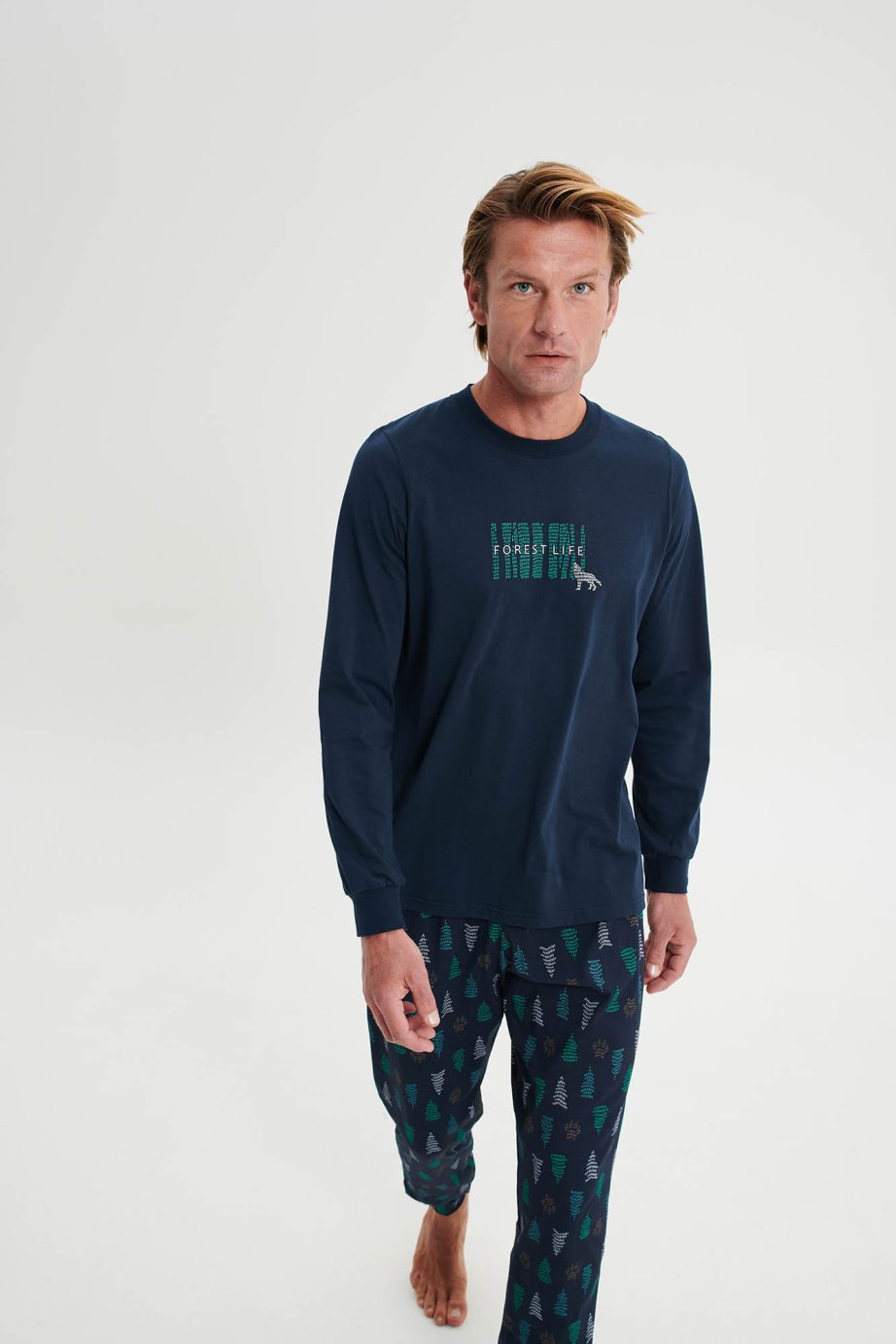 Мъжка пижама с кръгло деколте, ръкави с маншети и панталони с маншети. Комфорт през целия ден, с приятно внушение, изработено от мек памук.
