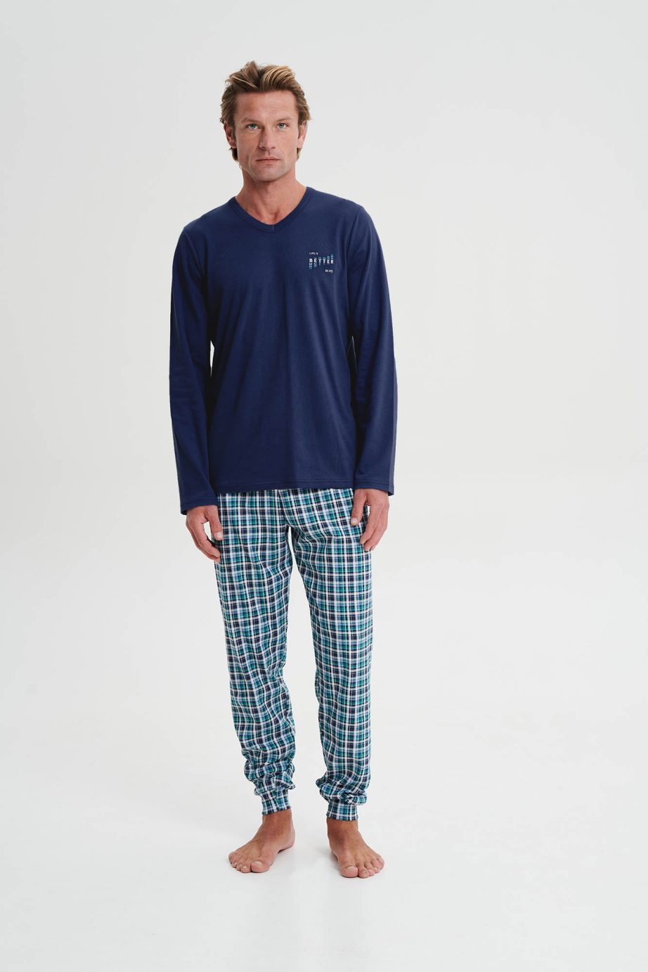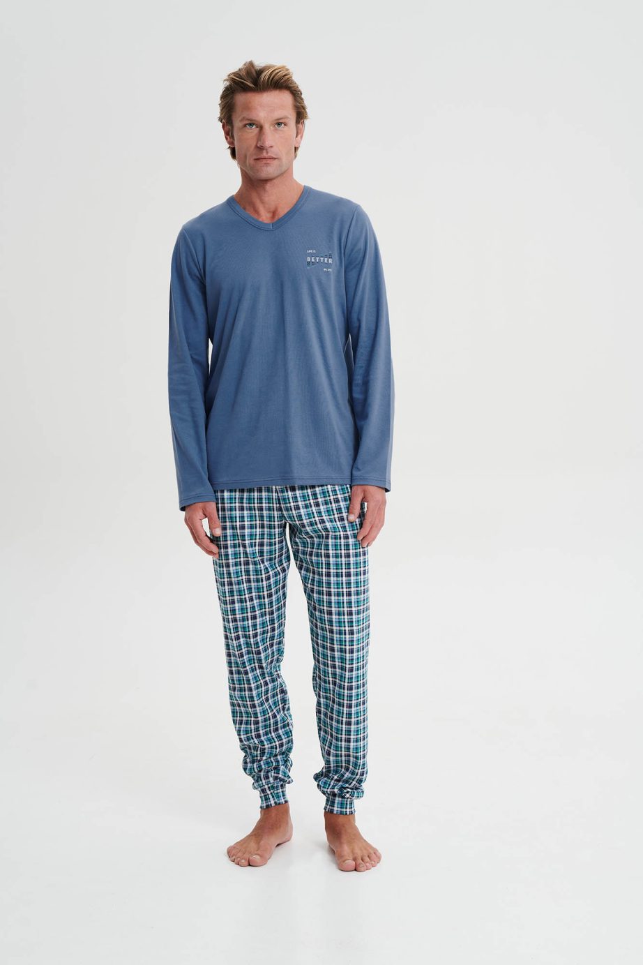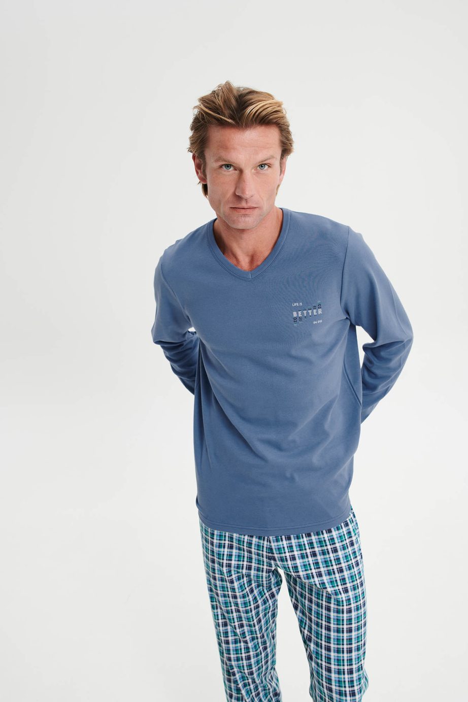 Мъжка пижама с кръгло деколте, гладка горна част и кариран панталон с маншети. Вечно актуално, памучно предложение в сини нюанси.