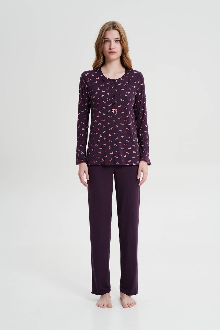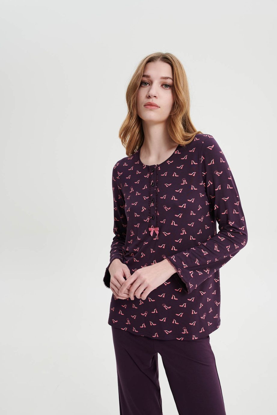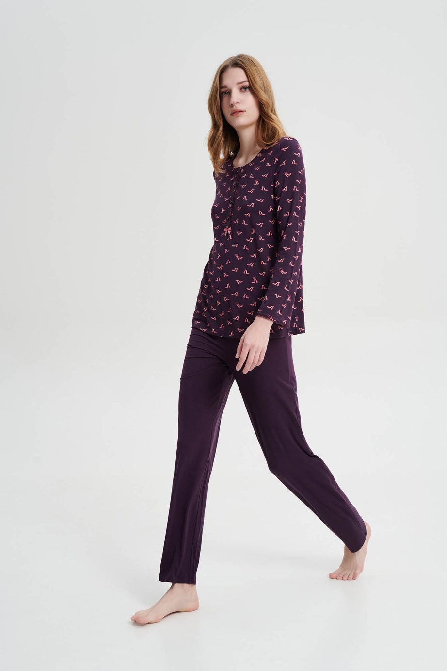 Дамска пижама с копчета и обикновен дълъг панталон в свободна кройка. Приятно предложение с щампи, което ще придаде комфорт и стил на времето, прекарано у дома.
