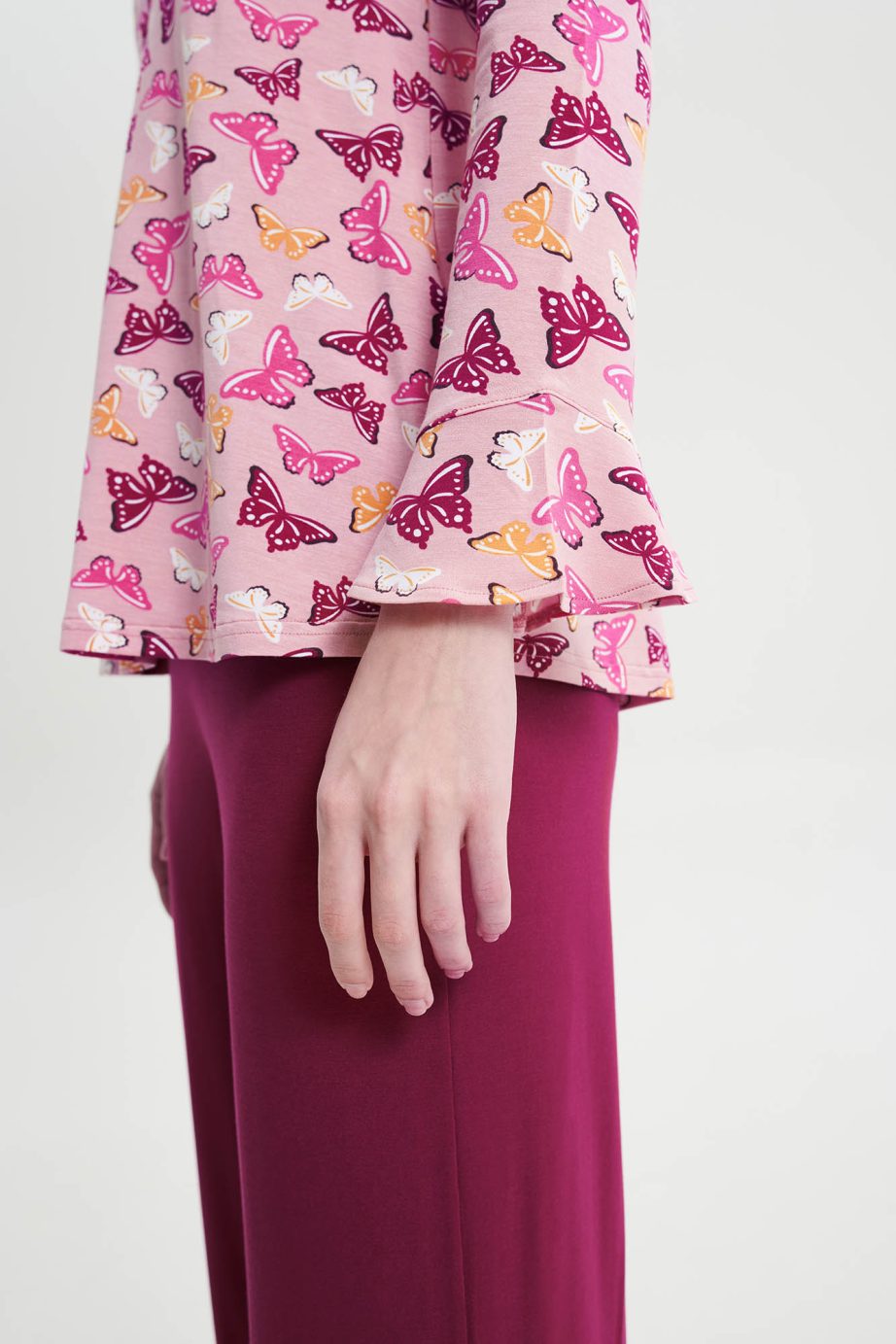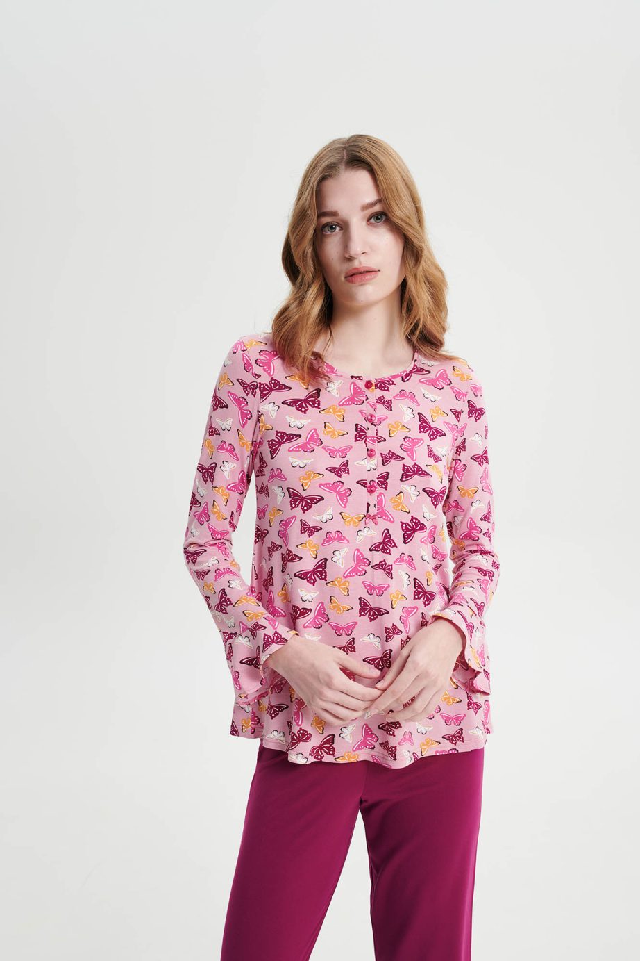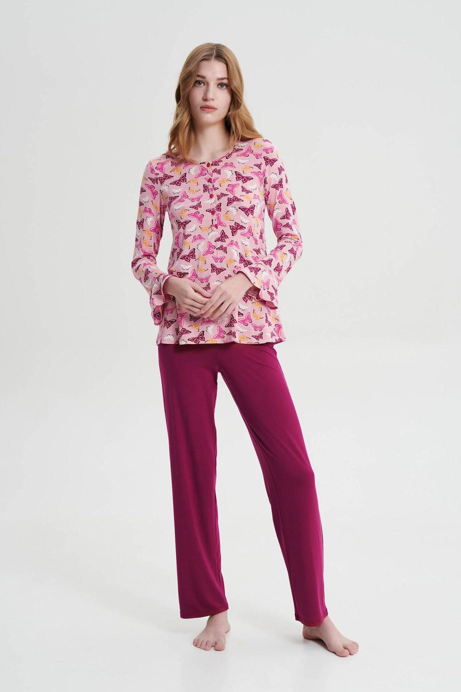 Пижама за жени с копчета и гладки панталони. Изработена е от мека на допир материя, която осигурява комфорт и елегантност на моментите у дома.