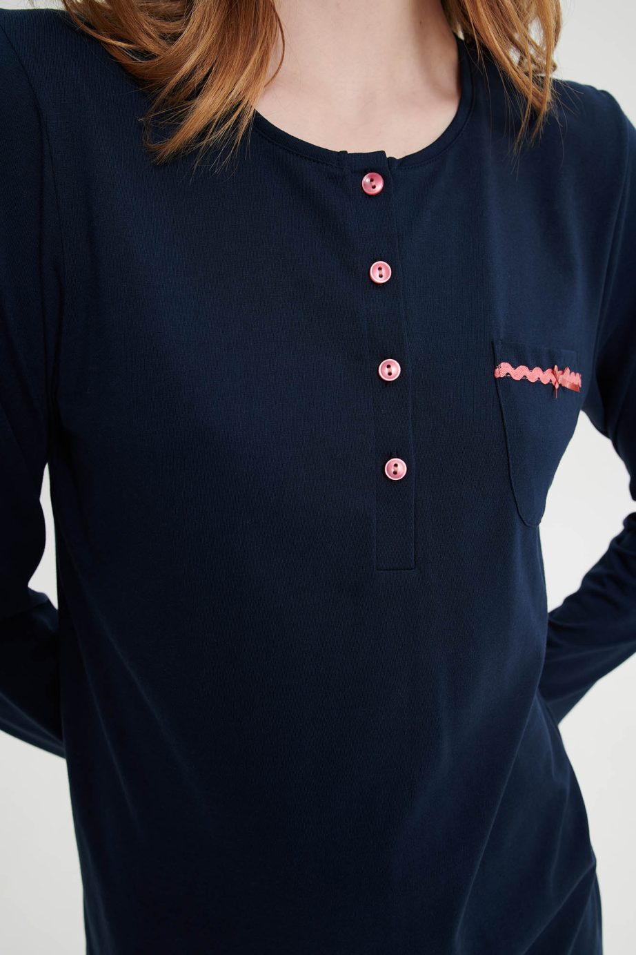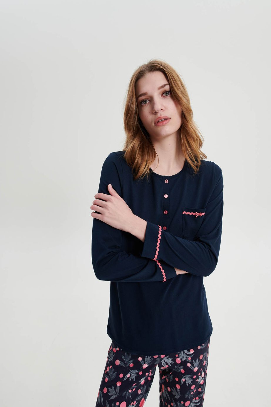 Дамска пижама с платка с копчета и плисе отпред за по-голямо удобство. Красива флорална щампа в тъмно сини нюанси с ярки детайли.