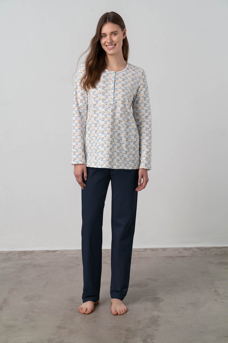 Дамска пижама с гладка, дълга долна част и закопчалка. Изработена от пуловер от памучен полар, тя ще ви осигури комфорта, който заслужавате у дома.