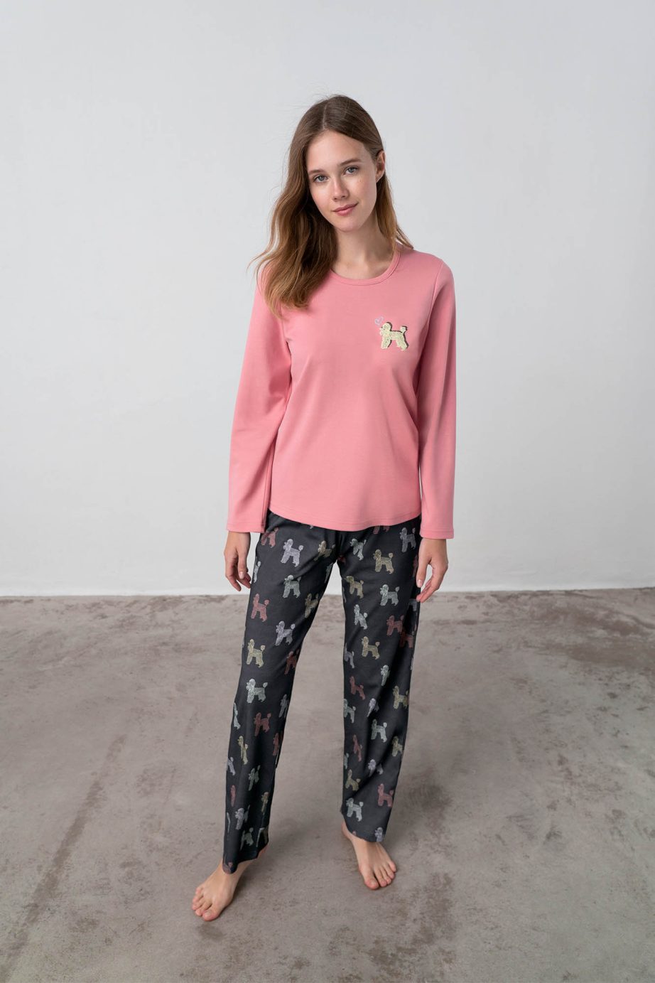 Дамска пижама с кръгло деколте, дълги ръкави и панталони с щампи. Удобно предложение, на което ще се радвате през студените зимни дни.