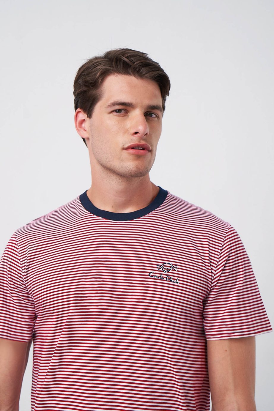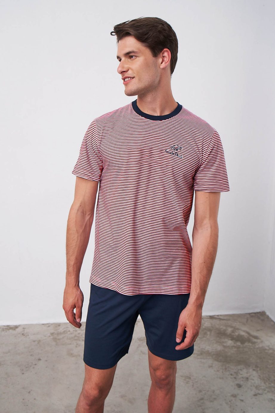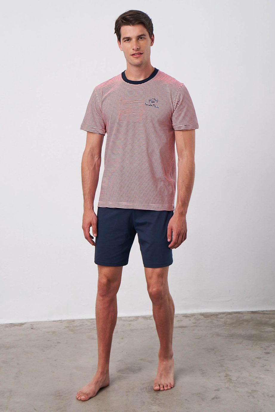 Мъжка пижама с горнище на райета, къси ръкави, кръгло деколте и едноцветни къси панталони. Изработена е от прохладен, мек памук и ще ви накара да се чувствате комфортно през целия ден.