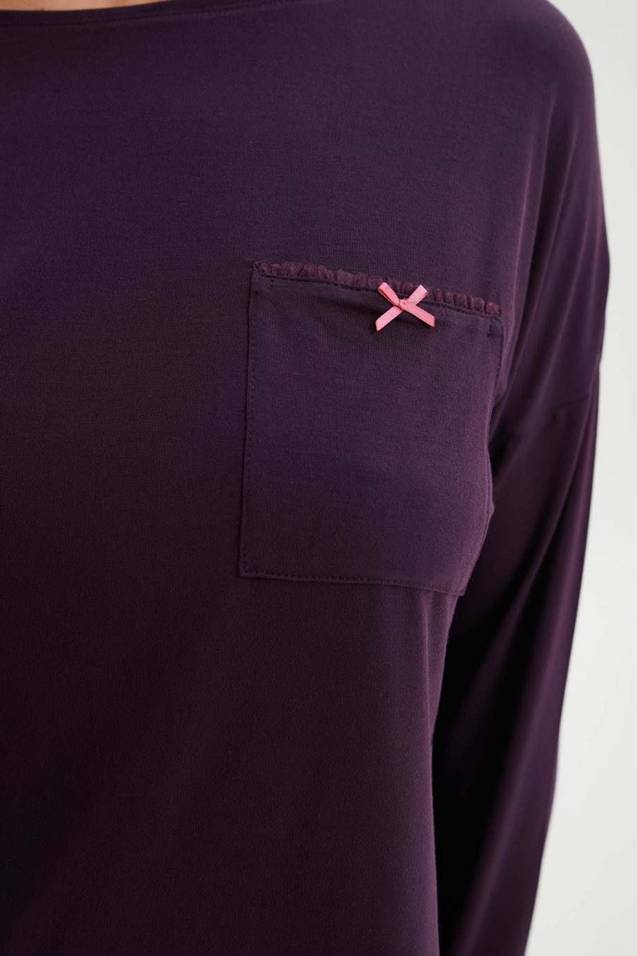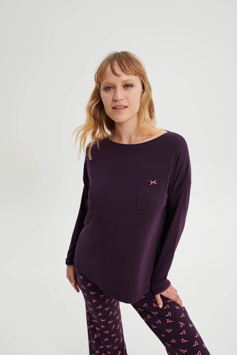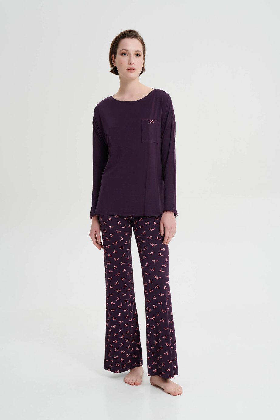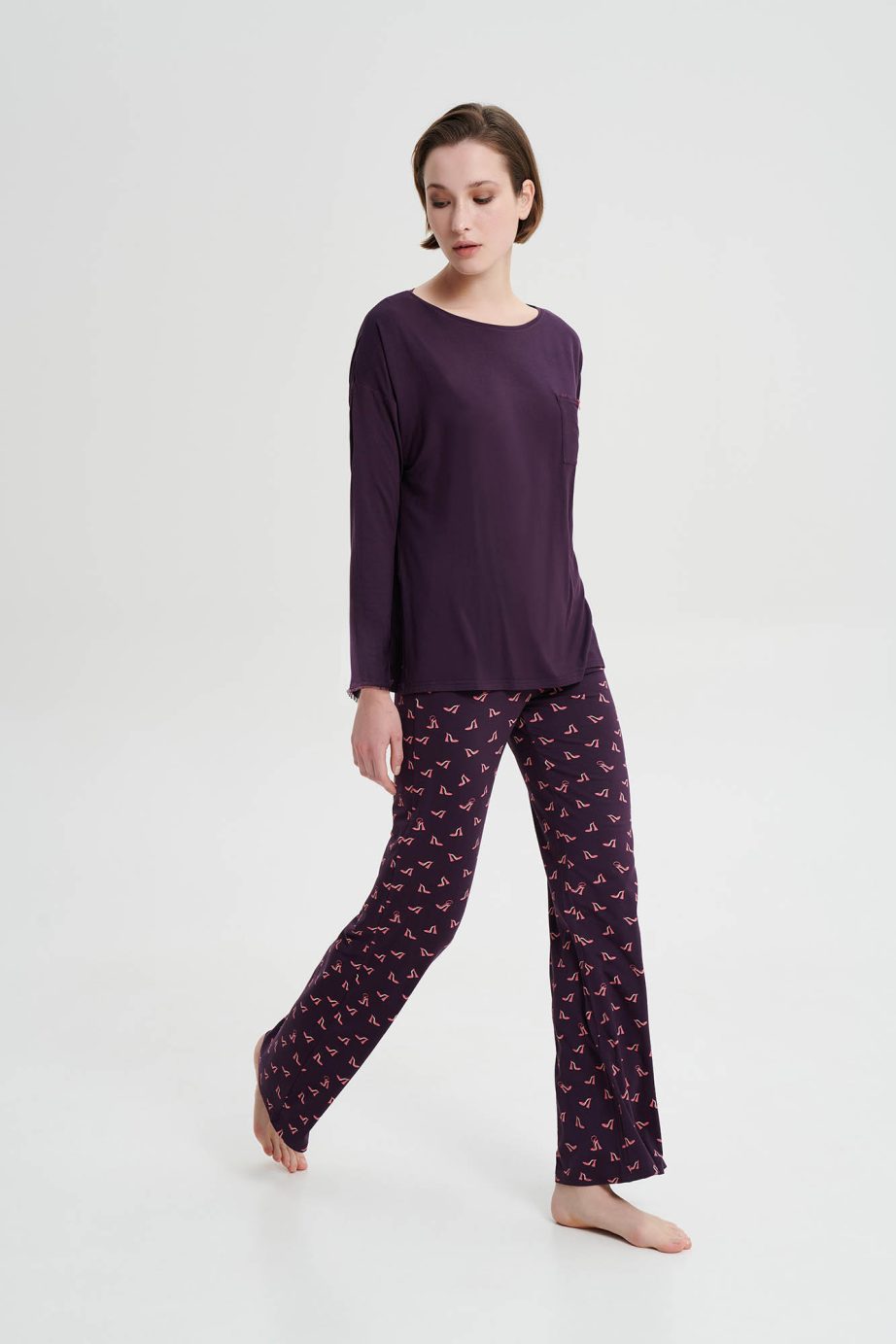 Дамска пижама с широко деколте, отличителен джоб и панталон с щампа и камбанка. Приятно предложение, което ще придаде комфорт и стил на времето, прекарано у дома.