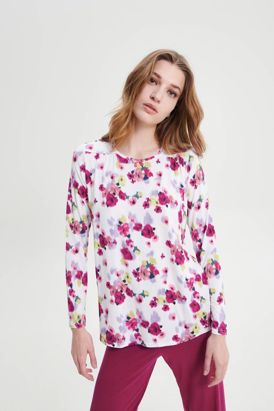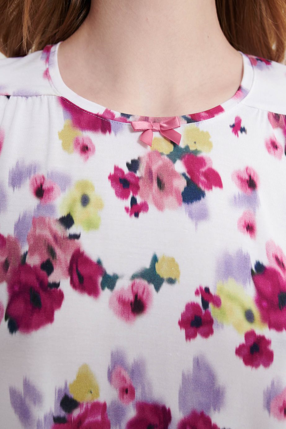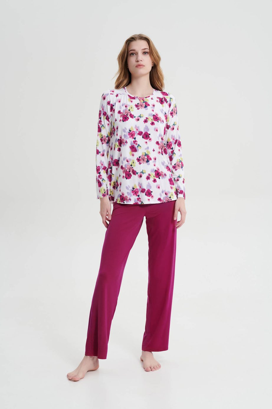 Дамска пижама с кръгло деколте и дълъг обикновен панталон в свободна кройка. Неостаряващ флорален принт, изработен от мека на допир материя, ще ви през деня.