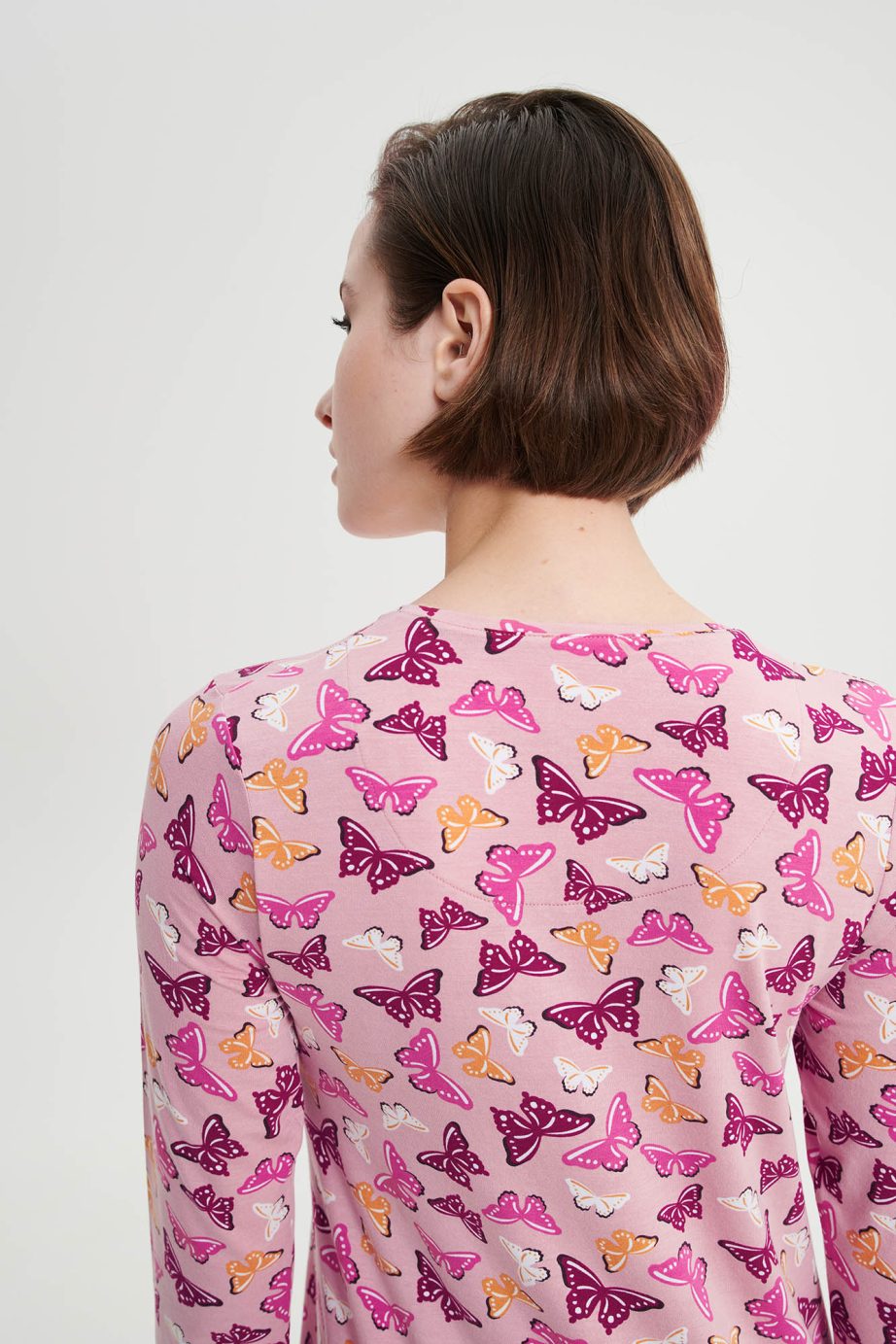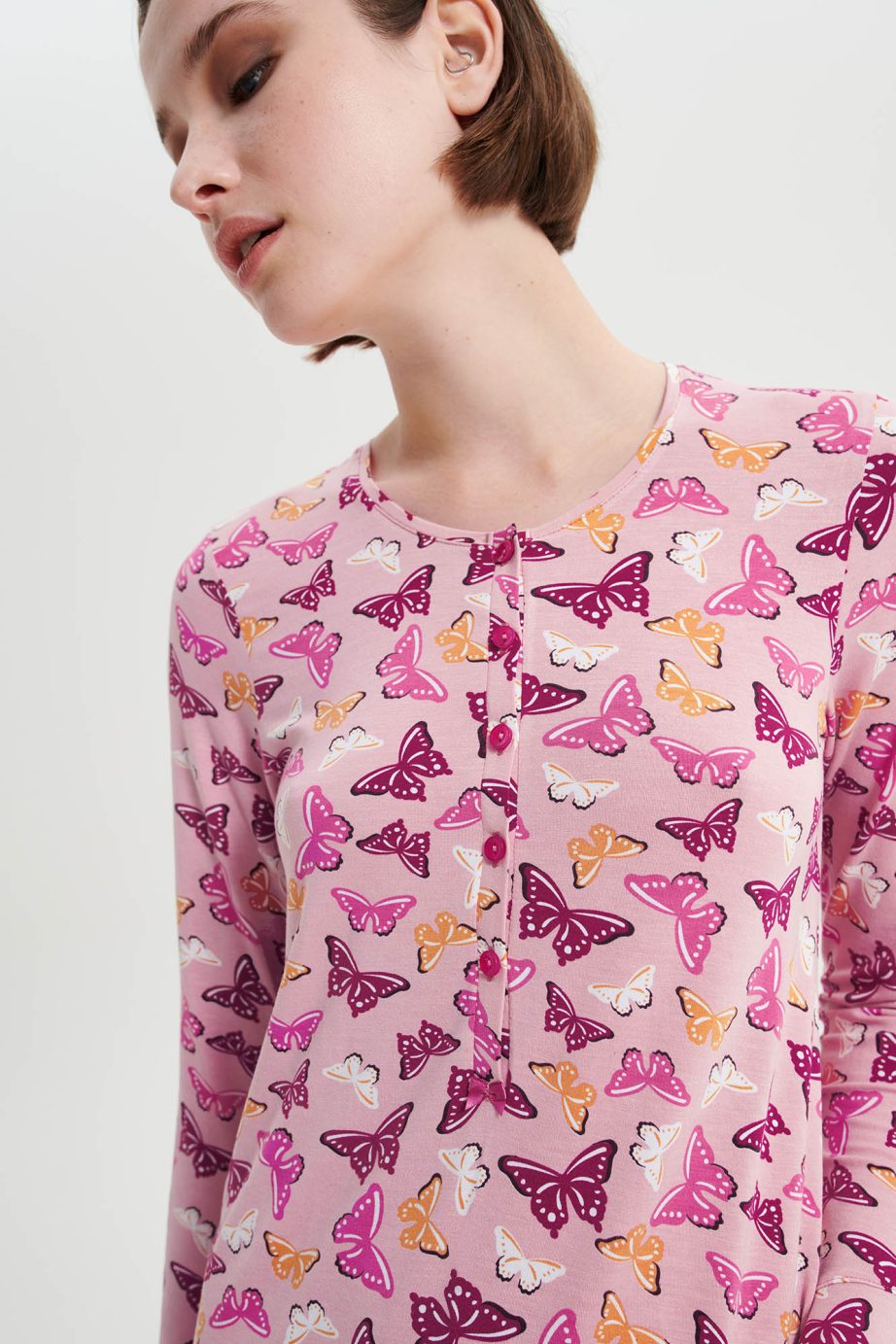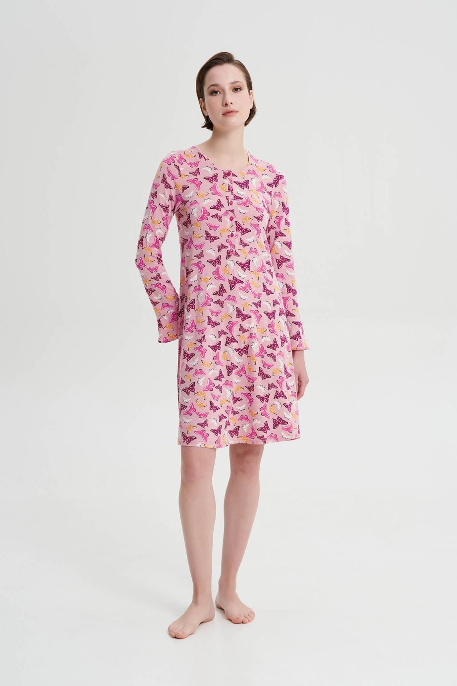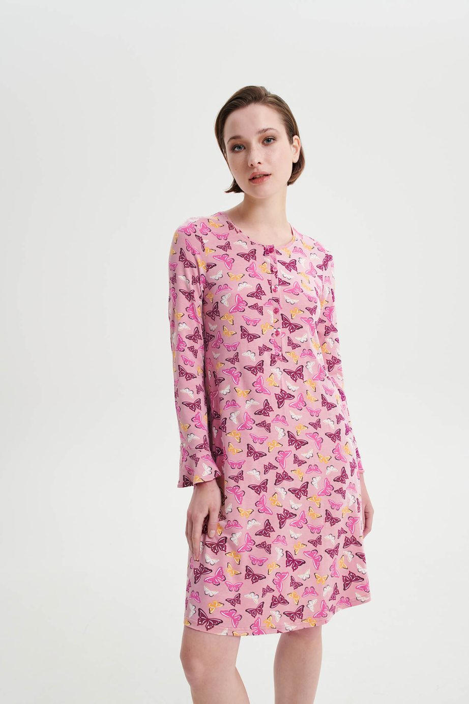 Нощна риза с щампа, закопчана с копчета и дълги ръкави в свободна кройка. Изработена е от мека на допир материя, която осигурява комфорт и елегантност на моментите у дома.