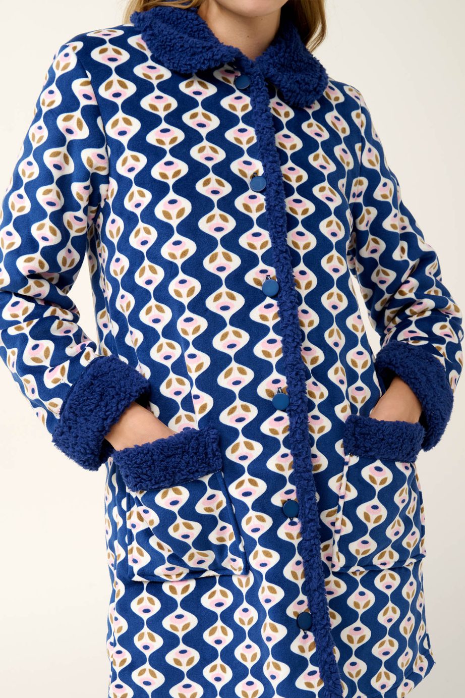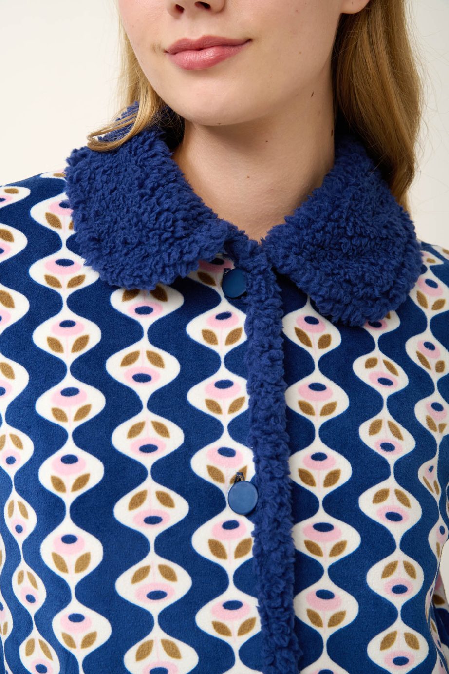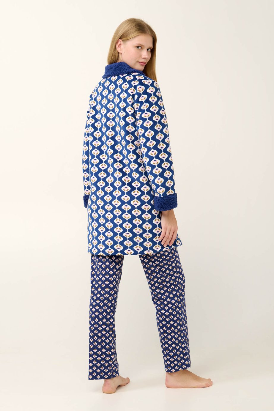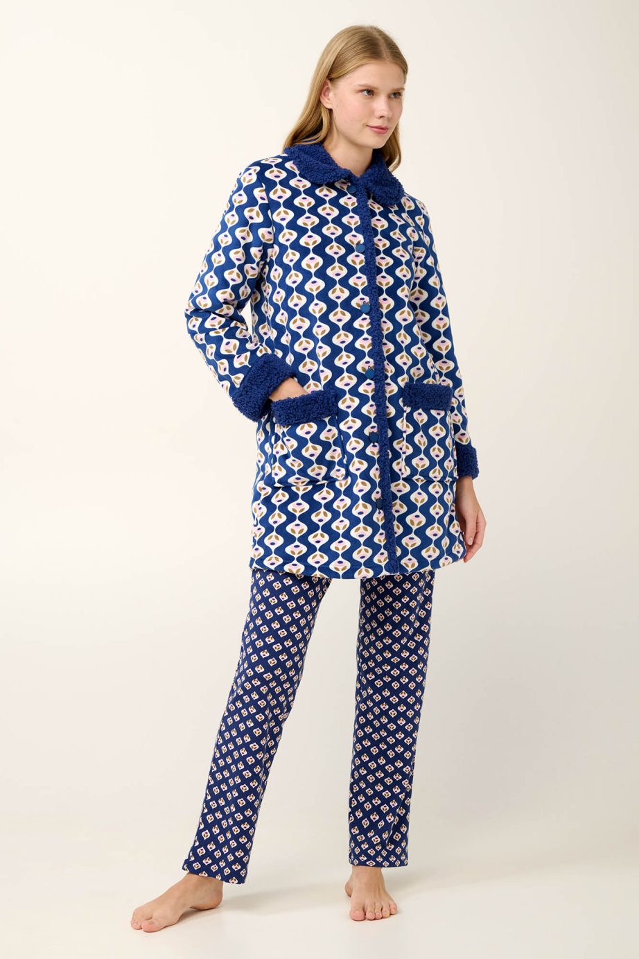 Приемете топлина и стил с нашия дамски халат. Изработен от 100% фланел флиис, този халат предлага изключителна мекота. Очарователният принт добавя нотка елегантност, а предната част с цип осигурява удобство. Практичните джобове и уютните маншети увеличават функционалността, а класическата яка придава изискан завършек. Перфектен за хладни вечери или спокойни сутрини, този халат съчетава удобство с вечен чар.