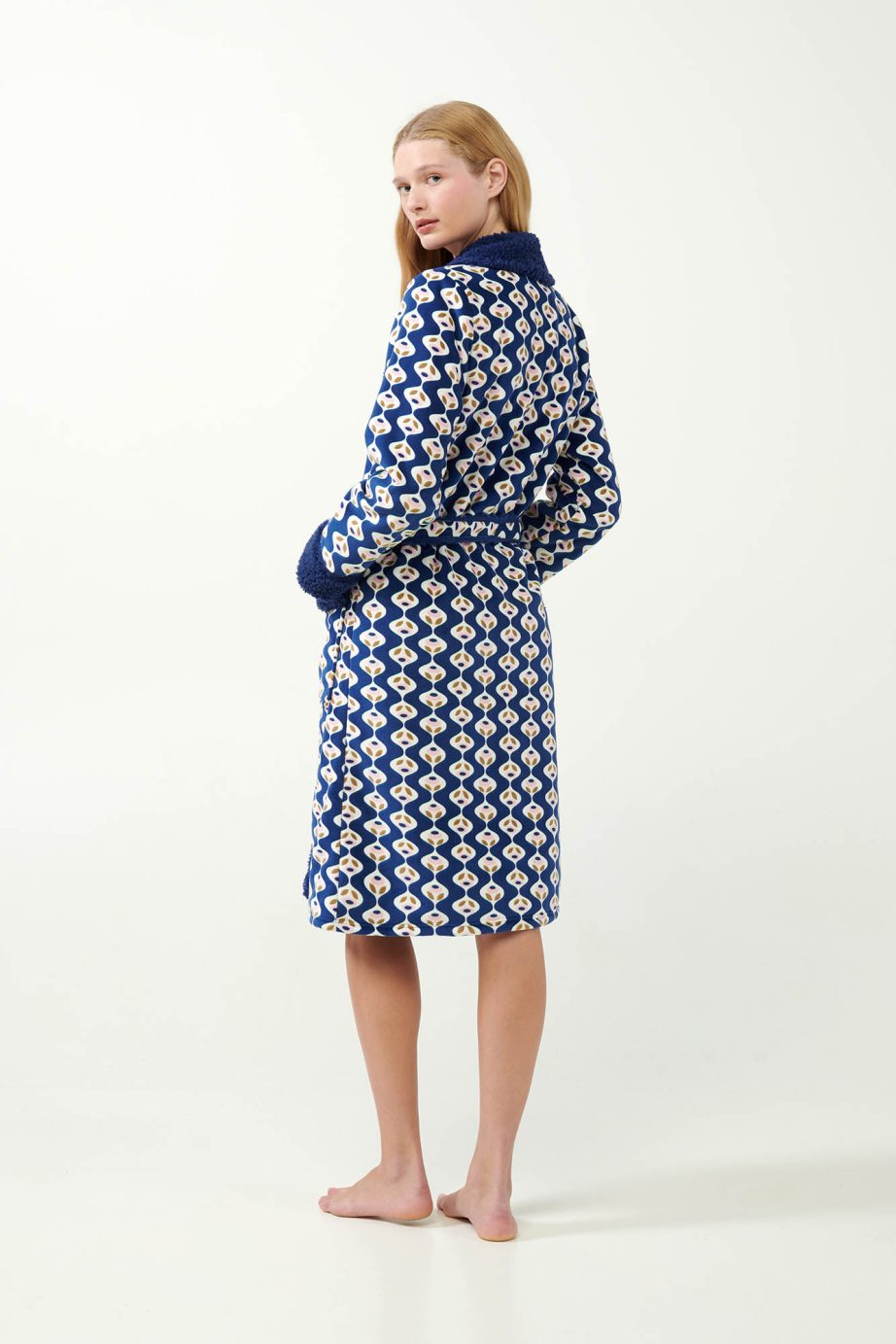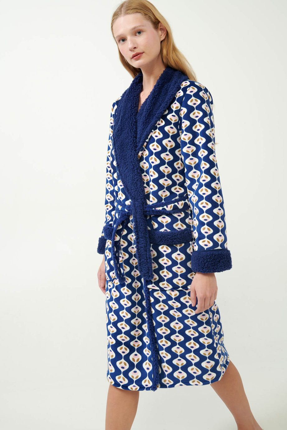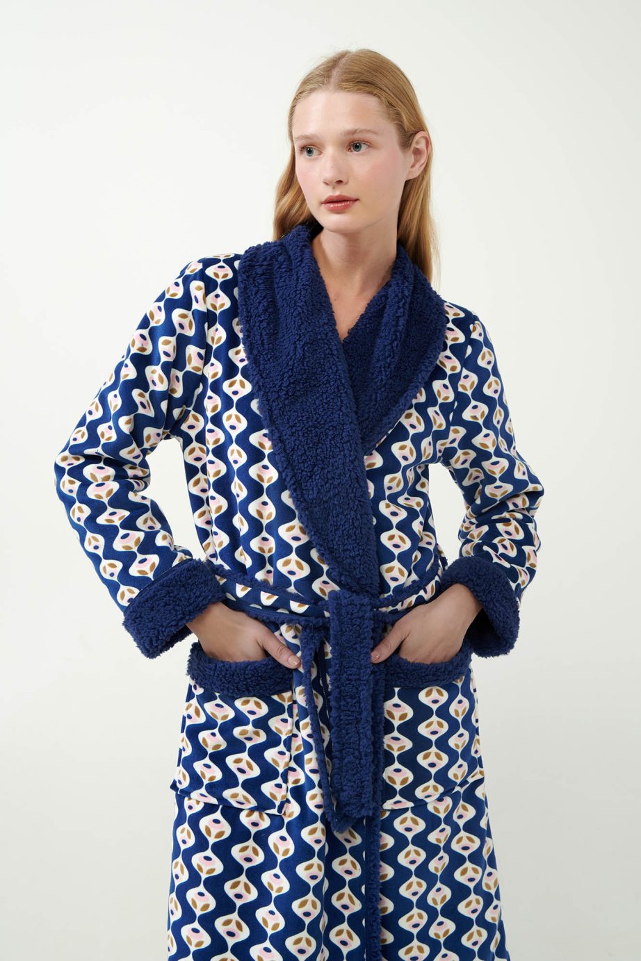 Изработен от 100% фланелен полар, този халат предлага ненадмината мекота и топлина. Елегантният кръстосан дизайн е с подходящ колан за прилягане по мярка, а очарователният принт добавя нотка чар. Практичните джобове и класическият ревер подсилват неговата функционалност и стил. Идеален за излежаване или релаксация у дома, този халат съчетава уютен комфорт с вечна привлекателност.