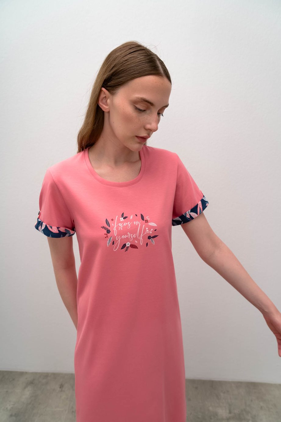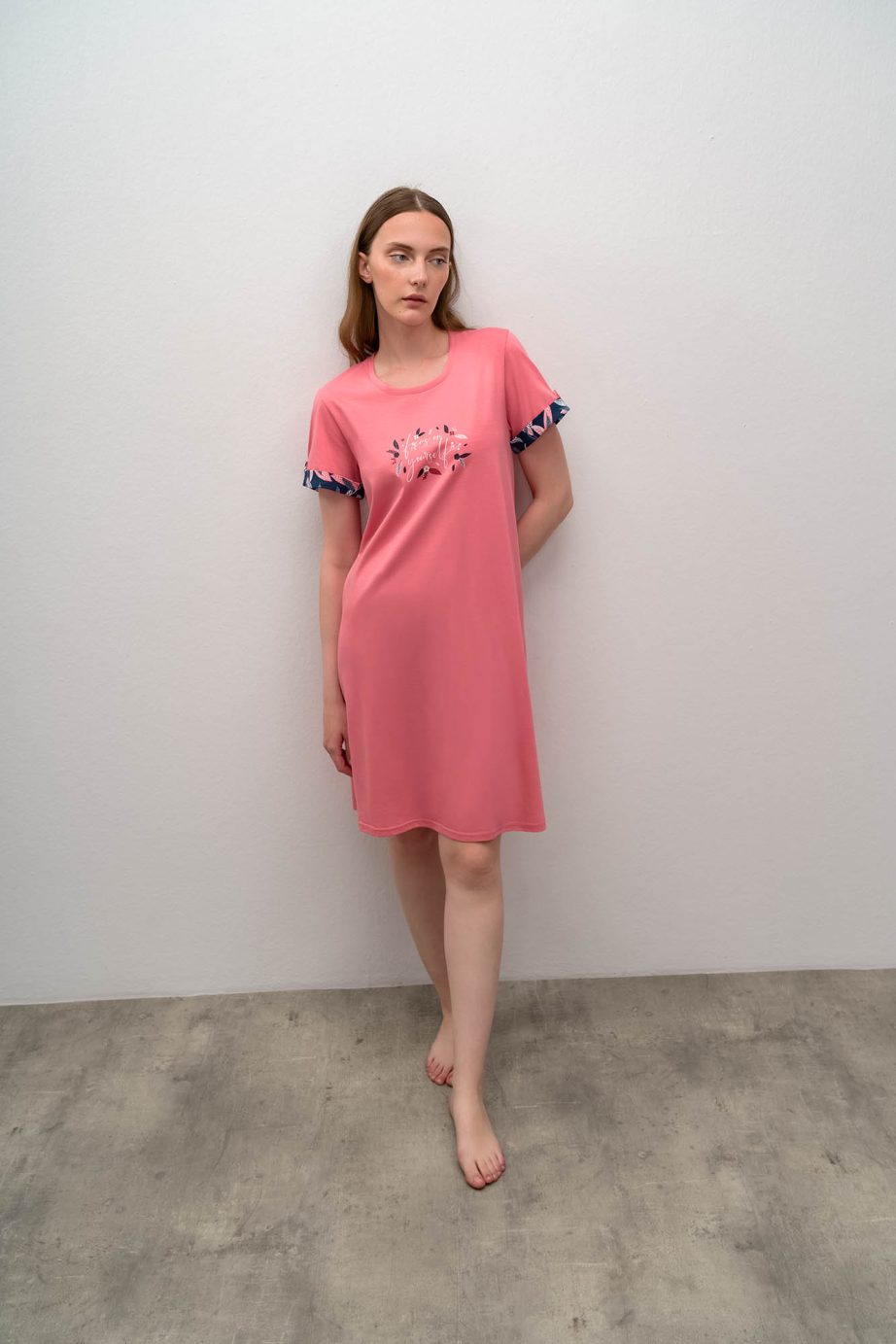 - Къс ръкав, нощница с щампа на гърдите и шарени детайли на ръкавите. Нощница, която ни кара да си спомняме летните времена заради живите си цветове.