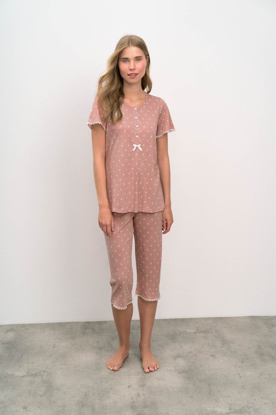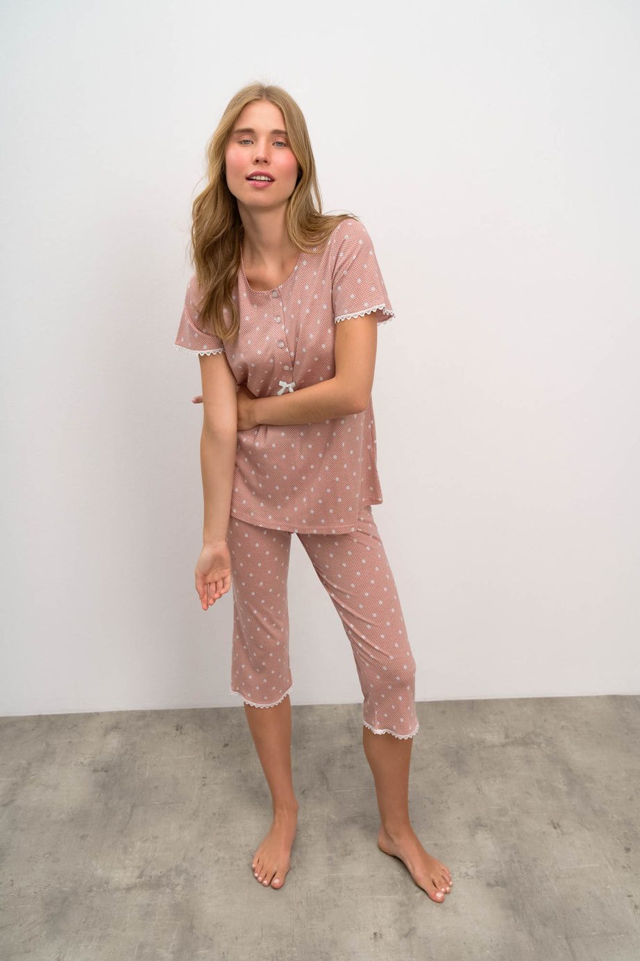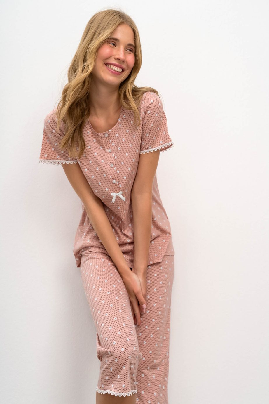 - Дамска пижама с къс ръкав на точки, с планка с копчета, къси ръкави и удобни капри панталони. Комплект пижама със специален дизайн.