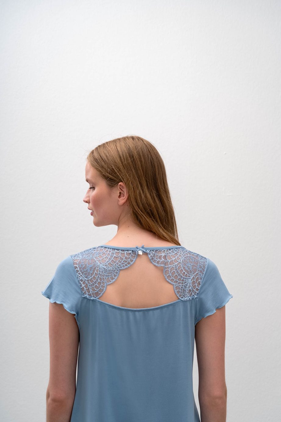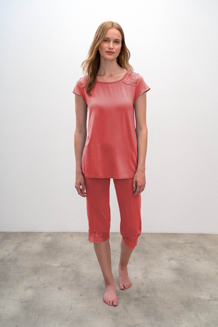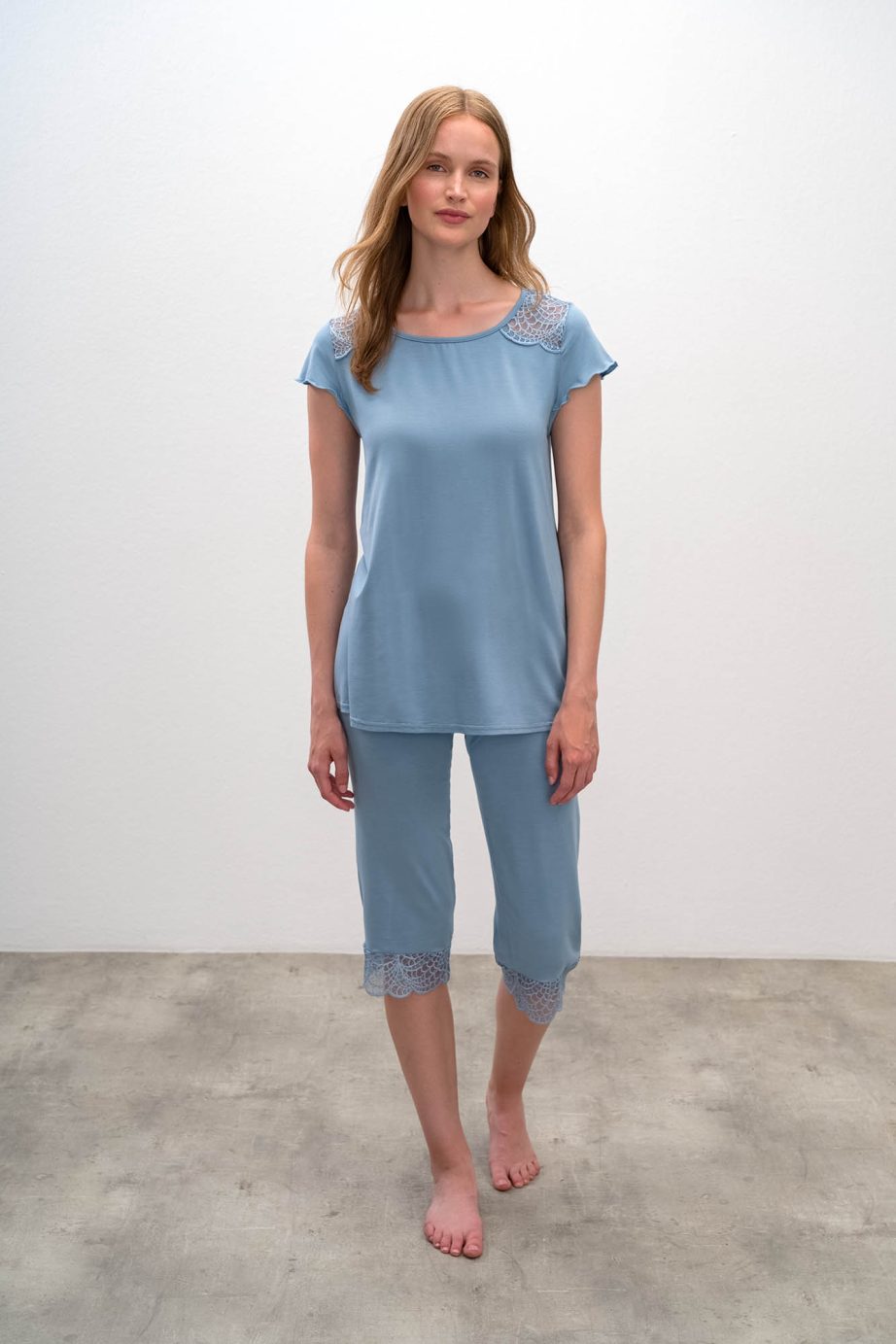 - Дамска пижама с детайли на раменете, гърба и прасците, 3/4-ти панталон. Дантелата, която е основен детайл на тази нощница, придава усещане за висок лукс.