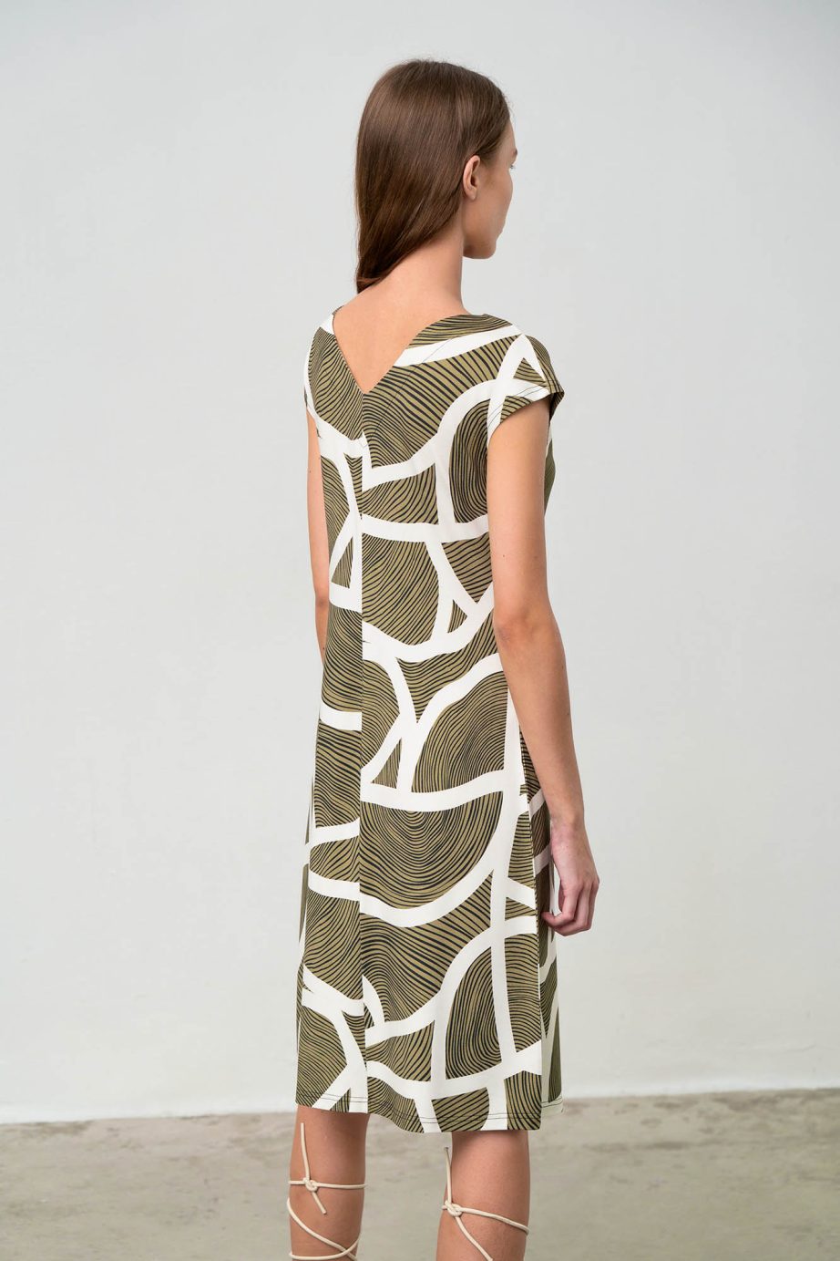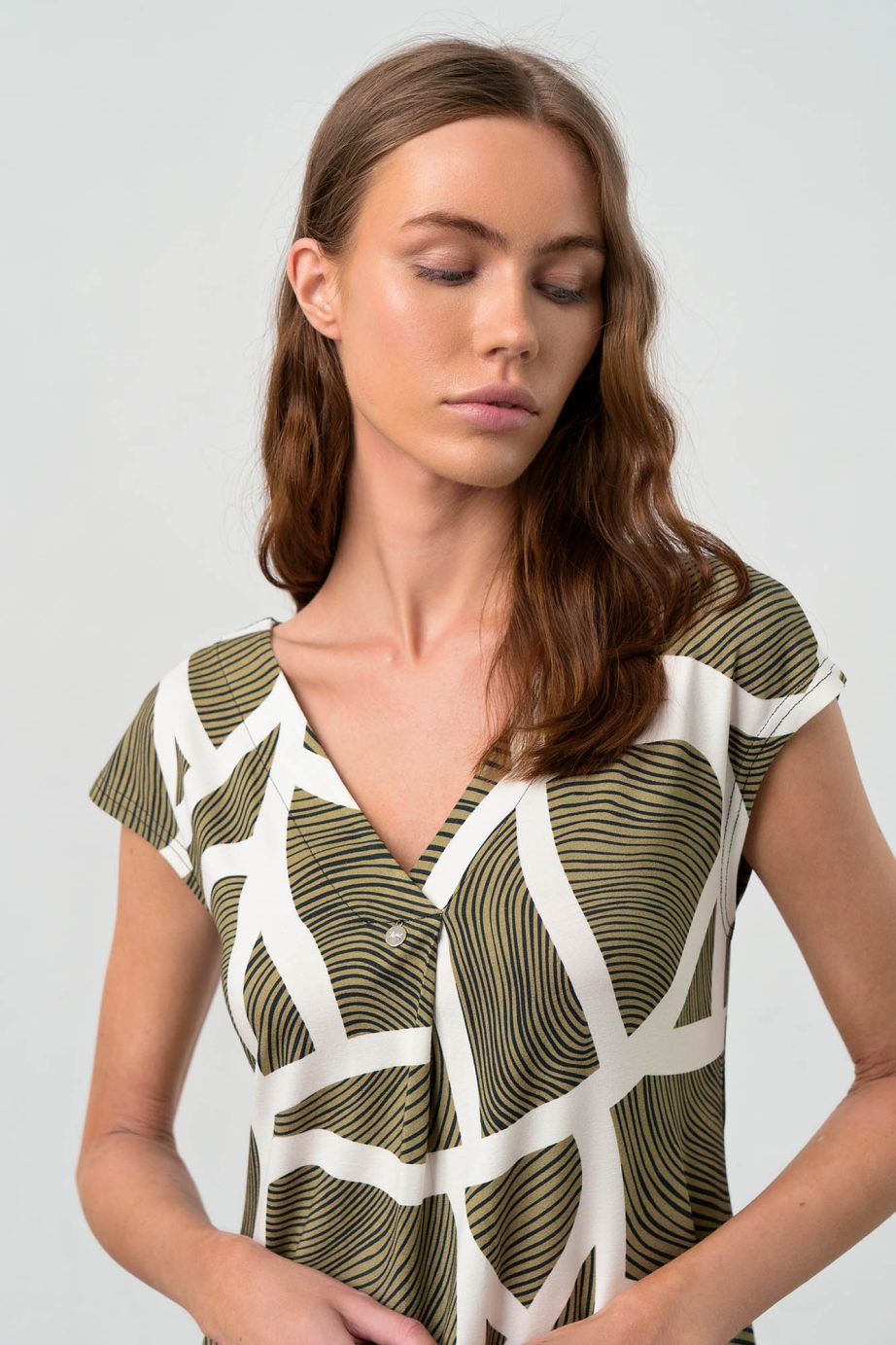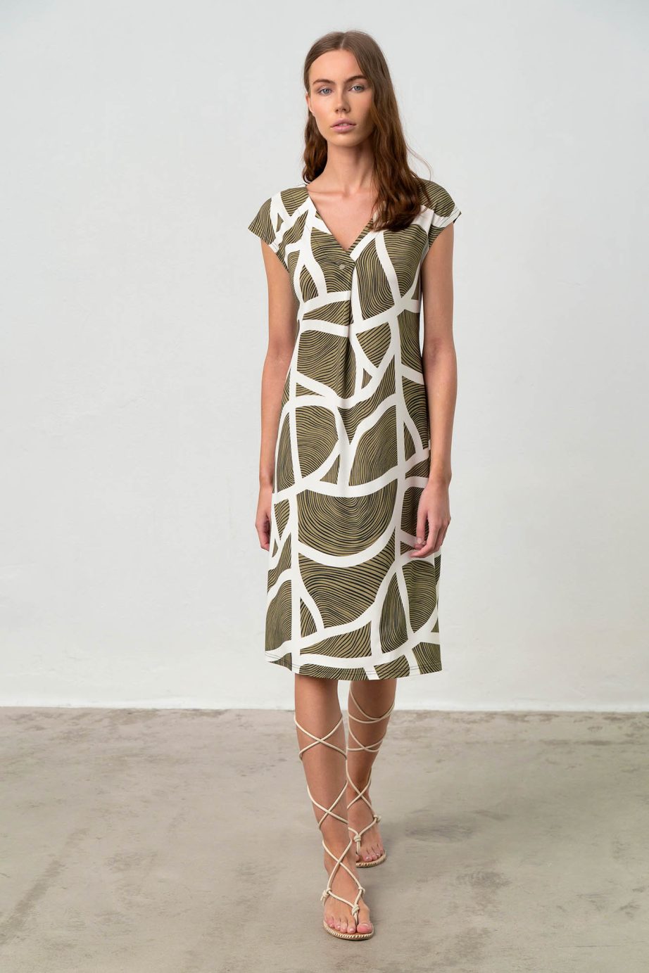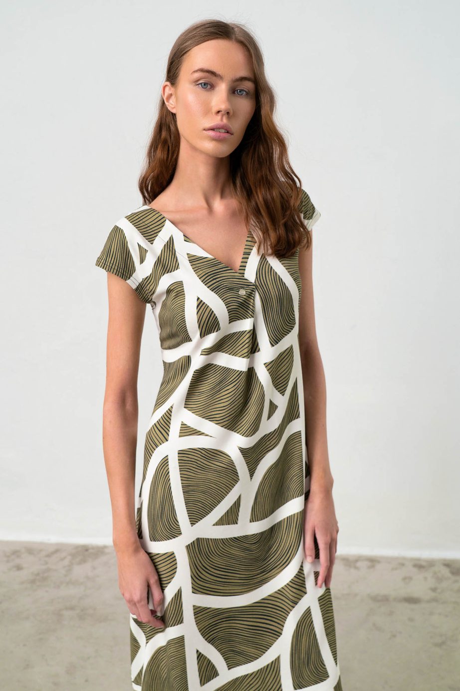 Роклята е с къси ръкави, V-образно деколте и плисе за допълнителен комфорт. Красиво предложение, което ще придаде комфорт и стил на лятната ви почивка.