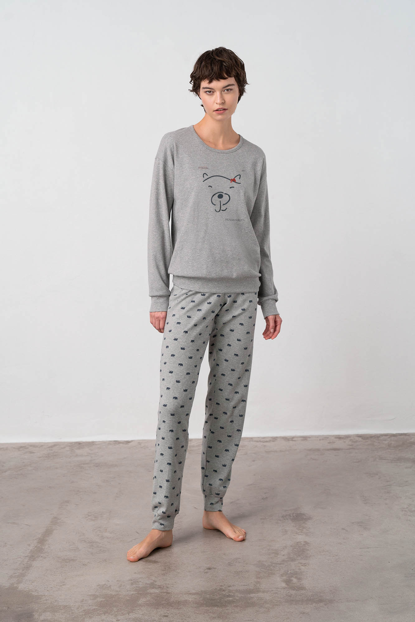 Дамска пижама с кръгло деколте, панталони с щампи и завършващи маншети. Забавният принт в мек памук, ще придаде комфорт на времето ви у дома.