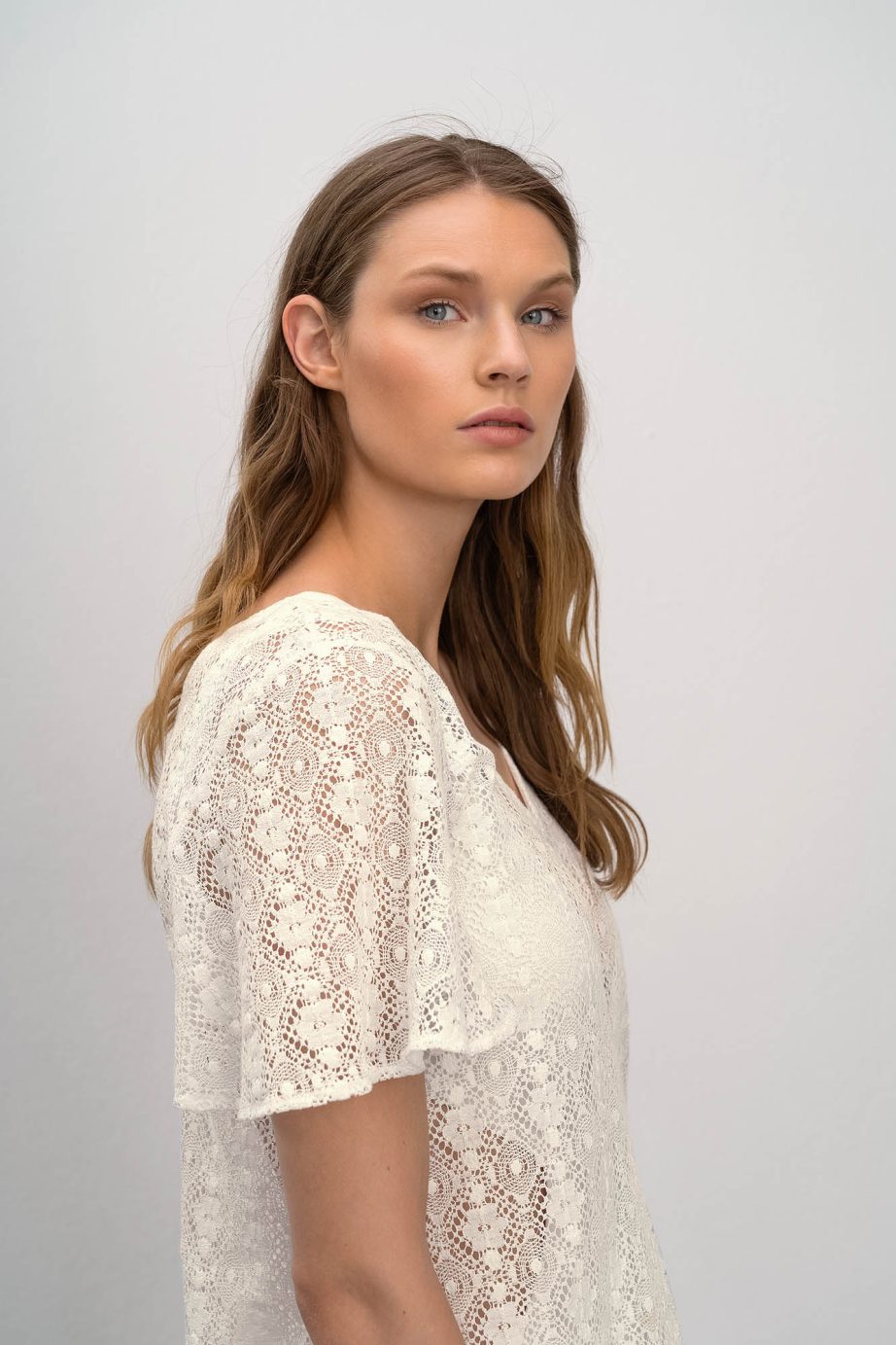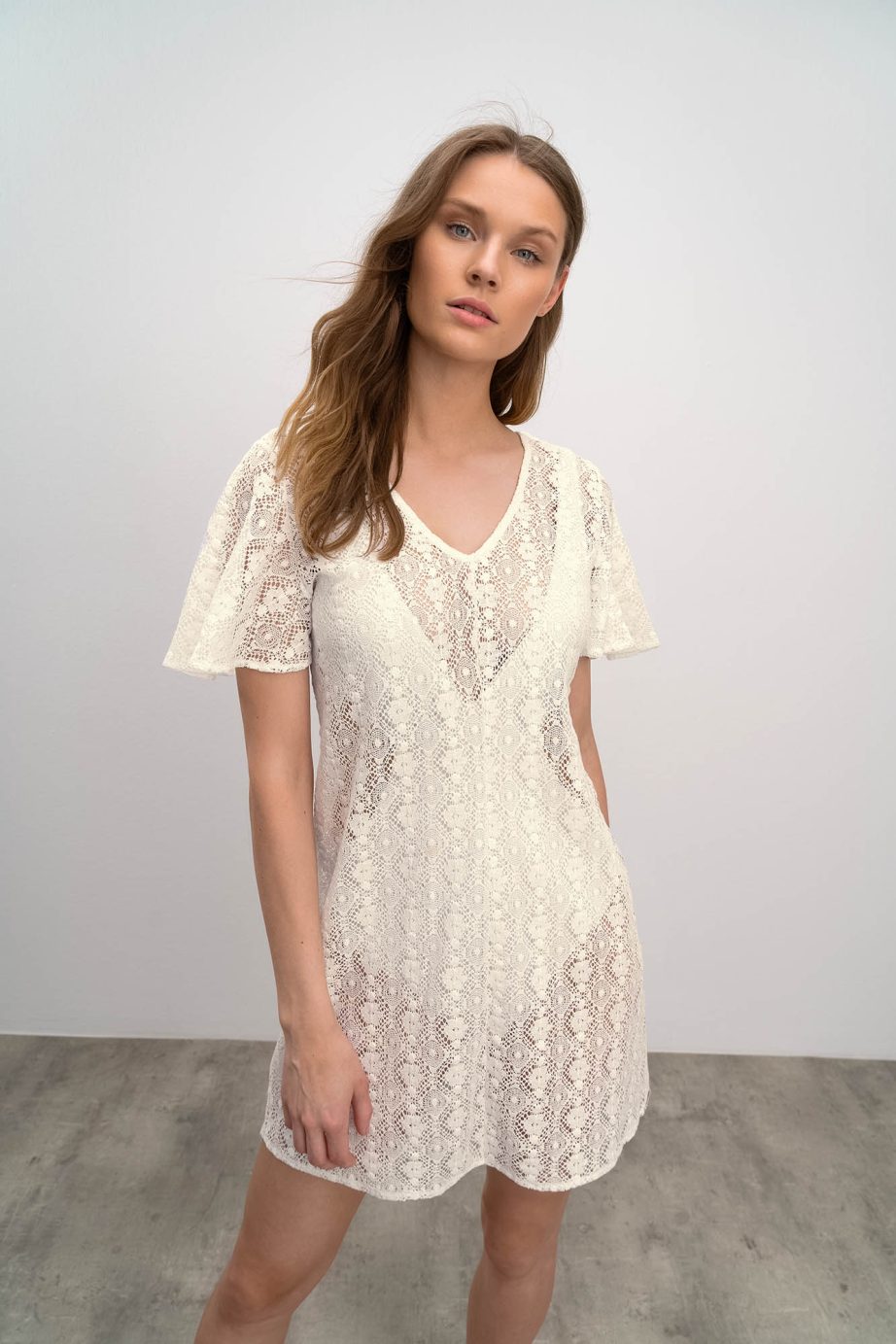 Рокля с къси ръкави и V-образно деколте. Изработена е от прохладна, перфорирана материя, може да се носи върху бански костюми по време на лятната почивка.