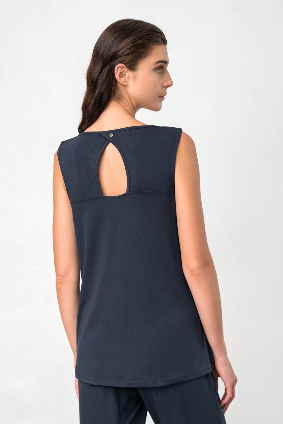 Топ без ръкави, с копче на гърба. Изработен от прохладна материя в удобна линия, този топ е идеален избор за лятната почивка или градския живот.