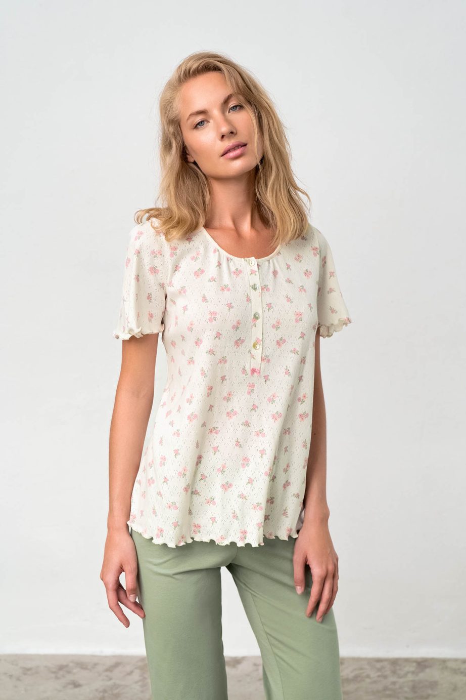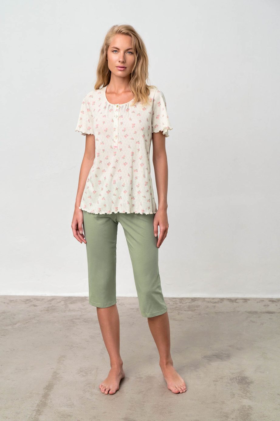 Woman’s pyjamas with short sleeves, button placket and capri pants. A classic floral print, made of cool cotton will offer you comfort during the day.
