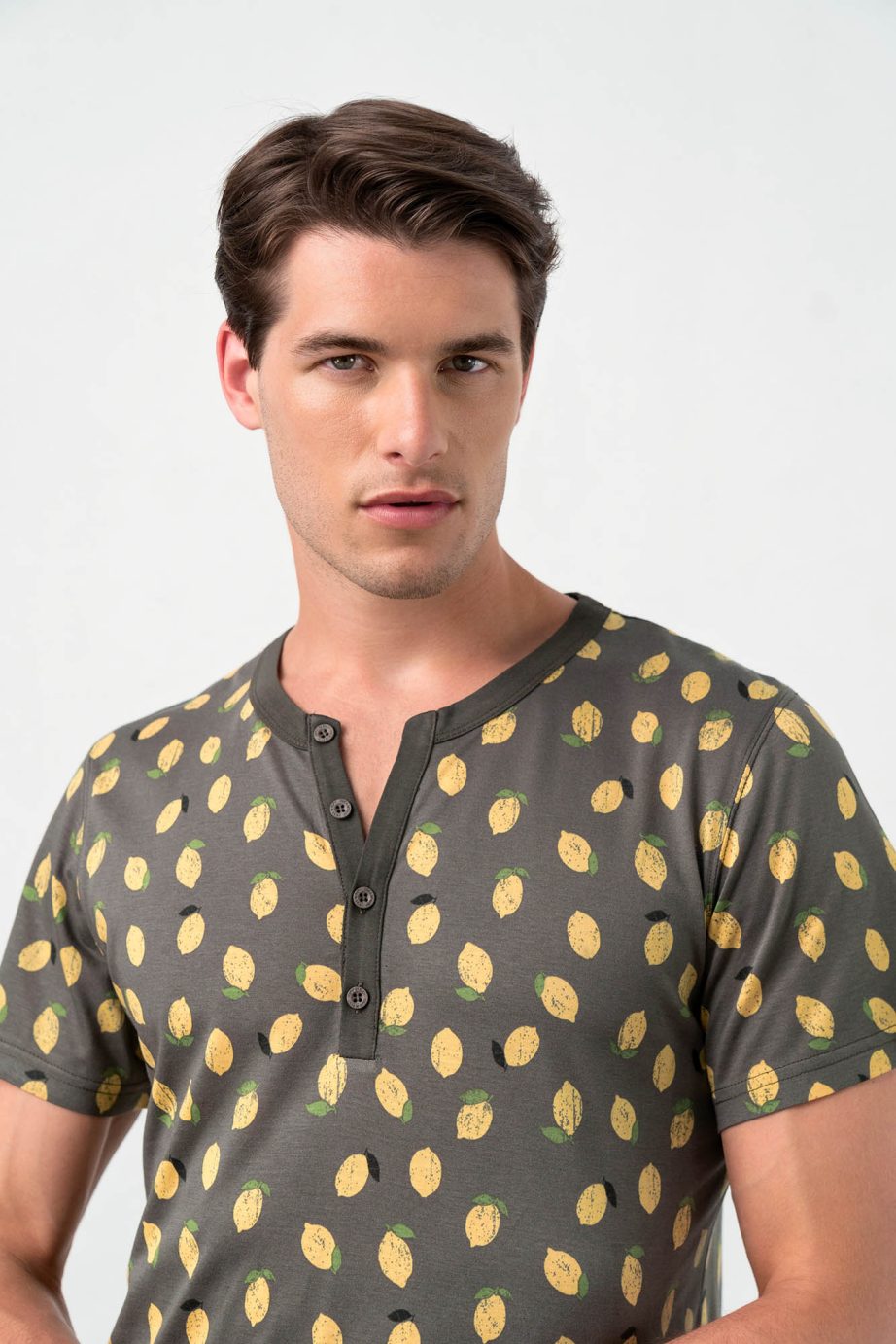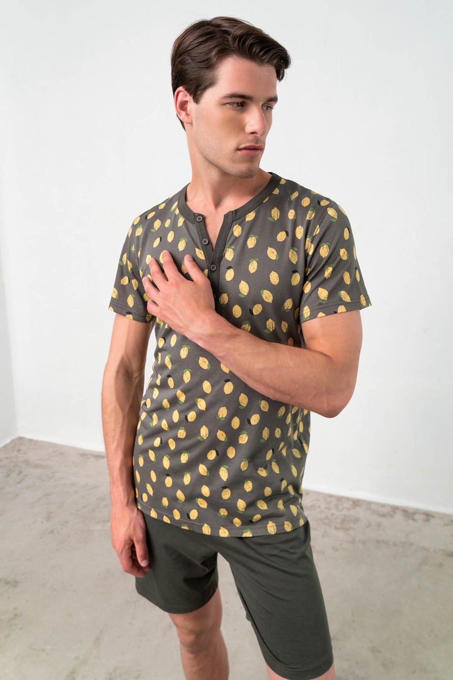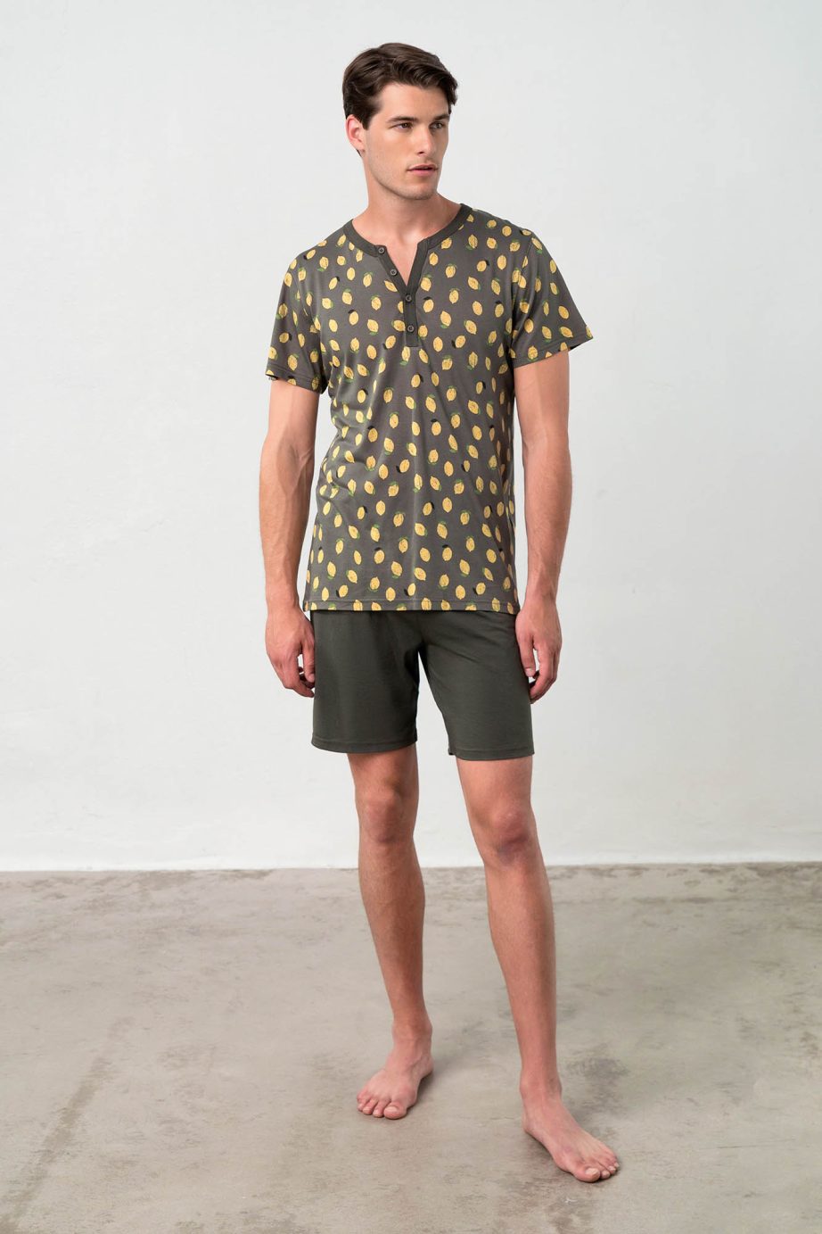 Мъжка пижама с щампована горна част с копчета и обикновен къс панталон. Приятно, лятно предложение за всеки момент от деня ви.