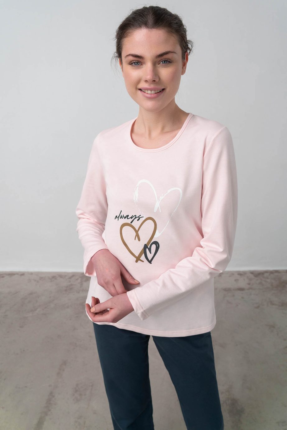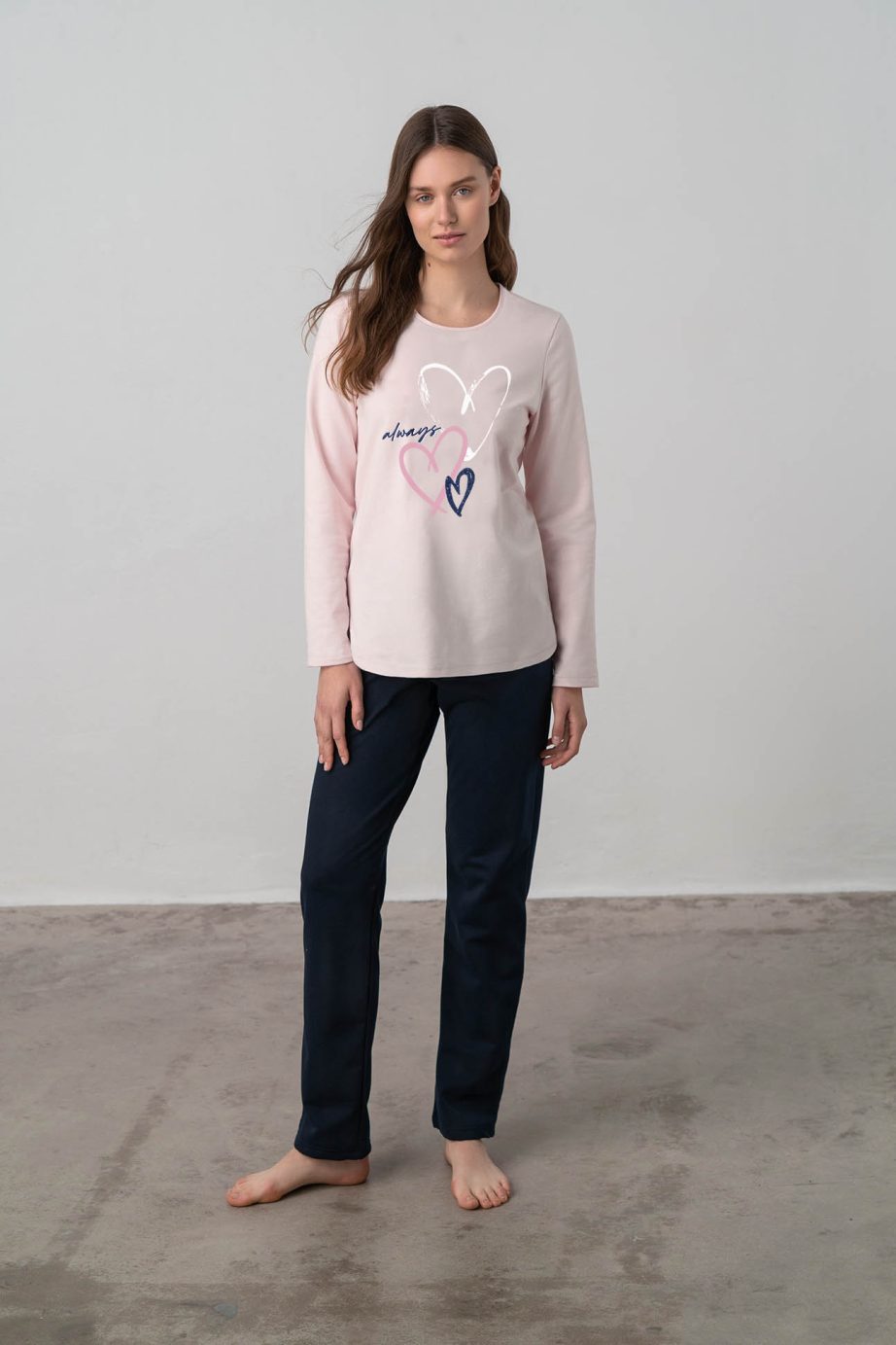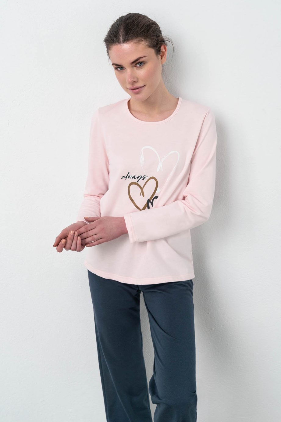 Дамска пижама с гладки панталони и топ с кръгло деколте. Изработена от мек на допир памук, ще придаде комфорт на времето ви у дома.
