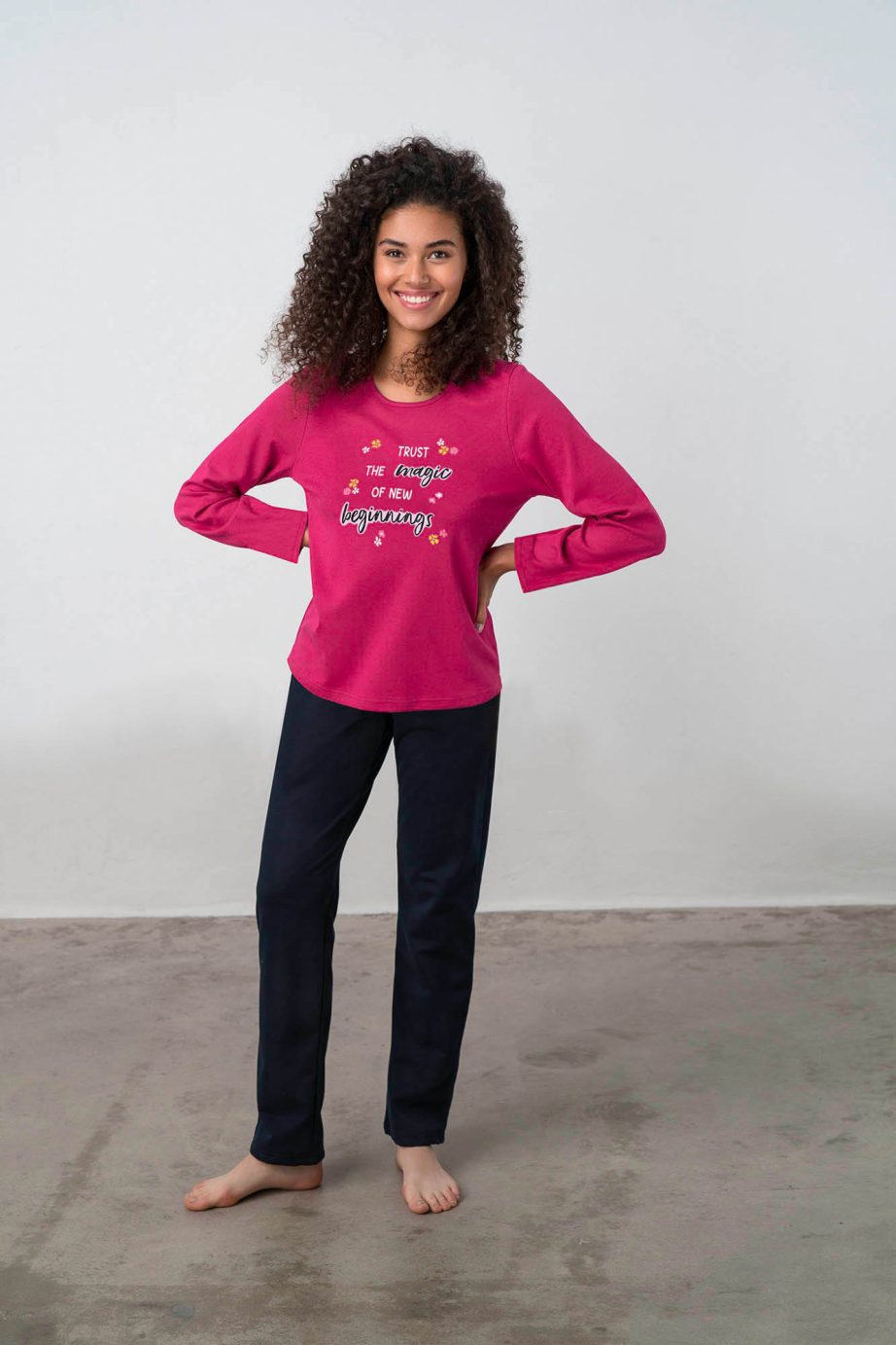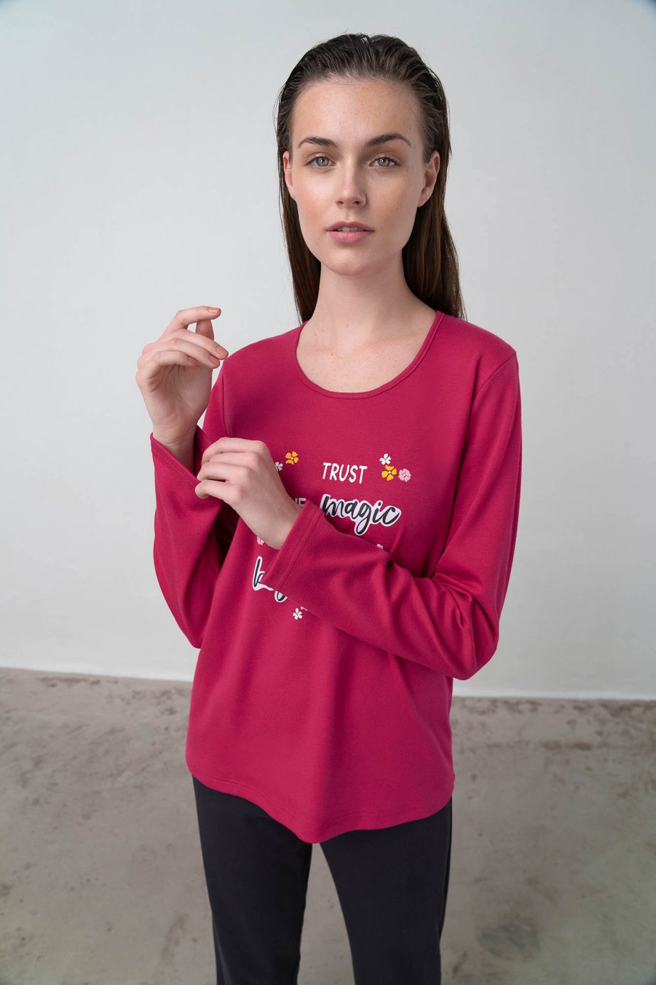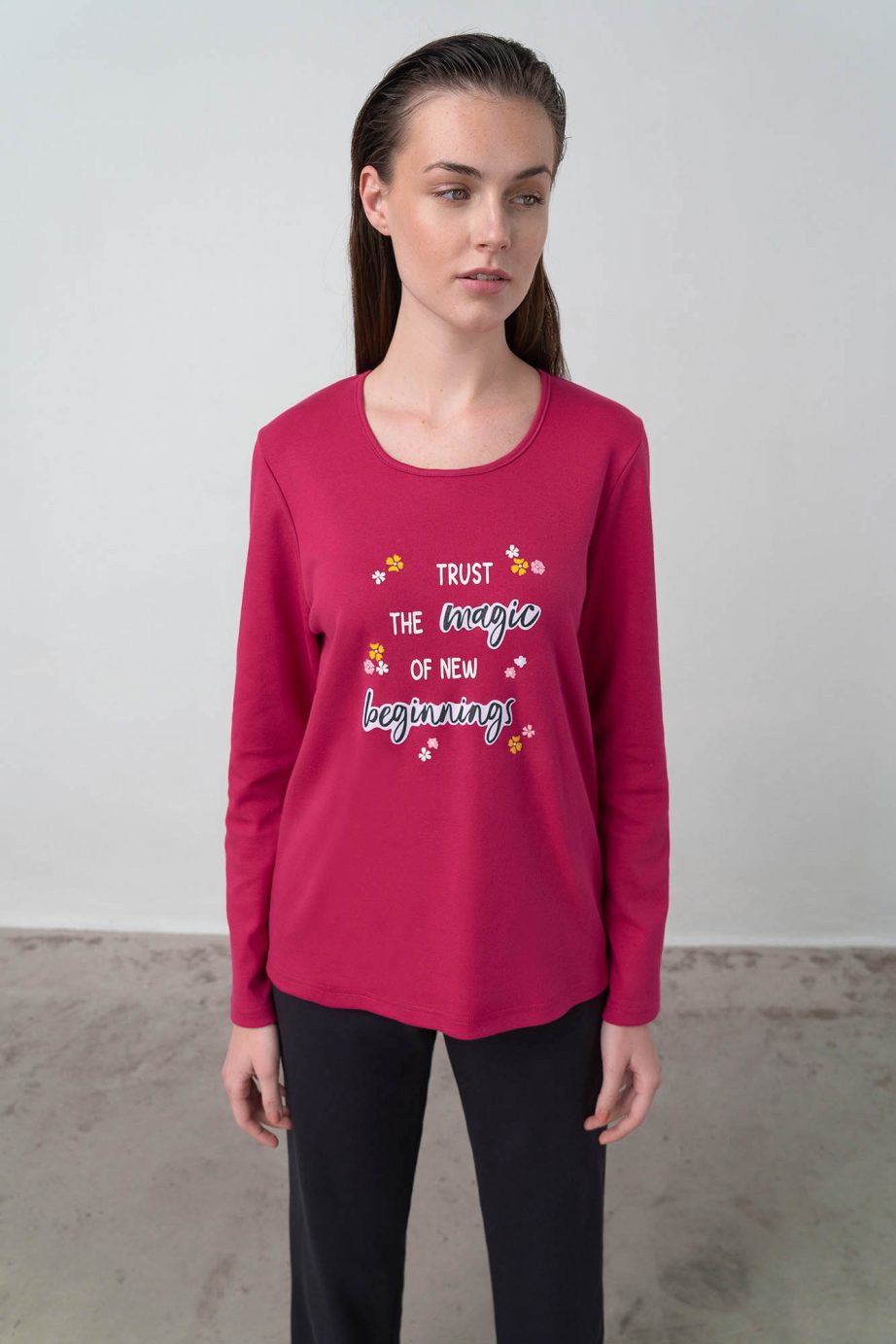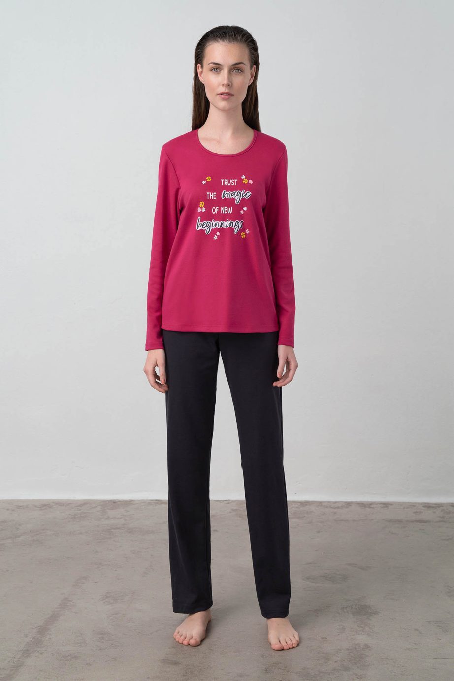 Дамска пижама с едноцветни панталони, горнище с щампа и кръгло деколте. Изработена от мек на допир памук, ще придаде комфорт на времето ви у дома.