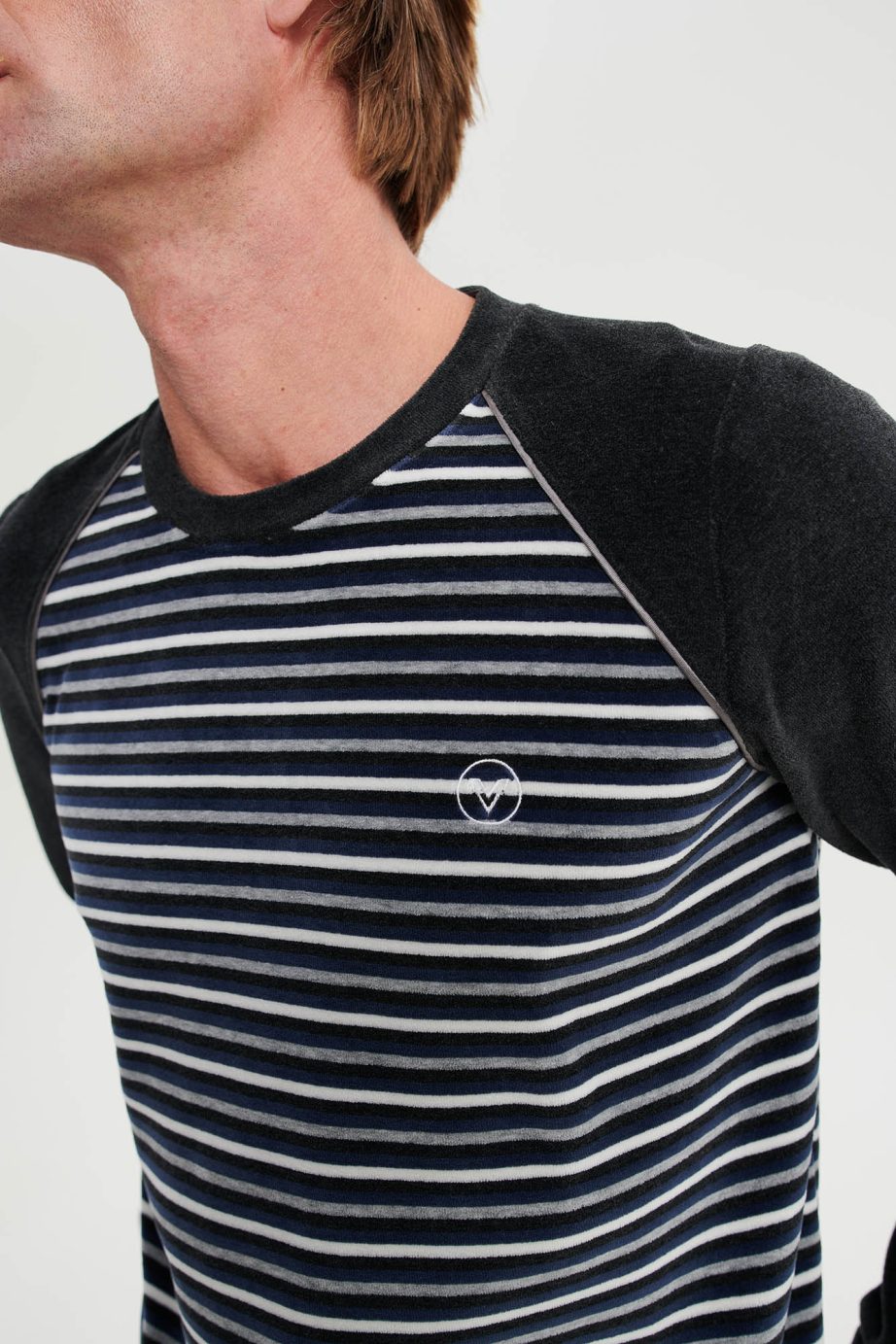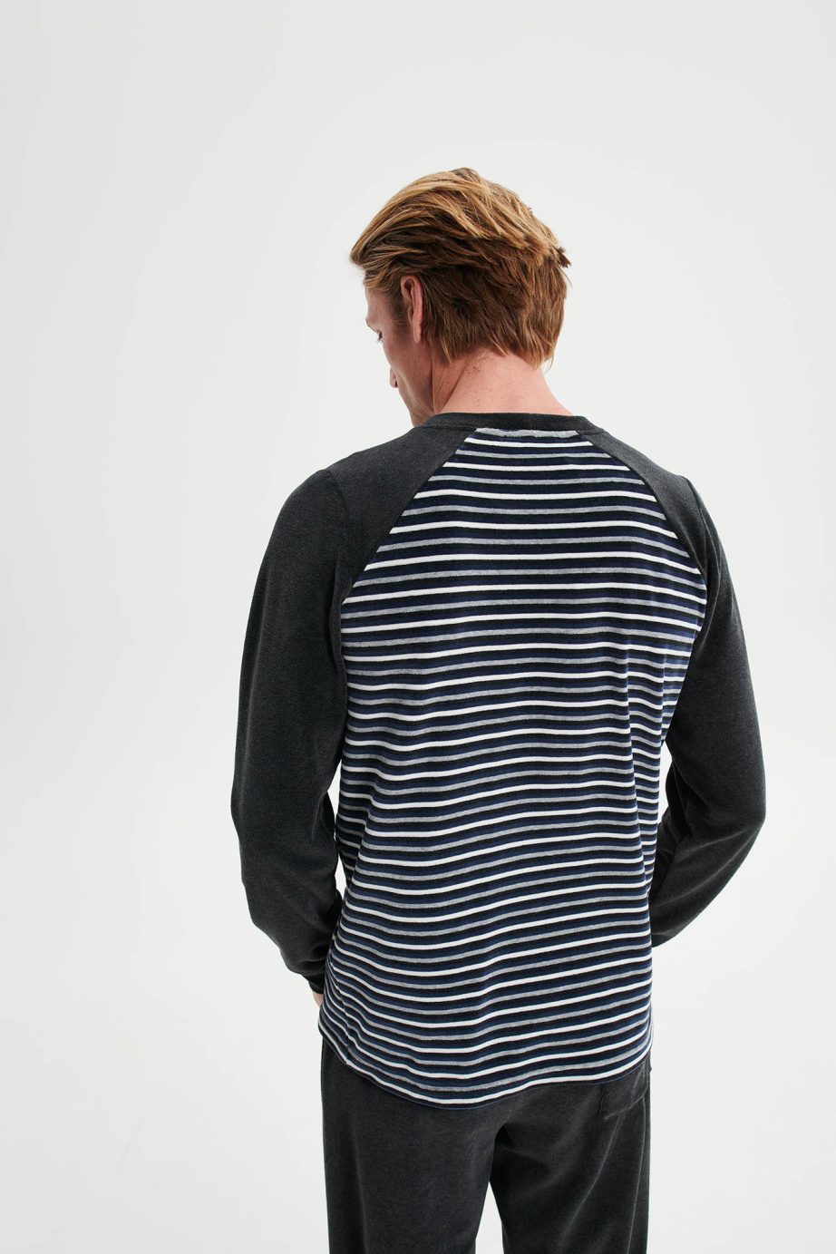 Мъжка пижама с кръгло деколте, гладки панталони с маншети и раиран топ с маншети. Удобно предложение от материя с кадифено покритие на допир за студените зимни дни.