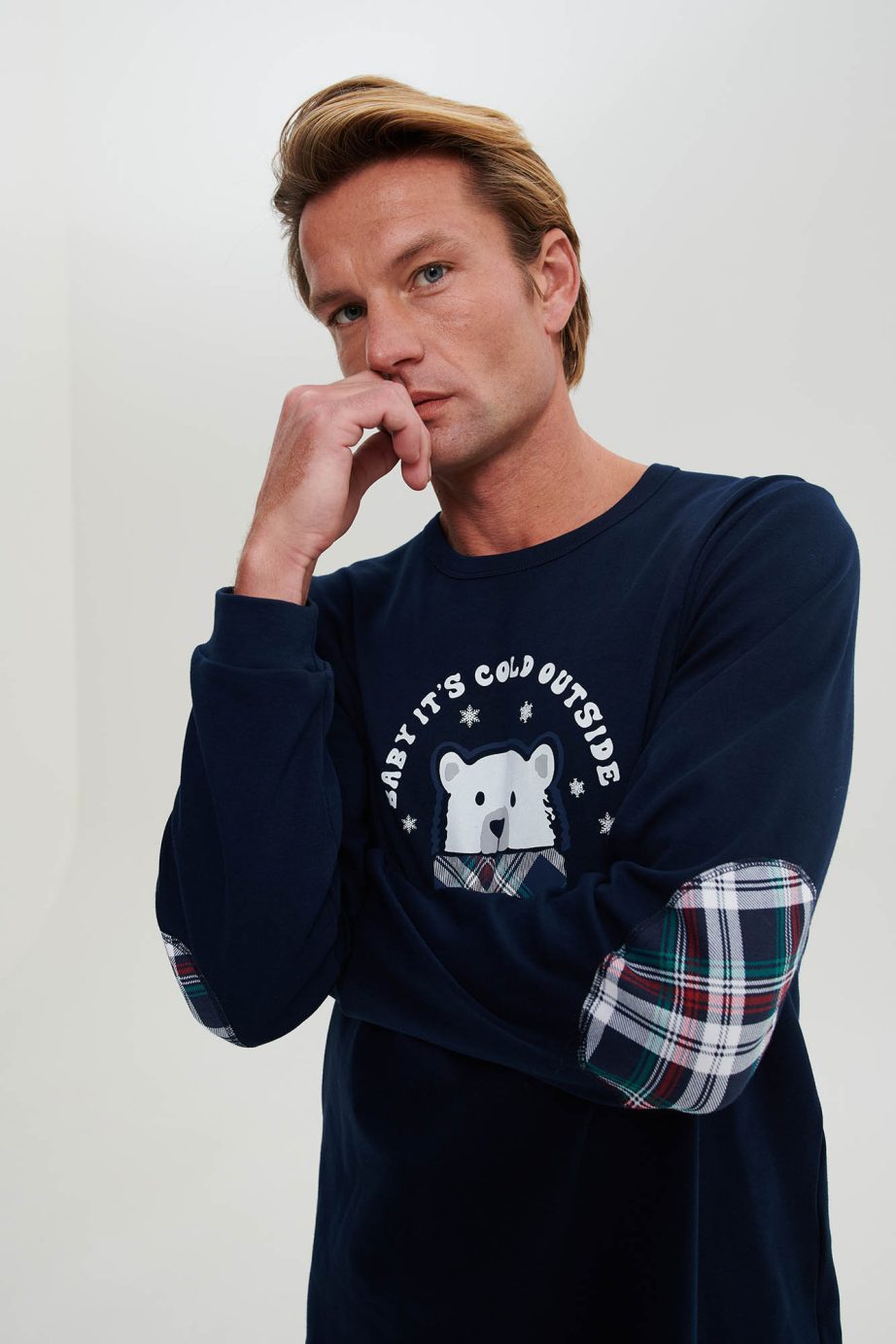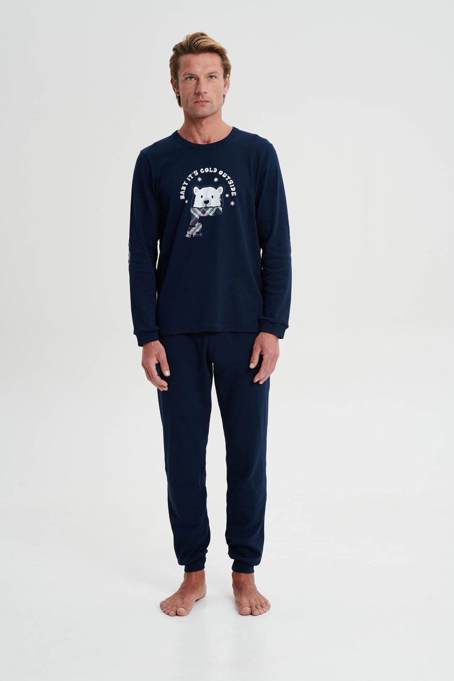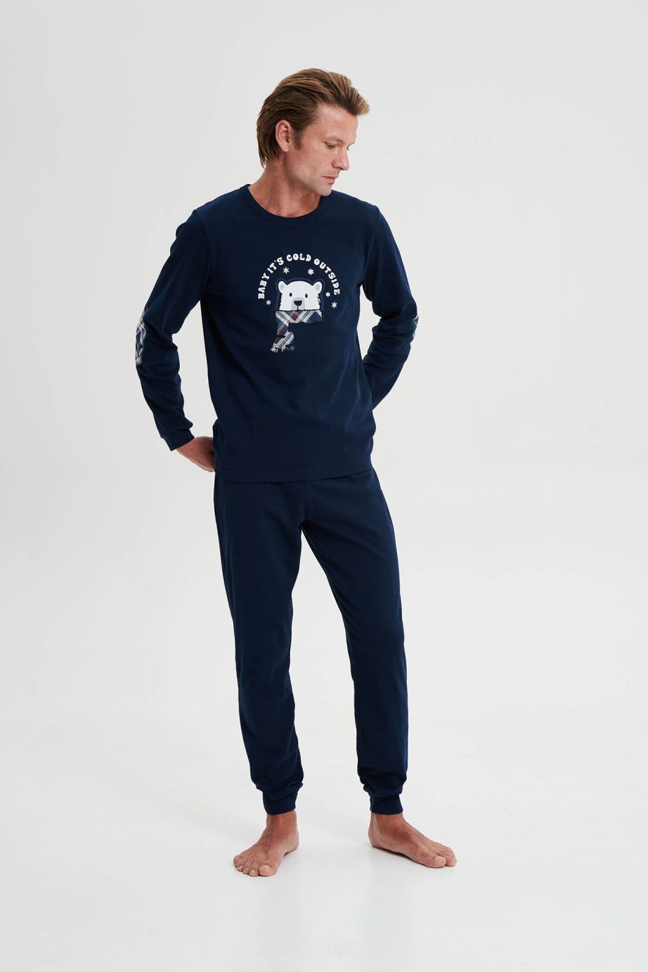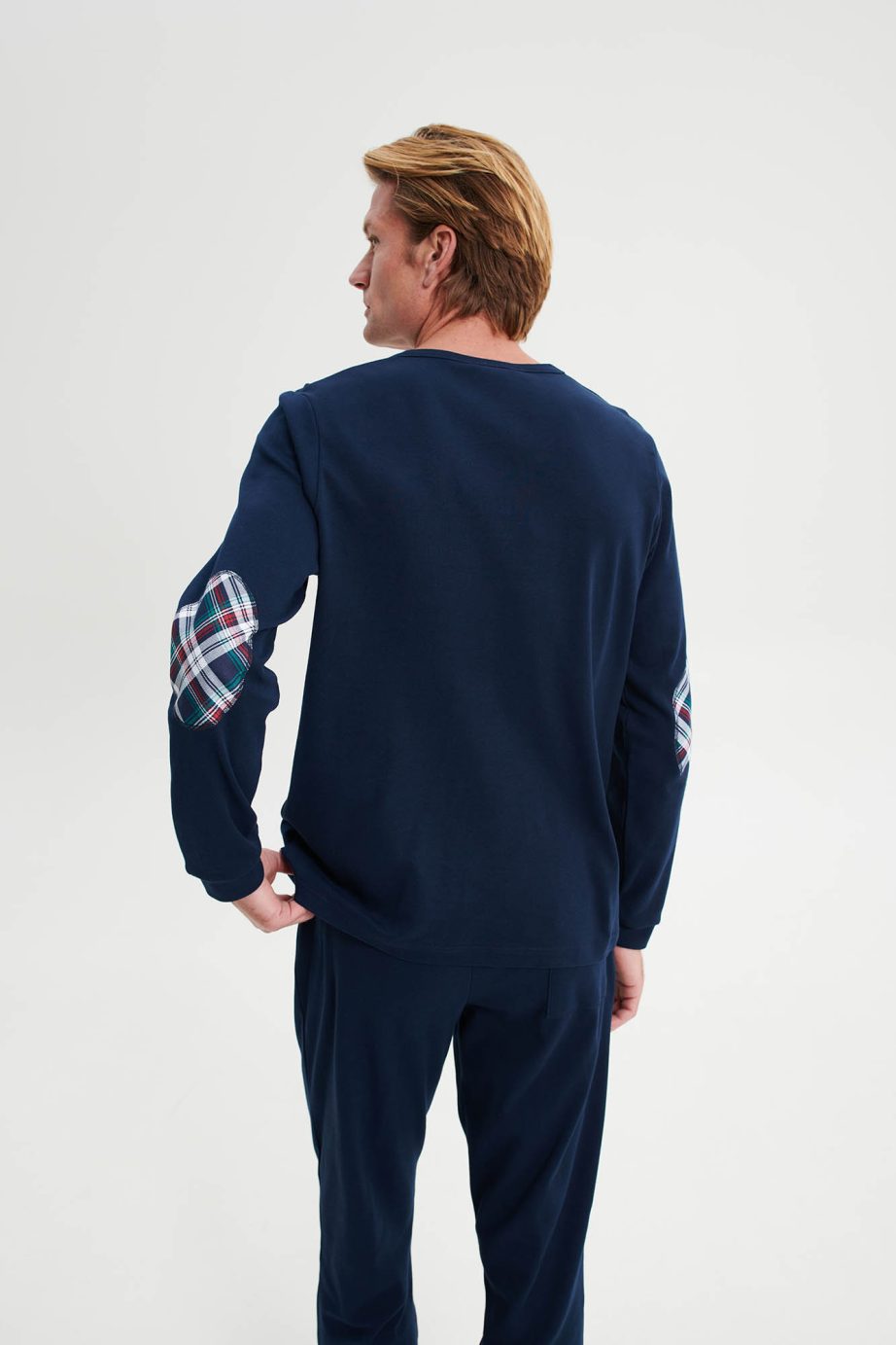 Мъжка пижама с кръгло деколте, ръкави с маншети и обикновени панталони с маншети. Приятно, памучно предложение, на което ще се наслаждавате през целия ден.