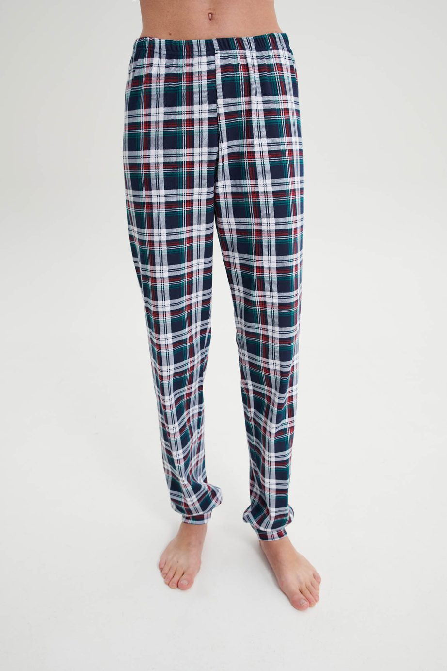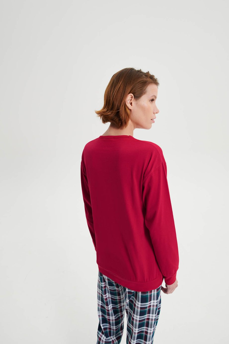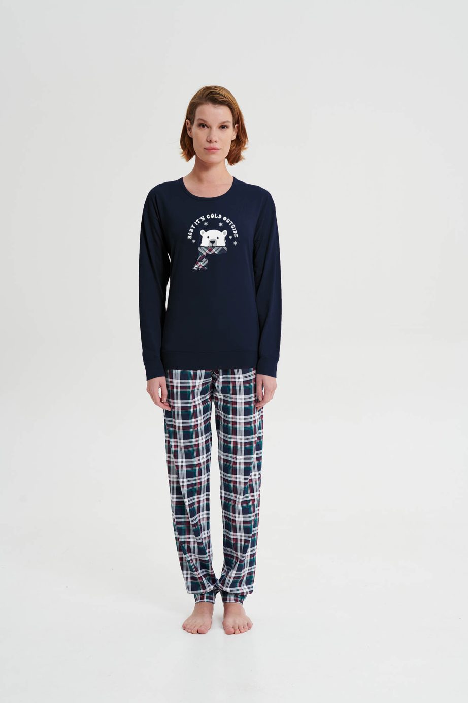 Дамска пижама с кръгло деколте, ръкави с маншети и панталони с маншети. Приятно, памучно предложение, на което ще се наслаждавате през целия ден.