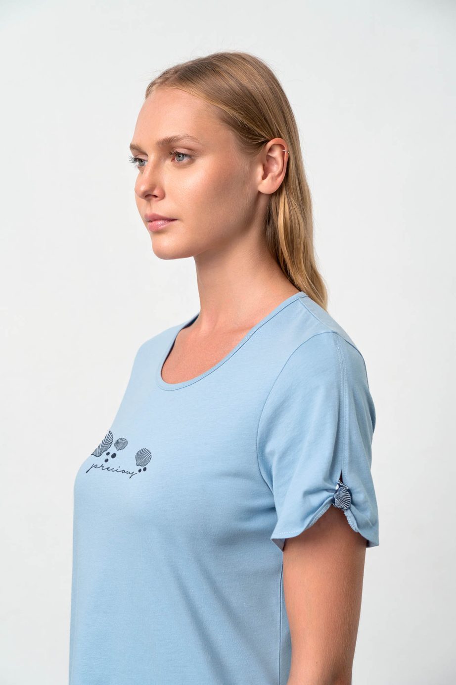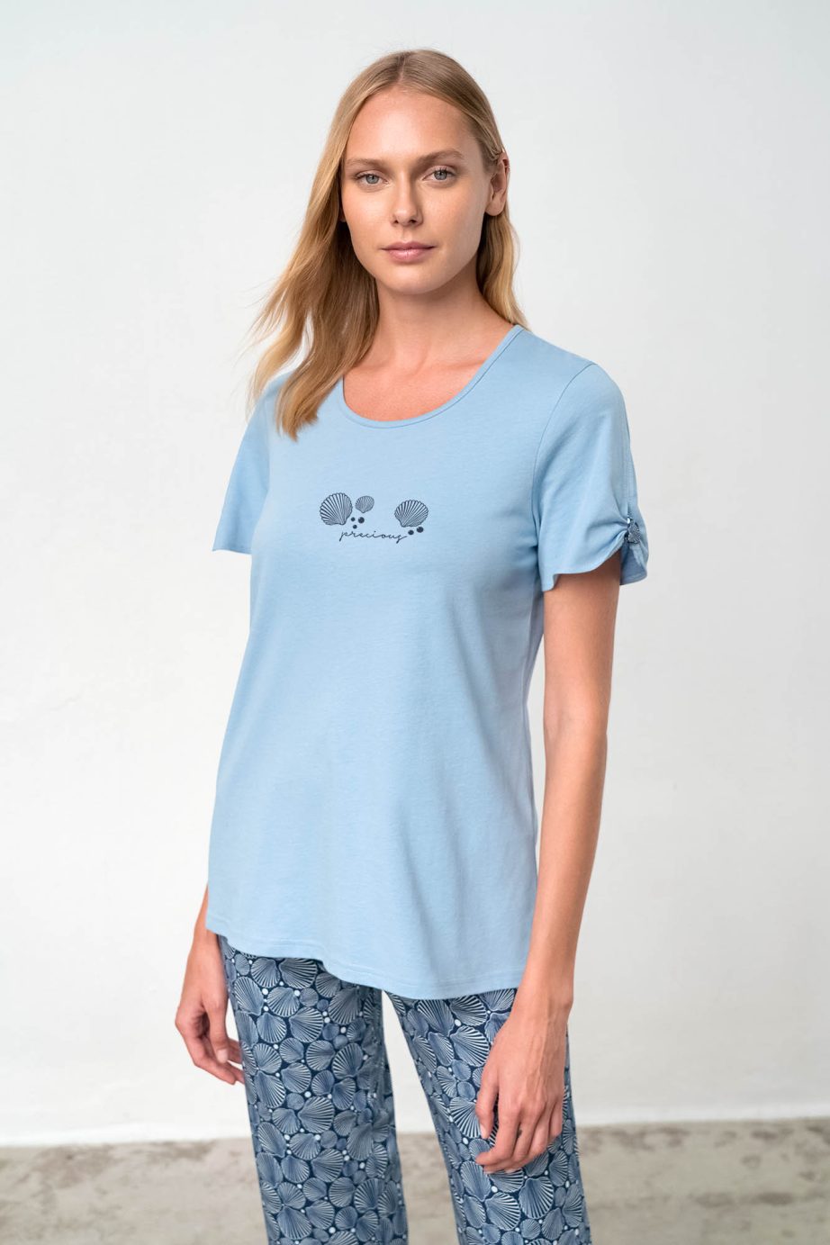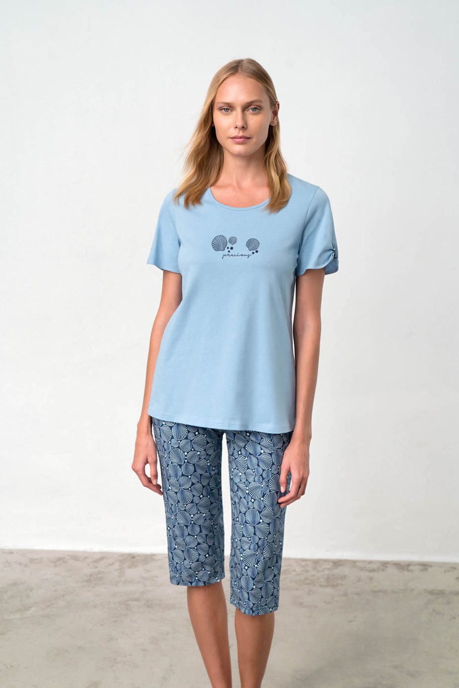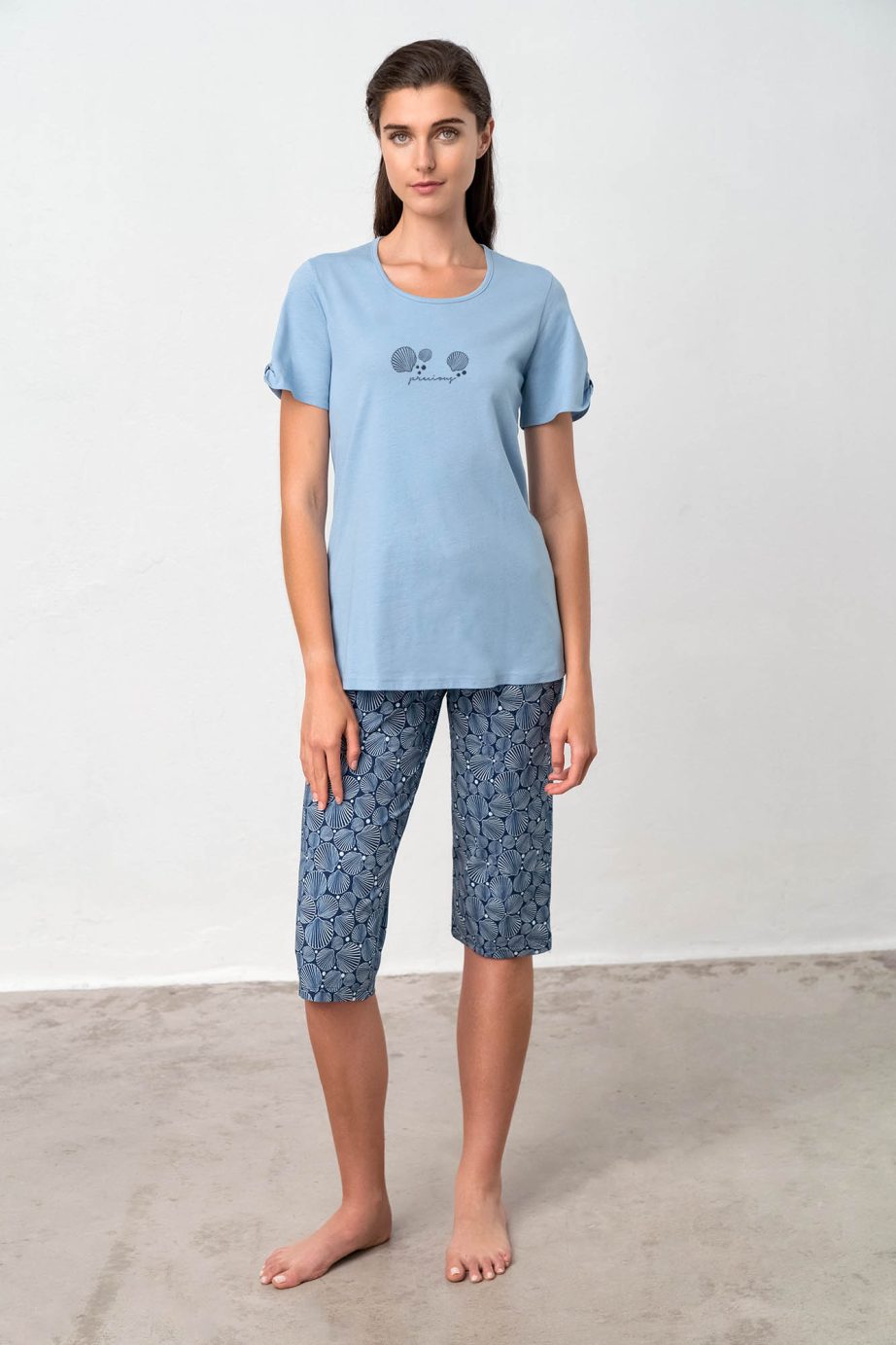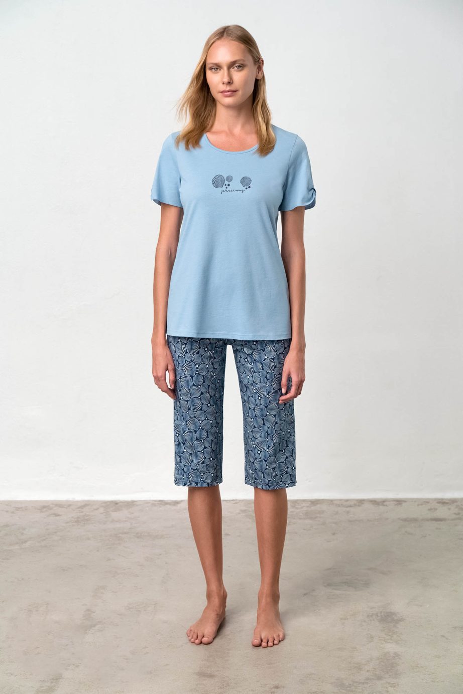 Дамска пижама с къс ръкав, кръгло деколте и принт, капри панталон. Прохладно предложение в сини нюанси, което ще носите през цялото лято.